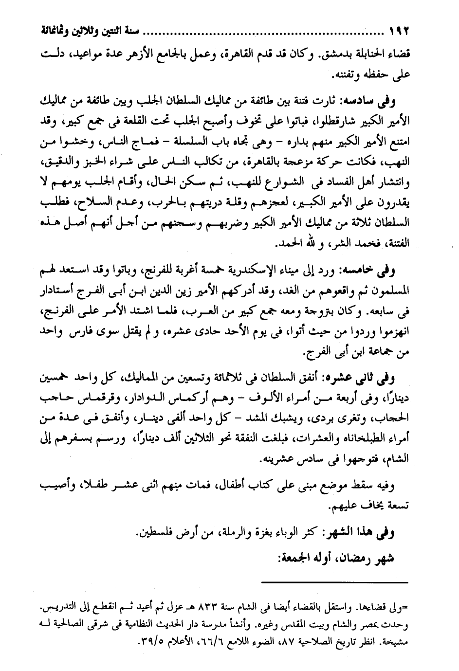 قَضَاء الْحَنَابِلَة بِدِمَشْق. وَكَانَ قد قدم الْقَاهِرَة وَعمل بالجامع الْأَزْهَر عدَّة مواعيد دلّت على حفظه وتفننه. وَفِي سادسه: ثارت فتْنَة بَين طَائِفَة من مماليك السُّلْطَان الجلب وَبَين طَائِفَة من مماليك الْأَمِير الْكَبِير شارقطلوا فَبَاتُوا على تخوف وَأصْبح الجلب تَحت القلعة فِي جمع كَبِير وَقد امْتنع الْأَمِير الْكَبِير مِنْهُم بداره - وَهِي تجاه بَاب السلسلة - فماج النَّاس وخشوا من النهب فَكَانَت حَرَكَة مزعجة بِالْقَاهِرَةِ من تكالب النَّاس على شِرَاء الْخبز والدقيق وانتشار أهل الْفساد فِي الشوارع للنهب ثمَّ سكن الْحَال وَأقَام الجلب يومهم لَا يقدرُونَ على الْأَمِير الْكَبِير لعجزهم وَقلة دريتهم بِالْحَرْبِ وَعدم السِّلَاح فَطلب السُّلْطَان ثَلَاثَة من مماليك الْأَمِير الْكَبِير وضربهم وسجنهم من أجل أَنهم أصل هَذِه الْفِتْنَة فخمد الشَّرّ وَللَّه الْحَمد. وَفِي خامسه: ورد إِلَى ميناء الْإسْكَنْدَريَّة خَمْسَة أغربة للفرنج وَبَاتُوا وَقد استعد لَهُم الْمُسلمُونَ ثمَّ واقعوهم من الْغَد وَقد أدركهم الْأَمِير زين الدّين ابْن أبي الْفرج أستادار فِي سابعه. وَكَانَ بتروجة وَمَعَهُ جمع كَبِير من الْعَرَب فَلَمَّا اشْتَدَّ الْأَمر على الفرنج انْهَزمُوا وردوا من حَيْثُ أَتَوا فِي يَوْم الْأَحَد حادي عشره وَلم يقتل سوى فَارس وَاحِد من جمَاعَة ابْن أبي الْفرج. وَفِي ثَانِي عشره: أنْفق السُّلْطَان فِي ثَلَاثمِائَة وَتِسْعين من المماليك كل وَاحِد خمسين دِينَارا وَفِي أَرْبَعَة من أُمَرَاء الألوف - وهم أركماس الدوادار وقرقماس حاحب الْحجاب وتغري بردي ويشبك المشد - كل وَاحِد ألفي دِينَار وَأنْفق فِي عدَّة من أُمَرَاء الطبلخاناه والعشرات فبلغت النَّفَقَة نَحْو الثَّلَاثِينَ ألف دِينَارا ورسم بسفرهم إِلَى الشَّام فتوجهوا فِي سادس عشرينه. وَفِيه سقط مَوضِع مَبْنِيّ على كتاب أَطْفَال فَمَاتَ مِنْهُم اثْنَي عشر طفْلا وَأُصِيب تِسْعَة يخَاف عَلَيْهِم. وَفِي هَذَا الشَّهْر: كثر الوباء بغزة والرملة، من أَرض فلسطين. شهر رَمَضَان أَوله الْجُمُعَة: