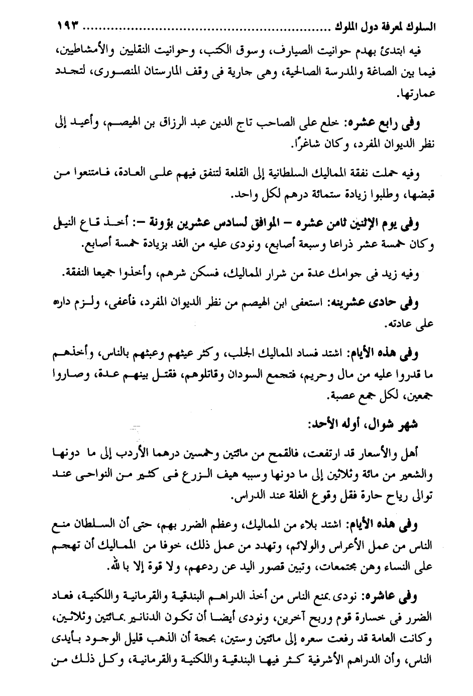 فِيهِ ابتدئ بهدم حوانيت الصيارف وسوق الْكتب وحوانيت النقليين والأمشاطيين فِيمَا بَين الصاغة والمدرسة الصالحية وَهِي جَارِيَة فِي وقف المارستان المنصوري لتجدد عمارتها. وَفِي رَابِع عشره: خلع على الصاحب تَاج الدّين عبد الرَّزَّاق بن الهيصم وأعيد نظر الدِّيوَان الْمُفْرد وَكَانَ شاغراً. وَفِيه حملت نَفَقَة المماليك السُّلْطَانِيَّة إِلَى القلعة لتنفق فيهم على الْعَادة فامتنعوا من قبضهَا وطلبوا زِيَادَة سِتّمائَة دِرْهَم لكل وَاحِد. وَفِي يَوْم الِاثْنَيْنِ ثامن عشره - الْمُوَافق لسادس عشْرين بؤونة -: أَخذ قاع النّيل وَكَانَ خَمْسَة عشر ذِرَاعا وَسَبْعَة أَصَابِع وَنُودِيَ عَلَيْهِ من الْغَد بِزِيَادَة خَمْسَة أَصَابِع. وَفِيه زيد فِي جوامك عدَّة من شرار المماليك فسكن شرهم وَأخذُوا جَمِيعًا النَّفَقَة. وَفِي حادي عشرينه: استعفي ابْن الهيصم من نظر الدِّيوَان الْمُفْرد فأعفي وَلزِمَ على عَادَته. وَفِي هَذِه الْأَيَّام: اشْتَدَّ فَسَاد المماليك الجلب وَكثر عيثهم وعبثهم بِالنَّاسِ وَأَخذهم مَا قدرُوا عَلَيْهِ من مَال وحريم فتجمع السودَان وقاتلوهم فَقتل بَينهم عدَّة وصاروا جمعين لكل جمع عصبَة. شهر شَوَّال أَوله الْأَحَد: أهل والأسعار قد ارْتَفَعت فالقمح من مِائَتَيْنِ وَخمسين درهما الأردب إِلَى مَا دونهَا وَالشعِير من مائَة وَثَلَاثِينَ إِلَى مَا دونهَا وَسَببه هيف الزَّرْع فِي كثير من النواحي عِنْد توالي ريَاح حارة فَقل وُقُوع الْغلَّة عِنْد الدراس. وَفِي هَذِه الْأَيَّام: اشْتَدَّ بلَاء من الممالك وَعظم الضَّرَر بهم حَتَّى أَن السُّلْطَان منع النَّاس من عمل الأعراس والولائم وتهدد من عمل ذَلِك خوفًا من المماليك أَن تهجم على النِّسَاء وَهن مجتمعات وَتبين قُصُور الْيَد عَن ردعهم وَلَا قُوَّة إِلَّا بِاللَّه. وَفِي عاشره: نُودي بِمَنْع النَّاس من أَخذ الدَّرَاهِم البندقية والقرمانية واللكنية فَعَاد الضَّرَر فِي خسارة قوم وَربح آخَرين وَنُودِيَ أَيْضا أَن تكون الدَّنَانِير بمائتين وَثَلَاثِينَ وَكَانَت الْعَامَّة قد رفعت سعره إِلَى مِائَتَيْنِ وَسِتِّينَ بِحجَّة أَن الذَّهَب قَلِيل الْوُجُود بأيدي النَّاس وَأَن الدَّرَاهِم الأشرفية كثر فِيهَا البندقية واللكنية والقرمانية وكل ذَلِك من