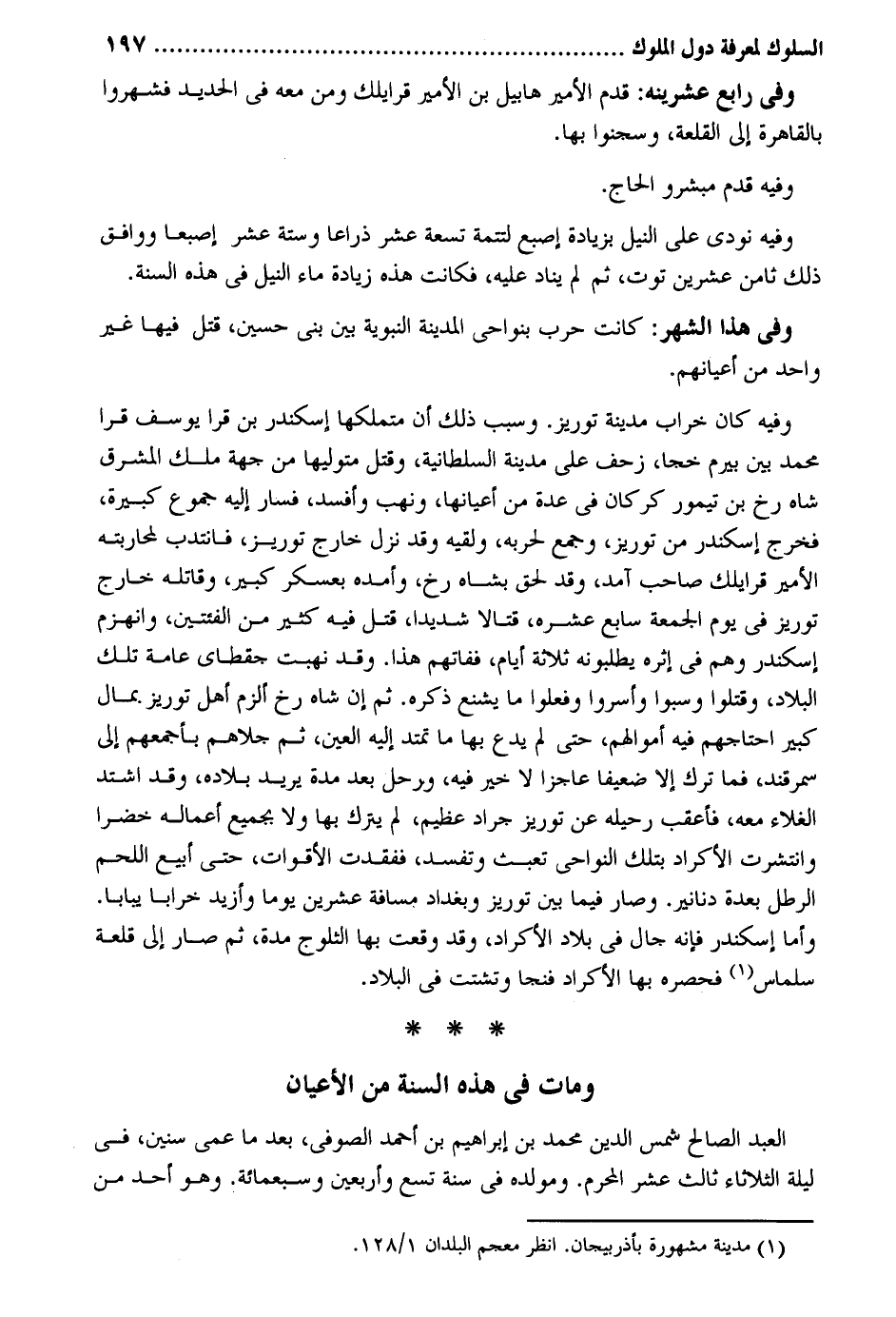 وَفِي رَابِع عشرينه: قدم الْأَمِير هابيل بن الْأَمِير قرا يلك وَمن مَعَه فِي الْحَدِيد فشهروا بِالْقَاهِرَةِ إِلَى القلعة وسجنوا بهَا. وَفِيه قدم مبشرو الْحَاج. وَفِيه نُودي على النّيل بِزِيَادَة إِصْبَع لتتمة تِسْعَة عشر ذِرَاعا وَسِتَّة عشر إصبعاً وَوَافَقَ ذَلِك ثامن عشْرين توت ثمَّ لم يناد عَلَيْهِ فَكَانَت هَذِه زِيَادَة مَاء النّيل فِي هَذِه السّنة. وَفِي هَذَا الشَّهْر: كَانَت حَرْب بنواحي الْمَدِينَة النَّبَوِيَّة بَين بني حُسَيْن قتل فِيهَا غير وَاحِد من أعيانهم. وَفِيه كَانَ خراب مَدِينَة توريز. وَسبب ذَلِك أَن متملكها اسكندر بن قرا يُوسُف قرا مُحَمَّد بَين بيرم خجا زحف على مَدِينَة السُّلْطَانِيَّة وَقتل متوليها من جِهَة ملك الْمشرق شاه رخ بن تيمور كركان فِي عدَّة من أعيانها وَنهب وأفسد فَسَار إِلَيْهِ جموع كَبِيرَة فَخرج اسكندر من توريز وَجمع لحربه ولقيه وَقد نزل خَارج توريز فَانْتدبَ لمحاربته الْأَمِير قرا يلك صَاحب آمد وَقد لحق بشاه رخ وأمده بعسكر كَبِير وقاتله خَارج توريز فِي يَوْم الْجُمُعَة سَابِع عشره قتالاً شَدِيدا قتل فِيهِ كثير من الفئتين وَانْهَزَمَ اسكندر وهم فِي إثره يطلبونه ثَلَاثَة أَيَّام ففاتهم هَذَا. وَقد نهبت جقطاي عَامَّة تِلْكَ الْبِلَاد وَقتلُوا وَسبوا وأسروا وفعلوا مَا يشنع ذكره. ثمَّ إِن شاه رخ ألزم أهل توريز بِمَال كَبِير احتاجهم فِيهِ أَمْوَالهم حَتَّى لم يدع بهَا مَا تمتد إِلَيْهِ الْعين ثمَّ جلاهم بأجمعهم إِلَى سَمَرْقَنْد فَمَا ترك إِلَّا ضَعِيفا عَاجِزا لَا خير فِيهِ ورحل بعد مُدَّة يُرِيد بِلَاده وَقد اشْتَدَّ الغلاء مَعَه فأعقب رحيله عَن توريز جَراد عَظِيم لم يتْرك بهَا وَلَا بِجَمِيعِ أَعماله خضرًا وانتشرت الأكراد بِتِلْكَ النواحي تعبث وتفسد ففقدت الأقوات حَتَّى أبيع اللَّحْم الرطل بعده دَنَانِير. وَصَارَ فِيمَا بَين توريز وبغداد مَسَافَة عشْرين يَوْمًا وأزيد خراباً يباباً وَأما اسكندر فَإِنَّهُ جال فِي بِلَاد الأكراد وَقد رقعت بهَا الثلوج مُدَّة ثمَّ صَار إِلَى قلعة سلماس فحصره بهَا الأكراد فنجا وتشتت فِي الْبِلَاد. وَمَات فِي هَذِه السّنة من الْأَعْيَان العَبْد الصَّالح شمس الدّين مُحَمَّد بن إِبْرَاهِيم بن أَحْمد الصُّوفِي بعد مَا عمي سِنِين فِي لَيْلَة الثُّلَاثَاء ثَالِث عشر الْمحرم. ومولده فِي سنة تسع وَأَرْبَعين وَسَبْعمائة. وَهُوَ أحد من