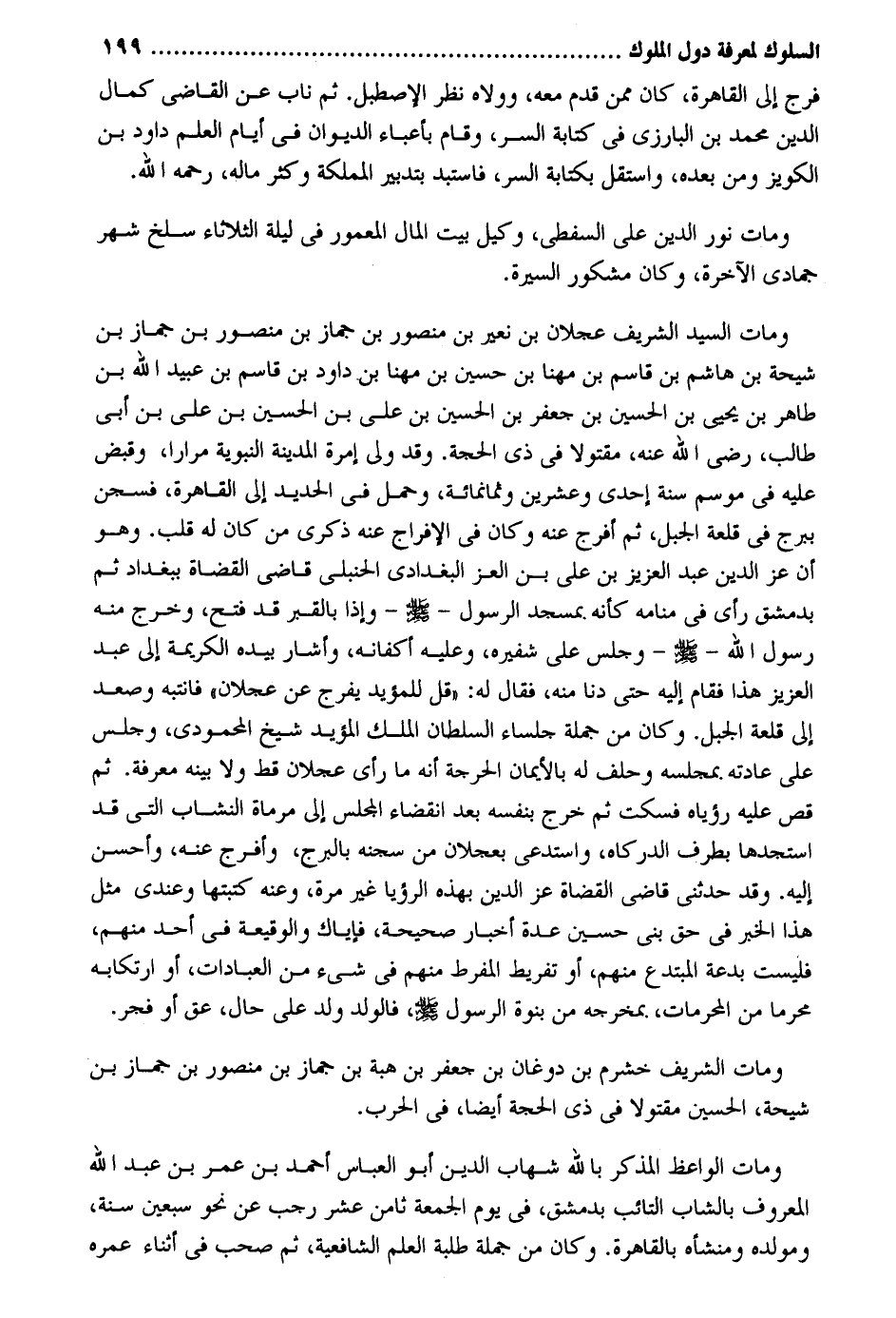فرج إِلَى الْقَاهِرَة كَانَ مِمَّن قدم مَعَه وولاه نظر الاصطبل. ثمَّ نَاب عَن القَاضِي كَمَال الدّين مُحَمَّد بن الْبَارِزِيّ فِي كِتَابَة السِّرّ وَقَامَ بأعباء الدِّيوَان فِي أَيَّام الْعلم دَاوُد بن الكويز وَمن بعده واستقل بِكِتَابَة السِّرّ فاستبد بتدبير المملكة وَكثر مَاله رَحمَه الله. وَمَات نور الدّين عَليّ السفطي وَكيل بَيت المَال الْمَعْمُور فِي لَيْلَة وَمَات السَّيِّد الشريف عجلَان بن نعير بن مَنْصُور بن جماز بن مَنْصُور بن جماز بن شيحة بن هَاشم بن قَاسم بن مهنا بن حُسَيْن بن مهنا بن دَاوُد بن قَاسم بن عبيد الله بن طَاهِر بن يحيى بن الْحُسَيْن بن جَعْفَر بن الْحُسَيْن بن عَليّ بن الْحُسَيْن بن عَليّ بن أَبُو طَالب رَضِي الله عَنهُ مقتولا فِي ذِي الْحجَّة. وَقد ولي إمرة الْمَدِينَة النَّبَوِيَّة مرَارًا وَقبض عَلَيْهِ فِي موسم سنة إِحْدَى وَعشْرين وَثَمَانمِائَة وَحمل فِي الْحَدِيد إِلَى الْقَاهِرَة فسجن ببرج فِي قلعة الْجَبَل ثمَّ أفرج عَنهُ وَكَانَ فِي الإفراج عَنهُ ذكرى من كَانَ لَهُ قلب. وهم أَن عز الدّين عبد الْعَزِيز بن عَليّ بن الْعِزّ الْبَغْدَادِيّ الْحَنْبَلِيّ قَاضِي الْقُضَاة بِبَغْدَاد ثمَّ بِدِمَشْق رأى فِي مَنَامه كَأَنَّهُ بِمَسْجِد الرَّسُول - صلى الله عَلَيْهِ وَسلم - وَإِذا بالقبر قد فتح وَخرج مِنْهُ رَسُول الله - صلى الله عَلَيْهِ وَسلم - وَجلسَ على شفيره وَعَلِيهِ أَكْفَانه وَأَشَارَ بِيَدِهِ الْكَرِيمَة إِلَى عبد الْعَزِيز هَذَا فَقَامَ إِلَيْهِ حَتَّى دنا مِنْهُ فَقَالَ لَهُ: قل للمؤيد يفرج عَن عجلَان فانتبه وَصعد إِلَى قلعة الْجَبَل. وَكَانَ من جملَة جلساء السُّلْطَان الْملك الْمُؤَيد شيخ المحمودي وَجلسَ على عَادَته بمجلسه وَحلف لَهُ بالأيمان الحرجة أَنه مَا رأى عجلَان قطّ وَلَا بَينه معرفَة. ثمَّ قصّ عَلَيْهِ رُؤْيَاهُ فَسكت ثمَّ خرج بِنَفسِهِ بعد انْقِضَاء الْمجْلس إِلَى مرماة النشاب الَّتِي قد استجدها بِطرف الدركاه واستدعى بعجلان من سجنه بالبرج وَأَفْرج عَنهُ وَأحسن إِلَيْهِ. وَقد حَدثنِي قَاضِي الْقُضَاة عز الدّين بِهَذِهِ الرُّؤْيَا غير مرّة وَعنهُ كتبتها وَعِنْدِي مثل هَذَا الْخَبَر فِي حق بني حُسَيْن عدَّة أَخْبَار صَحِيحَة فإياك والوقيعة فِي أحد مِنْهُم فَلَيْسَتْ بِدعَة المبتدع مِنْهُم أَو تَفْرِيط المفرط مِنْهُم فِي شَيْء من الْعِبَادَات أَو ارتكابه محرما من الْمُحرمَات بمخرجه من بنوة الرَّسُول صلى الله عَلَيْهِ وَسلم فَالْوَلَد ولد على حَال عق أَو فجر. وَمَات الشريف خشرم بن دوغان بن جَعْفَر بن هبة بن جماز بن مَنْصُور بن جماز بن شيحة الْحُسَيْن مقتولاً فِي ذِي الْحجَّة أَيْضا فِي الْحَرْب. وَمَات الْوَاعِظ الْمُذكر بِاللَّه شهَاب الدّين أَبُو الْعَبَّاس أَحْمد بن عمر بن عبد الله الْمَعْرُوف بالشاب التائب بِدِمَشْق فِي يَوْم الْجُمُعَة ثامن عشر رَجَب عَن نَحْو سبعين سنة ومولده ومنشأه بِالْقَاهِرَةِ. وَكَانَ من جملَة طلبة الْعلم الشَّافِعِيَّة ثمَّ صحب فِي أثْنَاء عمره