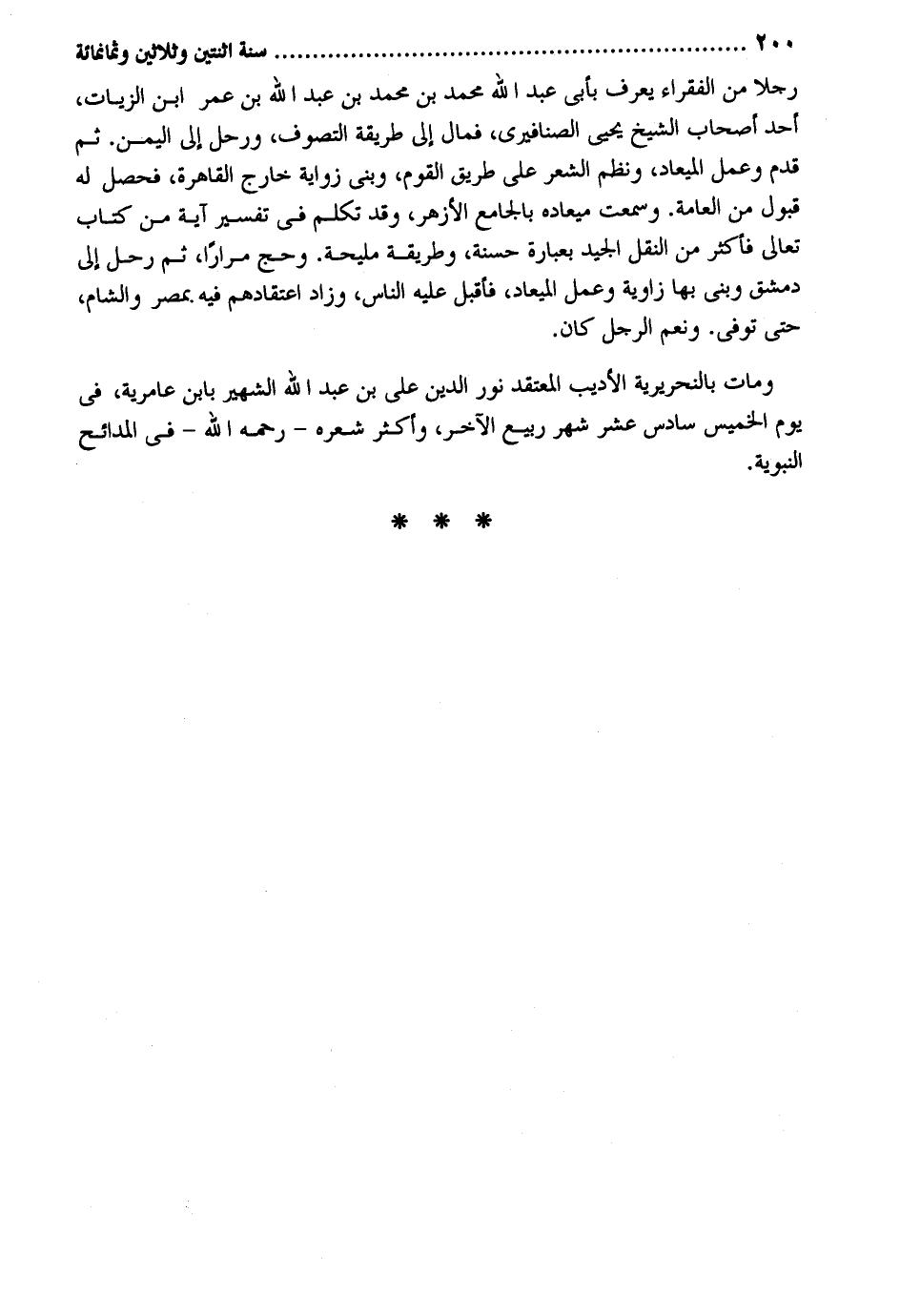 رجلا من الْفُقَرَاء يعرف بِأبي عبد الله مُحَمَّد بن مُحَمَّد بن عبد الله بن عمر ابْن الزياب أحد أَصْحَاب الشَّيْخ يحيى الصنافيري فَمَال إِلَى طَريقَة التصوف ورحل إِلَى الْيمن. ثمَّ قدم وَعمل الميعاد ونظم الشّعْر على طَرِيق الْقَوْم وَبنى زواية خَارج الْقَاهِرَة فَحصل لَهُ قبُول من الْعَامَّة. وَسمعت ميعاده بالجامع الْأَزْهَر وَقد تكلم فِي تَفْسِير آيَة من كتاب تَعَالَى فَأكْثر من النَّقْل الْجيد بِعِبَارَة حَسَنَة وَطَرِيقَة مليحة. وَحج مرَارًا ثمَّ رَحل إِلَى دمشق وَبنى بهَا زَاوِيَة وَعمل الميعاد فَأقبل عَلَيْهِ النَّاس وَزَاد اعْتِقَادهم فِيهِ بِمصْر وَالشَّام حَتَّى توفّي. وَنعم الرجل كَانَ. وَمَات بالنحريرية الأديب المعتقد نور الدّين عَليّ بن عبد الله الشهير بِابْن عامرية فِي يَوْم الْخَمِيس سادس عشر شهر ربيع الآخر وَأكْثر شعره - رَحمَه الله - فِي المدائح النَّبَوِيَّة.