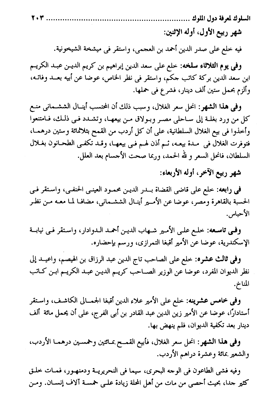 شهر ربيع الأول أَوله الِاثْنَيْنِ: فِيهِ خلع على صدر الدّين أَحْمد بن العجمي وَاسْتقر فِي ميشخة الشيخونية. وَفِي يَوْم الثُّلَاثَاء سلخه: خلع على سعد الدّين إِبْرَاهِيم بن كريم الدّين عبد الْكَرِيم ابْن سعد الدّين بركَة كَاتب جكم وَاسْتقر فِي نظر الْخَاص عوضا عَن أَبِيه بعد وَفَاته وألزم بِحمْل سِتِّينَ ألف دِينَار فشرع فِي حملهَا. وَفِي هَذَا الشَّهْر: انحل سعر الغلال وَسبب ذَلِك أَن الْمُحْتَسب أينال الششماني منع كل من ورد بغلة إِلَى ساحلي مصر وبولاق من بيعهَا وتشدد فِي ذَلِك فامتنعوا وَأخذُوا فِي بيع الغلال السُّلْطَانِيَّة على أَن كل أردب من الْقَمْح بثلاثمائة وَسِتِّينَ درهما فتوفرت الغلال فِي مُدَّة بَيْعه ثمَّ أذن لَهُم فِي بيعهَا وَقد تَكْفِي الطحانون بغلال السُّلْطَان فانحل السّعر وَللَّه الْحَمد وَرُبمَا صحت الْأَجْسَام بعد الْعِلَل. شهر ربيع الآخر أَوله الْأَرْبَعَاء: فِي رابعه: خلع على قَاضِي الْقُضَاة بدر الدّين مَحْمُود الْعَيْنِيّ الْحَنَفِيّ وَاسْتقر فِي الْحِسْبَة بِالْقَاهِرَةِ ومصر عوضا عَن الْأَمِير أينال الششماني مُضَافا لما مَعَه من نظر الأحباس. وَفِي تاسعه: خلع على الْأَمِير شهَاب الدّين أَحْمد الدوادار وَاسْتقر فِي نِيَابَة الْإسْكَنْدَريَّة وَفِي ثَالِث عشره: خلع على الصاحب تَاج الدّين عبد الرَّزَّاق بن الهيصم وأعيد إِلَى نظر الدِّيوَان الْمُفْرد عوضا عَن الْوَزير الصاحب كريم الدّين عبد الْكَرِيم ابْن كَاتب المناخ وَفِي خَامِس عشرينه: خلع على الْأَمِير عَلَاء الدّين أقبغا الجمالي الكاشف وَاسْتقر أستاداراً عوضا عَن الْأَمِير زين الدّين عبد الْقَادِر بن أبي الْفرج على أَن يحمل مائَة ألف دِينَار بعد تكفية الدِّيوَان فَلم ينْهض بهَا. وَفِي هَذَا الشَّهْر: انحل سعر الغلال فأبيع الْقَمْح بمائتين وَخمسين درهما الأردب وَالشعِير بِمِائَة وَعشرَة دَرَاهِم الأردب. وَفِيه فشى الطَّاعُون فِي الْوَجْه البحري سِيمَا فِي التحريرية ودمنهور فَمَاتَ خلق كثير جدا بِحَيْثُ أحصي من مَاتَ من أهل الْمحلة زِيَادَة على خَمْسَة آلَاف إِنْسَان. وَمن