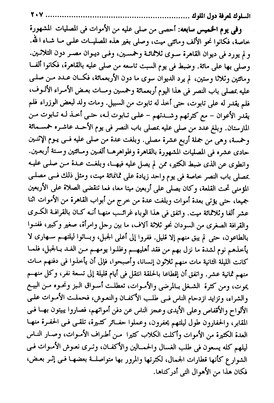 وَفِي يَوْم الْخَمِيس سابعه: أحصي من صلى عَلَيْهِ من الْأَمْوَات فِي الْمُصَليَات الْمَشْهُورَة خَاصَّة فَكَانُوا نَحْو الْألف ومائتي ميت وَصلى بِغَيْر هَذِه الْمُصَليَات على مَا شَاءَ الله. وَلم يُورد فِي ديوَان الْقَاهِرَة سوى ثَلَاثمِائَة وَخمسين وَفِي ديوَان مصر دون الثَّلَاثِينَ. وَصلى بهَا على مائَة. وَضبط فِي يَوْم السبت تاسعه من صلى عَلَيْهِ بِالْقَاهِرَةِ فَكَانُوا ألفا وَمِائَتَيْنِ وَثَلَاثًا وَسِتِّينَ لم يرد الدِّيوَان سوى مَا دون الأربعمائة فَكَانَ عدد من صلى عَلَيْهِ بمصلى بَاب النَّصْر فِي هَذَا الْيَوْم أَرْبَعمِائَة وَخمسين وَمَات بعض الْأُمَرَاء الألوف فَلم يقدر لَهُ على تَابُوت حَتَّى أَخذ لَهُ تَابُوت من السَّبِيل. وَمَات ولد لبَعض الوزراء فَلم يقدر الأعوان - مَعَ كثرتهم وشدتهم - على تَابُوت لَهُ حَتَّى أَخذ لَهُ تَابُوت من المارستان. وَبلغ عدد من صلى عَلَيْهِ بمصلى بَاب النَّصْر فِي يَوْم الْأَحَد عاشره خَمْسمِائَة وَخَمْسَة وَهِي من جملَة أَربع عشرَة مصلى. وَبَلغت عدَّة من صلى عَلَيْهِ فِي يَوْم الِاثْنَيْنِ حادي عشره فِي الْمُصَليَات الْمَشْهُورَة بِالْقَاهِرَةِ وظواهرها أَلفَيْنِ وَمِائَتَيْنِ وَسِتَّة أَرْبَعِينَ. وانطوى عَن الَّذِي ضبط الْكثير مِمَّن لم يصل عَلَيْهِ فِيهَا وَبَلغت عدَّة من صلى عَلَيْهِ فِيهَا وَبَلغت عدَّة من صلى عَلَيْهِ بمصلى بَاب النَّصْر خَاصَّة فِي يَوْم وَاحِد زِيَادَة على ثَمَانمِائَة ميت وَمثل ذَلِك فِي مصلى المؤمني تَحت القلعة وَكَانَ يُصَلِّي على أَرْبَعِينَ مَيتا مَعًا فَمَا تَنْقَضِي الصَّلَاة على الْأَرْبَعين جَمِيعًا حَتَّى يُؤْتِي بعدة أموات وَبَلغت عدَّة من خرج من أَبْوَاب الْقَاهِرَة من الْأَمْوَات اثْنَا عشر ألفا وثلاثمائة ميت. وَاتفقَ فِي هَذَا الوباء غرائب مِنْهَا أَنه كَانَ بالقرافة الْكُبْرَى والقرافة الصُّغْرَى من السودَان نَحْو ثَلَاثَة آلَاف مَا بَين رجل وَامْرَأَة صَغِير وكبير ففنوا بالطاعون حَتَّى لم يبْق مِنْهُم إِلَّا قَلِيل. فَفرُّوا إِلَى أَعلَى الْجَبَل وَبَاتُوا ليلتهم سهارى لَا يَأْخُذهُمْ نوم لشدَّة مَا نزل بهم من فقد أَهْليهمْ وظلوا يومهم من الْغَد بِالْجَبَلِ فَلَمَّا كَانَت اللَّيْلَة الثَّانِيَة مَاتَ مِنْهُم ثَلَاثُونَ إنْسَانا وَأَصْبحُوا فَإلَى أَن يَأْخُذُوا فِي دفنهم مَاتَ مِنْهُم ثَمَانِيَة عشر. وَاتفقَ أَن إقطاعاً بالحلقة انْتقل فِي أَيَّام قَليلَة إِلَى تِسْعَة نفر وكل مِنْهُم يَمُوت وَمن كَثْرَة الشّغل بالمرضى والأموات تعطلت أسواق الْبَز وَنَحْوه من البيع وَالشِّرَاء وتزايد ازدحام النَّاس فِي طلب الأكفان والنعوش فَحملت الْأَمْوَات على الألواح والأقفاص وعَلى الْأَيْدِي وَعجز النَّاس عَن دفن أمواتهم فصاروا يبيتُونَ بهَا فِي الْمَقَابِر والحفارون طول ليلتهم يحفرون وَعمِلُوا حفائر كَثِيرَة تلقى فِي الحفرة مِنْهَا الْعدة الْكَثِيرَة من الْأَمْوَات وأكلت الْكلاب كثيرا من أَطْرَاف الْأَمْوَات وَصَارَ النَّاس ليلهم كُله يسعون فِي طلب الغسال والحمالين والأكفان وَترى نعوش الْأَمْوَات فِي الشوارع كَأَنَّهَا قطارات الْجمال لكثرتها والمرور بهَا متواصلة بَعْضهَا فِي إِثْر بعض فَكَانَ هَذَا من الْأَهْوَال الَّتِي أدركناها.
