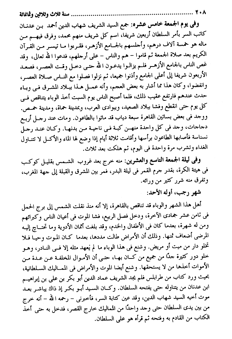 وَفِي يَوْم الْجُمُعَة خَامِس عشره: جمع السَّيِّد الشريف شهَاب الدّين أَحْمد بن عدنان كَاتب السِّرّ بِأَمْر السُّلْطَان أَرْبَعِينَ شريفاً اسْم كل شرِيف مِنْهُم مُحَمَّد وَفرق فيهم من مَاله هُوَ خَمْسَة آلَاف دِرْهَم وأجلسهم بالجامع الْأَزْهَر فقرءوا مَا تيَسّر من الْقُرْآن الْكَرِيم بعد صَلَاة الْجُمُعَة ثمَّ قَامُوا - هم وَالنَّاس - على أَرجُلهم فدعوا الله تَعَالَى وَقد غص النَّاس بالجامع الْأَزْهَر فَلم يزَالُوا يدعونَ الله حَتَّى دخل وَقت الْعَصْر فَصَعدَ الْأَرْبَعُونَ شريفاً إِلَى أَعلَى الْجَامِع وأذنوا جَمِيعًا ثمَّ نزلُوا فصلوا مَعَ النَّاس صَلَاة الْعَصْر وانفضوا وَكَانَ هَذَا مِمَّا أَشَارَ بِهِ بعض الْعَجم وَأَنه عمل هَذَا بِبِلَاد الْمشرق فِي وباء حدث عِنْدهم فارتفع عقيب ذَلِك فَلَمَّا أصبح النَّاس يَوْم السبت أَخذ الوباء يتناقص فِي كل يَوْم حَتَّى انْقَطع وَفَشَا بِبِلَاد الصَّعِيد وببوادي الْعَرَب وبمدينة حماة ومدينة حمص. وَوجد فِي بعض بساتين الْقَاهِرَة سَبْعَة دياب قد مَاتُوا بالطاعون. وَمَات عِنْد رجل أَربع دجاجات وجد فِي كل وَاحِدَة مِنْهُنَّ كبة فِي نَاحيَة من بدنهَا. وَكَانَ عِنْد رجل نسناسة فأصابها الطَّاعُون برأسها وأقامت ثَلَاثَة أَيَّام إِذا وضع لَهَا المَاء وَالْأكل لَا تتَنَاوَل الْغَدَاء وتشرب مرّة وَاحِدَة فِي الْيَوْم ثمَّ هَلَكت بعد ثَلَاث. وَفِي لَيْلَة الْجُمُعَة التَّاسِع وَالْعِشْرين: مِنْهُ خرج بعد غرُوب الشَّمْس بِقَلِيل كَوْكَب فِي هَيْئَة الكرة بِقدر جرم الْقَمَر فِي لَيْلَة الْبَدْر فَمر بَين الْمشرق والقبلة إِلَى جِهَة الْمغرب وتفرق مِنْهُ شرر كثير شهر رَجَب أَوله الْأَحَد: أهل هَذَا الشَّهْر والوباء قد تناقص بِالْقَاهِرَةِ إِلَّا أَنه مُنْذُ نقلت الشَّمْس إِلَى برج الْحمل فِي ثامن عشر جُمَادَى الْآخِرَة وَدخل فصل الرّبيع فَشَا الْمَوْت فِي أَعْيَان النَّاس وكبرائهم وَمن لَهُ شهرة بعد مَا كَانَ فِي الْأَطْفَال والخدم وَقد بلغت أَثمَان الْأَدْوِيَة وَمَا تحتاح إِلَيْهِ المرضى أَضْعَاف ثمنهَا. وَذَلِكَ أَن الْأَمْرَاض طَالَتْ مدَّتهَا بعد مَا كَانَ الْمَوْت وَحيا فَلَا تَخْلُو دَار من ميت أَو مَرِيض. وشنع فِي هَذَا الوباء مَا لم يعْهَد مثله إِلَّا فِي النَّادِر وَهُوَ خلو دور كَثِيرَة جدا من جَمِيع من كَانَ بهَا حَتَّى أَن الْأَمْوَال المخلفة عَن عدَّة من الْأَمْوَات أَخذهَا من لَا يَسْتَحِقهَا. وشنع أَيْضا الْمَوْت والأمراض فِي المماليك السُّلْطَانِيَّة بِحَيْثُ ورد كتاب من طرابلس فَلم يجد الشريف عماد الدّين أَبُو بكر بن عَليّ بن إِبْرَاهِيم ابْن عدنان من يتَنَاوَلهُ حَتَّى يَفْتَحهُ السُّلْطَان. وَكَانَ السَّيِّد أَبُو بكر إِذْ ذَاك يُبَاشر بعد موت أَخِيه السَّيِّد شهَاب الدّين وَقد عين كِتَابَة السِّرّ فَأَخْبرنِي - رَحمَه الله - أَنه خرج من بَين يَدي السُّلْطَان حَتَّى وجد وَاحِدًا من المماليك خَارج الْقصر فَدخل بِهِ حَتَّى أَخذ الْكتاب من القادم بِهِ وفتحه ثمَّ قَرَأَهُ هُوَ على السُّلْطَان.