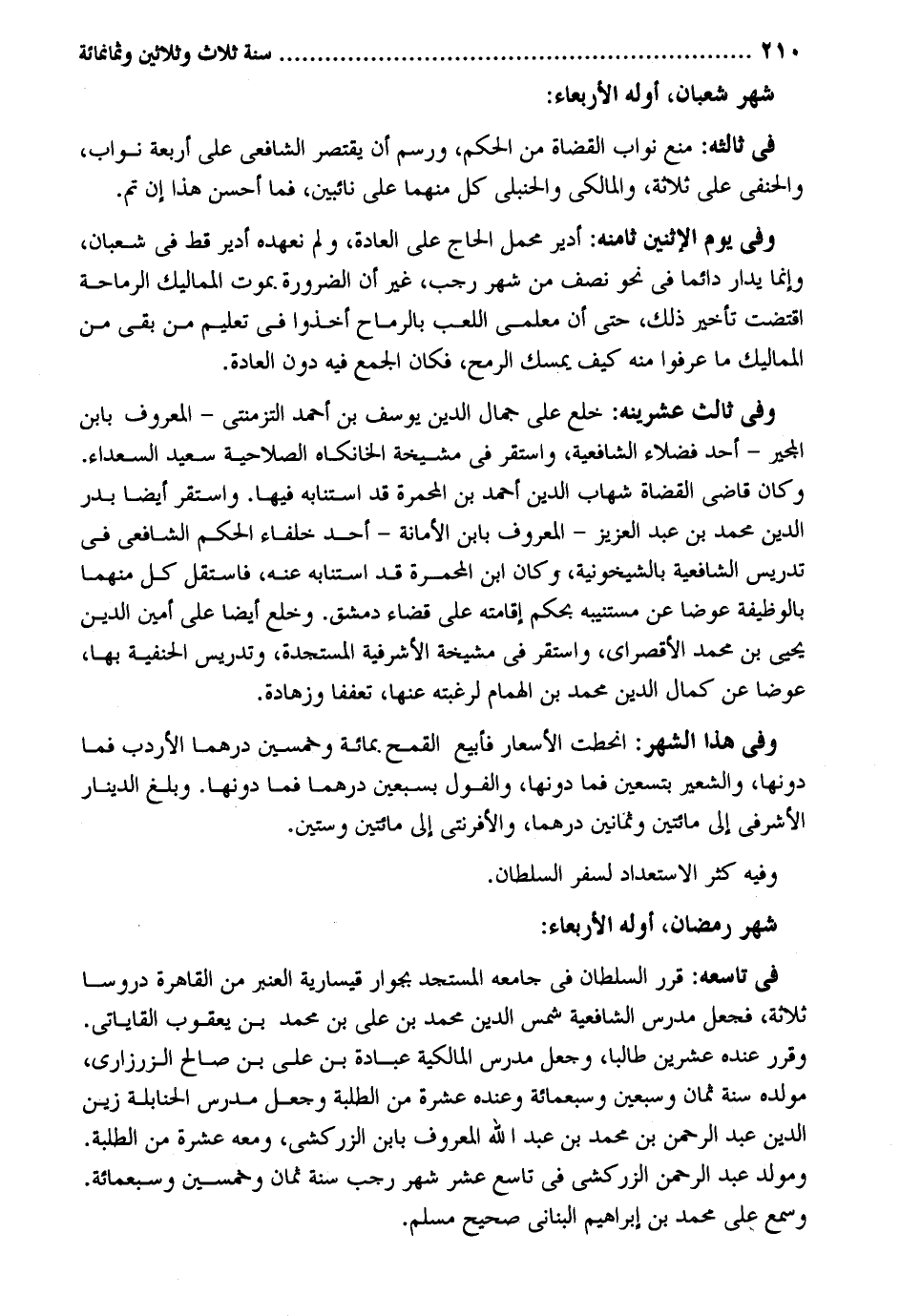 شهر شعْبَان أَوله الْأَرْبَعَاء: فِي ثالثه: منع نواب الْقُضَاة من الحكم ورسم أَن يقْتَصر الشَّافِعِي على أَرْبَعَة نواب والحنفي على ثَلَاثَة والمالكي والحنبلي كل مِنْهُمَا على نائبين فَمَا أحسن هَذَا إِن تمّ. وَفِي يَوْم الِاثْنَيْنِ ثامنه: أدير محمل الْحَاج على الْعَادة وَلم نعهده أدير قطّ فِي شعْبَان وَإِنَّمَا يدار دَائِما فِي نَحْو نصف من شهر رَجَب غير أَن الضَّرُورَة بِمَوْت المماليك الرماحة اقْتَضَت تَأْخِير ذَلِك حَتَّى أَن معلمي اللّعب بِالرِّمَاحِ أخذُوا فِي تَعْلِيم من بَقِي من المماليك مَا عرفُوا مِنْهُ كَيفَ يمسك الرمْح فَكَانَ الْجمع فِيهِ دون الْعَادة. وَفِي ثَالِث عشرينه: خلع على جمال الدّين يُوسُف بن أَحْمد التزمنتي - الْمَعْرُوف بِابْن المجير - أحد فضلاء الشَّافِعِيَّة وَاسْتقر فِي مشيخة الخانكاه الصلاحية سعيد السُّعَدَاء. وَكَانَ قَاضِي الْقُضَاة شهَاب الدّين أَحْمد بن المحمرة قد استنابه فِيهَا. وَاسْتقر أَيْضا بدر الدّين مُحَمَّد بن عبد الْعَزِيز - الْمَعْرُوف بِابْن الْأَمَانَة - أحد خلفاء الحكم الشَّافِعِي فِي تدريس الشَّافِعِيَّة بالشيخونية وَكَانَ ابْن المحمرة قد استنابه عَنهُ فاستقل كل مِنْهُمَا بالوظيفة عوضا عَن مستنيبه بِحكم إِقَامَته على قَضَاء دمشق. وخلع أَيْضا على أَمِين الدّين يحيى بن مُحَمَّد الأقصراي وَاسْتقر فِي مشيخة الأشرفية المستجدة وتدريس الْحَنَفِيَّة بهَا عوضا عَن كَمَال الدّين مُحَمَّد بن الْهمام لرغبته عَنْهَا تعففاً وزهادة. وَفِي هَذَا الشَّهْر: انحطت الأسعار فأبيع الْقَمْح. بِمِائَة وَخمسين درهما الأردب فَمَا دونهَا وَالشعِير بتسعين فَمَا دونهَا والفول بسبعين درهما فَمَا دونهَا. وَبلغ الدِّينَار الأشرفي إِلَى مِائَتَيْنِ وَثَمَانِينَ درهما والأفرنتي إِلَى مِائَتَيْنِ وَسِتِّينَ. وَفِيه كثر الإستعداد لسفر السُّلْطَان. شهر رَمَضَان أَوله الْأَرْبَعَاء: فِي تاسعه: قرر السُّلْطَان فِي جَامعه المستجد بجوار قيسارية العنبر من الْقَاهِرَة دروساً ثَلَاثَة فَجعل مدرس الشَّافِعِيَّة شمس الدّين مُحَمَّد بن عَليّ بن مُحَمَّد بن يَعْقُوب القاياتي. وَقرر عِنْده عشْرين طَالبا وَجعل مدرس الْمَالِكِيَّة عبَادَة بن عَليّ بن صَالح الزرزاري مولده سنة ثَمَان وَسبعين وَسَبْعمائة وَعِنْده عشرَة من الطّلبَة وَجعل مدرس الْحَنَابِلَة زين الدّين عبد الرَّحْمَن بن مُحَمَّد بن عبد الله الْمَعْرُوف بِابْن الزَّرْكَشِيّ وَمَعَهُ عشرَة من الطّلبَة. ومولد عبد الرَّحْمَن الزَّرْكَشِيّ فِي تَاسِع عشر شهر رَجَب سنة ثَمَان وَخمسين وَسَبْعمائة. وَسمع عَليّ بن إِبْرَاهِيم الْبنانِيّ صَحِيح مُسلم