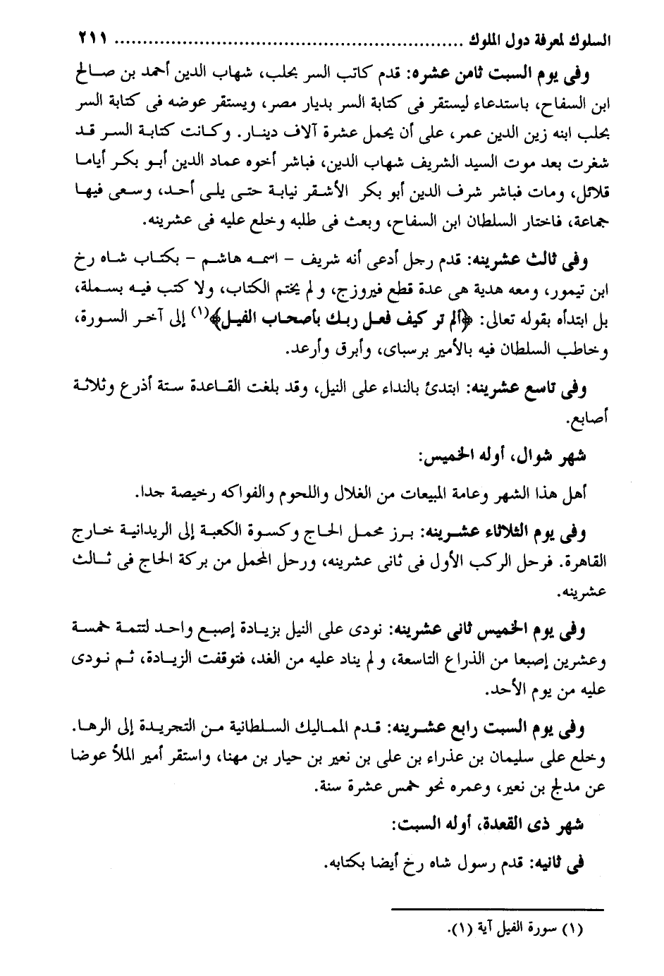وَفِي يَوْم السبت ثامن عشره: قدم كَاتب السِّرّ بحلب شهَاب الدّين أَحْمد بن صَالح ابْن السفاح باستدعاء ليستقر فِي كِتَابَة السِّرّ بديار مصر ويستقر عوضه فِي كِتَابَة السِّرّ بحلب ابْنه زين الدّين عمر على أَن يحمل عشرَة آلَاف دِينَار. وَكَانَت كِتَابَة السِّرّ قد شغرت بعد موت السَّيِّد الشريف شهَاب الدّين فباشر أَخُوهُ عماد الدّين أَبُو بكر أَيَّامًا قَلَائِل وَمَات فباشر شرف الدّين أَبُو بكر الْأَشْقَر نِيَابَة حَتَّى يَلِي أحد وسعى فِيهَا جمَاعَة فَاخْتَارَ السُّلْطَان ابْن السفاح وَبعث فِي طلبه وخلع عَلَيْهِ فِي عشرينه. وَفِي ثَالِث عشرينه: قدم رجل أدعى أَنه شرِيف - اسْمه هَاشم - بِكِتَاب شاه رخ ابْن تيمور وَمَعَهُ هَدِيَّة هِيَ عدَّة قطع فيروزج وَلم يخْتم الْكتاب وَلَا كتب فِيهِ بَسْمَلَة بل ابتدأه بقوله تَعَالَى: ألم تَرَ كَيفَ فعل رَبك بأصحاب الْفِيل إِلَى آخر السُّورَة وخاطب السُّلْطَان فِيهِ بالأمير برسباي وَفِي تَاسِع عشرينه: ابتدئ بالنداء على النّيل وَقد بلغت الْقَاعِدَة سِتَّة أَذْرع وَثَلَاثَة أَصَابِع شهر شَوَّال أَوله الْخَمِيس: أهل هَذَا الشَّهْر وَعَامة المبيعات من الغلال واللحوم والفواكه رخيصة جدا. وَفِي يَوْم الثُّلَاثَاء عشرينه: برز محمل الْحَاج وَكِسْوَة الْكَعْبَة إِلَى الريدانية خَارج الْقَاهِرَة فَرَحل الركب الأول فِي ثَانِي عشرينه ورحل الْمحمل من بركَة الْحَاج فِي ثَالِث عشرينه وَفِي يَوْم الْخَمِيس ثَانِي عشرينه: نُودي على النّيل بِزِيَادَة إِصْبَع وَاحِد لتتمة خَمْسَة وَعشْرين إصبعاً من الذِّرَاع التَّاسِعَة وَلم يناد عَلَيْهِ من الْغَد فتوقفت الزِّيَادَة ثمَّ نُودي عَلَيْهِ من يَوْم الْأَحَد. وَفِي يَوْم السبت رَابِع عشرينه: قدم المماليك السُّلْطَانِيَّة من التجريدة إِلَى الرها وخلع عَليّ سُلَيْمَان بن عذراء بن عَليّ بن نعير بن حيار بن مهنا وَاسْتقر أَمِير الْمَلأ عوضا عَن مُدْلِج بن نعير وعمره نَحْو خمس عشرَة سنة. شهر ذِي الْقعدَة أَوله السبت: فِي ثَانِيه: قدم رَسُول شاه رخ أَيْضا بكتابه.