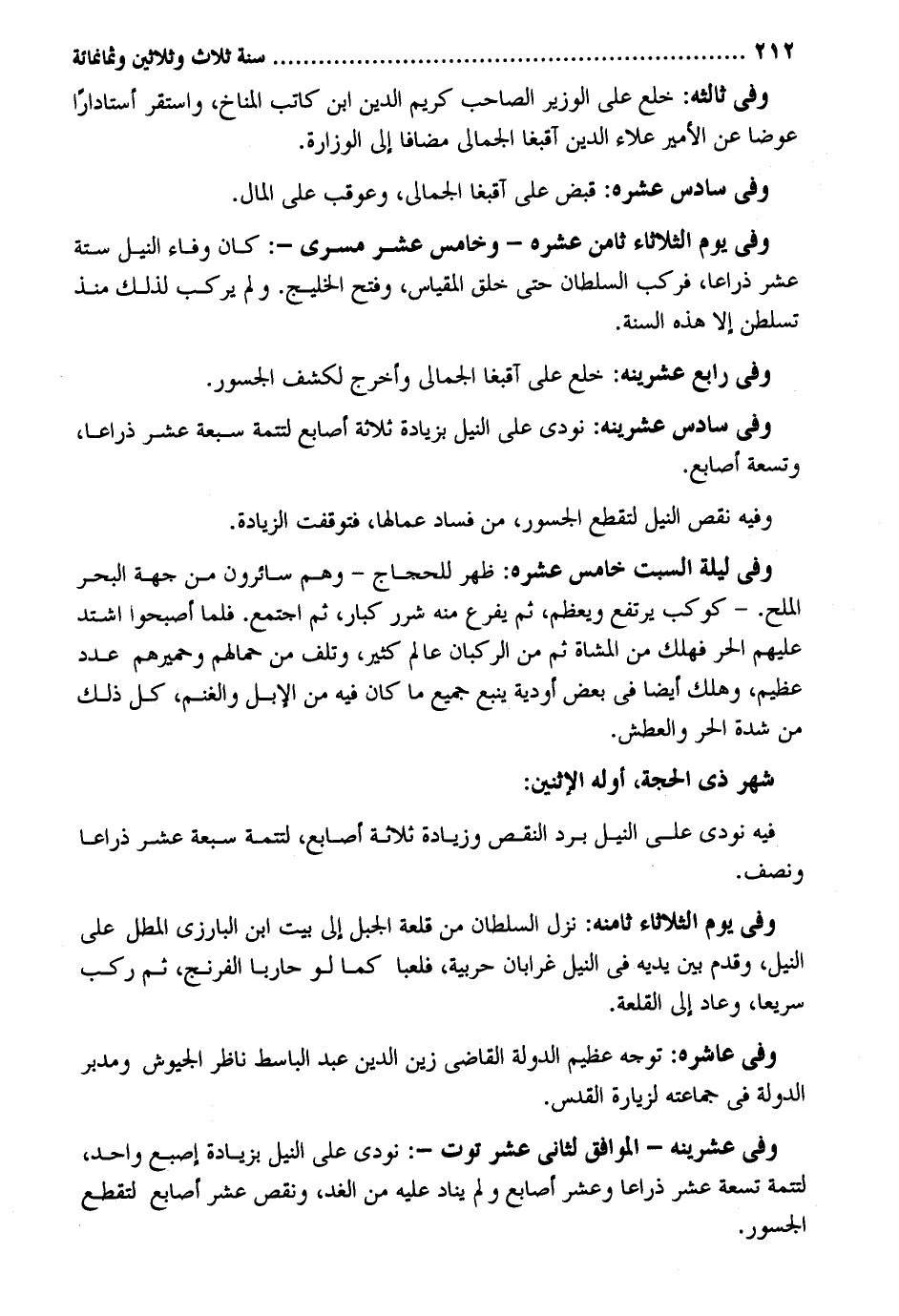 وَفِي ثالثه: خلع على الْوَزير الصاحب كريم الدّين ابْن كَاتب المناخ وَاسْتقر أستاداراً عوضا عَن الْأَمِير عَلَاء الدّين أقبغا الجمالي مُضَافا إِلَى الوزارة. وَفِي يَوْم الثُّلَاثَاء ثامن عشره - وخامس عشر مسرى -: كَانَ وَفَاء النّيل سِتَّة عشر ذِرَاعا فَركب السُّلْطَان حَتَّى خلق المقياس وَفتح الخليج. وَلم يركب لذَلِك مُنْذُ تسلطن إِلَّا هَذِه السّنة. وَفِي رَابِع عشرينه: خلع على أقبغا الجمالي وَأخرج لكشف الجسور. وَفِي سادس عشرينه: نُودي على النّيل بِزِيَادَة ثَلَاثَة أَصَابِع لتتمة سَبْعَة عشر ذِرَاعا وَتِسْعَة أَصَابِع. وَفِيه نقص النّيل لتقطع الجسور من فَسَاد عمالها فتوقفت الزِّيَادَة. وَفِي لَيْلَة السبت خَامِس عشره: ظهر للحجاج - وهم سائرون من جِهَة الْبَحْر الْملح - كَوْكَب يرْتَفع ويعظم ثمَّ يفرع مِنْهُ شرر كبار ثمَّ اجْتمع. فَلَمَّا أَصْبحُوا اشْتَدَّ عَلَيْهِم الْحر فَهَلَك من المشاة ثمَّ من الركْبَان عَالم كثير وَتلف من حمالهم وحميرهم عدد عَظِيم وَهلك أَيْضا فِي بعض أَوديَة يَنْبع جَمِيع مَا كَانَ فِيهِ من الْإِبِل وَالْغنم كل ذَلِك من شدَّة الْحر والعطش. شهر ذِي الْحجَّة أَوله الِاثْنَيْنِ: فِيهِ نُودي على النّيل برد النَّقْص وَزِيَادَة ثَلَاثَة أَصَابِع لتتمة سَبْعَة عشر ذِرَاعا وَنصف. وَفِي يَوْم الثُّلَاثَاء ثامنه: نزل السُّلْطَان من قلعة الْجَبَل إِلَى بَيت ابْن الْبَارِزِيّ المطل على النّيل وَقدم بَين يَدَيْهِ فِي النّيل غرابان حربية فلعبا كَمَا لَو حاربا الفرنج ثمَّ ركب سَرِيعا وَعَاد إِلَى القلعة. وَفِي عاشره: توجه عَظِيم الدولة القَاضِي زين الدّين عبد الباسط نَاظر الجيوش ومدبر الدولة فِي جماعته لزيارة الْقُدس. وَفِي عشرينه - الْمُوَافق لثاني عشر توت -: نُودي على النّيل بِزِيَادَة إِصْبَع وَاحِد لتتمة تِسْعَة عشر ذِرَاعا وَعشر أَصَابِع وَلم يناد عَلَيْهِ من الْغَد وَنقص عشر أَصَابِع لتقطع الجسور.