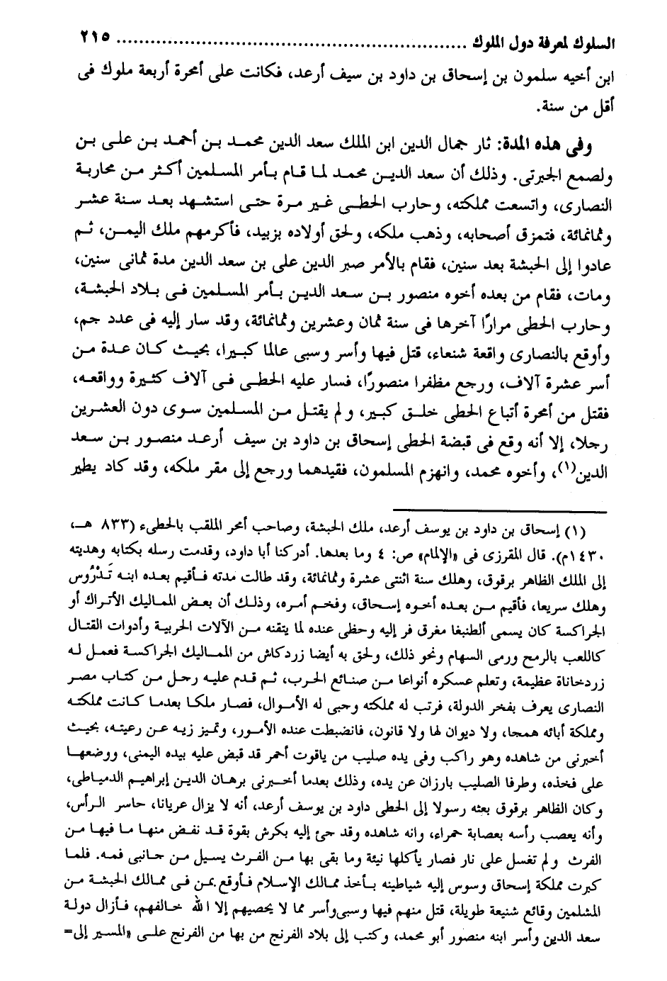 ابْن أَخِيه سَلمُون بن إِسْحَاق بن دَاوُد بن سيف أرعد فَكَانَت على أمحرة أَرْبَعَة مُلُوك فِي أقل من سنة. وَفِي هَذِه الْمدَّة: ثار جمال الدّين ابْن الْملك سعد الدّين مُحَمَّد بن أَحْمد بن عَليّ بن ولصمع الجبرتي. وَذَلِكَ أَن سعد الدّين مُحَمَّد لما قَامَ بِأَمْر الْمُسلمين أَكثر من محاربة النَّصَارَى واتسعت مَمْلَكَته وَحَارب الحطي غير مرّة حَتَّى اسْتشْهد بعد سنة عشر وَثَمَانمِائَة فتمزق أَصْحَابه وَذهب ملكه وَلحق أَوْلَاده بزبيد فأكرمهم ملك الْيمن ثمَّ عَادوا إِلَى الْحَبَشَة بعد سِنِين فَقَامَ بالأمير صَبر الدّين عَليّ بن سعد الدّين مُدَّة ثَمَانِي سِنِين وَمَات فَقَامَ من بعده أَخُوهُ مَنْصُور بن سعد الدّين بِأَمْر الْمُسلمين فِي بِلَاد الْحَبَشَة وَحَارب الحطي مرَارًا آخرهَا فِي سنة ثَمَان وَعشْرين وَثَمَانمِائَة وَقد سَار إِلَيْهِ فِي عدد جم وأوقع بالنصارى وَاقعَة شنعاء قتل فِيهَا وَأسر وَسبي عَالما كَبِيرا بِحَيْثُ كَانَ عدد من أسر عشرَة آلَاف وَرجع مظفراً منصوراً فَسَار عَلَيْهِ الحطي فِي آلَاف كَثِيرَة وواقعه فَقتل من أمحرة أَتبَاع الْحلِيّ خلق كَبِير وَلم يقتل من الْمُسلمين سوى دون الْعشْرين رجلا إِلَّا أَنه وَقع فِي قَبْضَة الحطي إِسْحَاق بن دَاوُد بن سيف أرعد مَنْصُور بن سعد الدّين وَأَخُوهُ مُحَمَّد وَانْهَزَمَ الْمُسلمُونَ فقيدهما وَرجع إِلَى مقرّ ملكه وَقد كَاد يطير