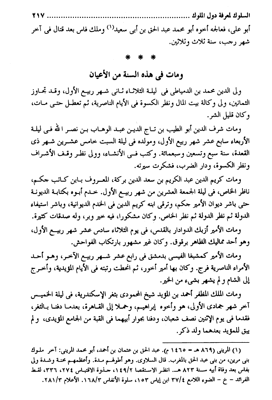 أَبُو عَليّ فعالجه أَخُوهُ أَبُو مُحَمَّد عبد الْحق بن أبي سعيد وَملك فاس بعد قتال فِي آخر شهر رَجَب سنة ثَلَاث وَثَلَاثِينَ. وَمَات فِي هَذِه السّنة من الْأَعْيَان ولى الدّين مُحَمَّد بن الدمياطي فِي لَيْلَة الثُّلَاثَاء ثَانِي شهر ربيع الأول وَقد تجَاوز الثَّمَانِينَ ولى وكَالَة بَيت المَال وَنظر الْكسْوَة فِي الْأَيَّام الناصرية ثمَّ تعطل حَتَّى مَاتَ وَكَانَ قَلِيل الشَّرّ. وَمَات شرف الدّين أَبُو الطّيب بن تَاج الدّين عبد الْوَهَّاب بن نصر الله فِي لَيْلَة الْأَرْبَعَاء سَابِع عشر شهر ربيع الأول ومولده فِي لَيْلَة السبت خَامِس عشْرين شهر ذِي الْقعدَة سنة سبع وَتِسْعين وَسَبْعمائة. وَكتب فِي الْإِنْشَاء وَولي نظر وقف الْأَشْرَاف وَنظر الْكسْوَة وَدَار الضَّرْب فَشَكَرت وَمَات كريم الدّين عبد الْكَرِيم بن سعد الدّين بركَة الْمَعْرُوف بِابْن كَاتب جكم نَاظر الْخَاص فِي لَيْلَة الْجُمُعَة الْعشْرين من شهر ربيع الأول. خدم أَبوهُ بِكِتَابَة الديونة حَتَّى بَاشر ديوَان الْأَمِير جكم وترقى ابْنه كريم الدّين فِي الخدم الديوانية وباشر اسْتِيفَاء البولة ثمَّ نظر الدولة ثمَّ نظر الْخَاص. وَكَانَ مشكوراً فِيهِ خير وبر وَله صدقَات كَثْرَة. وَمَات الْأَمِير أزبك الدوادار بالقدس فِي يَوْم الثُّلَاثَاء سادس عشر شهر ربيع الأول وَهُوَ أحد مماليك الظَّاهِر برقوق. وَكَانَ غير مَشْهُور بارتكاب الْفَوَاحِش. وَمَات الْأَمِير كمشبغا الْقَيْسِي بِدِمَشْق فِي رَابِع عشر شهر ربيع الآخر وَهُوَ أحد الْأُمَرَاء الناصرية فرج. وَكَانَ بهَا أَمِير أخور ثمَّ انحطت رتبته فِي الْأَيَّام المؤيدية وَأخرج إِلَى الشَّام وَلم يشهر بِشَيْء من غير. وَمَات الْملك المظفر أَحْمد بن الْمُؤَيد شيخ المحمودي بثغر الْإسْكَنْدَريَّة فِي لَيْلَة الْخَمِيس آخر شهر جُمَادَى الأولى هُوَ وَأَخُوهُ إِبْرَاهِيم وحملا إِلَى الْقَاهِرَة بَعْدَمَا دفنا بالثغر فِي يَوْم الِاثْنَيْنِ نصف شعْبَان ودفنا بجوار أَبِيهِمَا فِي الْقبَّة من الْجَامِع المؤيدي وَلم يبْق للمؤيد بعدهمَا ولد ذكر.