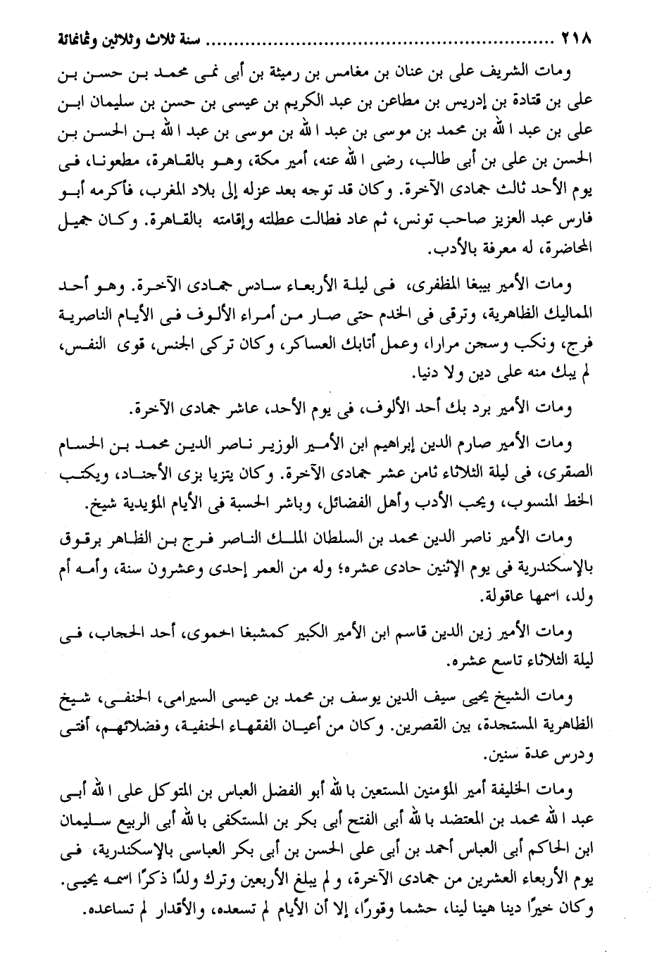 وَمَات الشريف عَليّ بن عنان بن مغامس بن رميثة بن أبي نمي مُحَمَّد بن حسن بن عَليّ بن قَتَادَة بن إِدْرِيس بن مطاعن بن عبد الْكَرِيم بن عِيسَى بن حسن بن سُلَيْمَان ابْن عَليّ بن عبد الله بن مُحَمَّد بن مُوسَى بن عبد الله بن مُوسَى بن عبد الله بن الْحسن بن الْحسن بن عَليّ بن أبي طَالب رَضِي الله عَنهُ أَمِير مَكَّة وَهُوَ بِالْقَاهِرَةِ مطعوناً فِي يَوْم الْأَحَد ثَالِث جُمَادَى الْآخِرَة. وَكَانَ قد توجه بعد عَزله إِلَى بِلَاد الْمغرب فَأكْرمه أَبُو فَارس عبد الْعَزِيز صَاحب تونس ثمَّ عَاد فطالت عطلته وإقامته بِالْقَاهِرَةِ. وَكَانَ جميل المحاضرة لَهُ معرفَة بالأدب. وَمَات الْأَمِير بيبغا المظفري فِي لَيْلَة الْأَرْبَعَاء سادس جُمَادَى الْآخِرَة. وَهُوَ أحد المماليك الظَّاهِرِيَّة وترقي فِي الخدم حَتَّى صَار من أُمَرَاء الألوف فِي الْأَيَّام الناصرية فرج ونكب وسجن مرَارًا وَعمل أتابك العساكر وَكَانَ تركي الْجِنْس قوي النَّفس لم يبك مِنْهُ على دين وَلَا دنيا. وَمَات الْأَمِير برد بك أحد الألوف فِي يَوْم الْأَحَد عَاشر جُمَادَى الْآخِرَة. وَمَات الْأَمِير صارم الدّين إِبْرَاهِيم ابْن الْأَمِير الْوَزير نَاصِر الدّين مُحَمَّد بن الحسام الصقري فِي لَيْلَة الثُّلَاثَاء ثامن عشر جُمَادَى الْآخِرَة. وَكَانَ يتزيا بزِي الأجناد وَيكْتب الْخط الْمَنْسُوب وَيُحب الْأَدَب وَأهل الْفَضَائِل وباشر الْحِسْبَة فِي الْأَيَّام المؤيدية شيخ. وَمَات الْأَمِير نَاصِر الدّين مُحَمَّد بن السُّلْطَان الْملك النَّاصِر فرج بن الظَّاهِر برقوق بالإسكندرية فِي يَوْم الِاثْنَيْنِ حادي عشره وَله من الْعُمر إِحْدَى وَعِشْرُونَ سنة وَأمه أم ولد اسْمهَا عاقولة. وَمَات الْأَمِير زين الدّين قَاسم ابْن الْأَمِير الْكَبِير كمشبغا الْحَمَوِيّ أحد الْحجاب فِي لَيْلَة الثُّلَاثَاء وَمَات الشَّيْخ يحيى سيف الدّين يُوسُف بن مُحَمَّد بن عِيسَى السيرامي الْحَنَفِيّ شيخ الظَّاهِرِيَّة المستجدة بَين القصرين. وَكَانَ من أَعْيَان الْفُقَهَاء الْحَنَفِيَّة وفضلائهم أفتى ودرس عدَّة سِنِين. وَمَات الْخَلِيفَة أَمِير الْمُؤمنِينَ المستعين بِاللَّه أَبُو الْفضل الْعَبَّاس بن المتَوَكل على الله أبي عبد الله مُحَمَّد بن المعتضد بِاللَّه أبي الْفَتْح أبي بكر بن المستكفي بِاللَّه أبي الرّبيع سُلَيْمَان ابْن الْحَاكِم أبي الْعَبَّاس أَحْمد بن أبي عَليّ الْحسن بن أبي بكر العباسي بالإسكندرية فِي يَوْم الْأَرْبَعَاء الْعشْرين من جُمَادَى الْآخِرَة وَلم يبلغ الْأَرْبَعين وَترك ولدا ذكرا اسْمه يحيى. وَكَانَ خيرا دينا هيناً لينًا حشماً وقوراً إِلَّا أَن الْأَيَّام لم تسعده والأقدار لم تساعده.