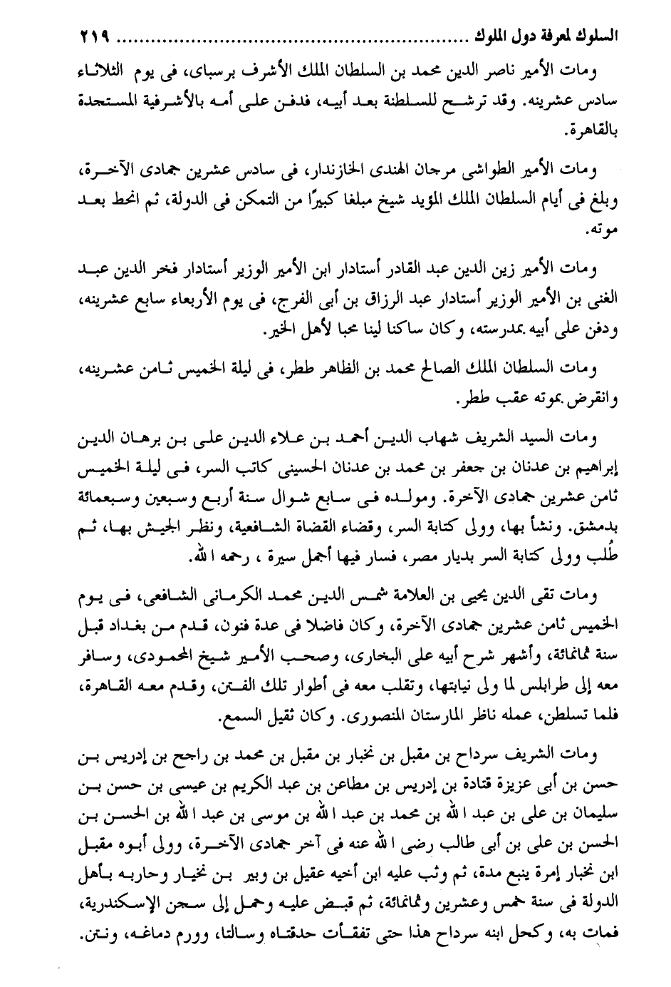 مَاتَ الْأَمِير نَاصِر الدّين مُحَمَّد بن السُّلْطَان الْملك الْأَشْرَف برسباي فِي يَوْم الثُّلَاثَاء سادس عشرينه. وَقد ترشح للسلطنة بعد أَبِيه فَدفن على أمه بالأشرفية المستجدة بِالْقَاهِرَةِ. مَاتَ الْأَمِير الطواشي مرجان الْهِنْدِيّ الخازندار فِي سادس عشْرين جُمَادَى الْآخِرَة بلغ فِي أَيَّام السُّلْطَان الْملك الْمُؤَيد شيخ مبلغا كَبِيرا من التَّمَكُّن فِي الدولة ثمَّ انحط بعد مَوته. وَمَات الْأَمِير زين الدّين عبد الْقَادِر أستادار ابْن الْأَمِير الْوَزير أستادار فَخر الدّين عبد الْغَنِيّ بن الْأَمِير الْوَزير أستادار عبد الرَّزَّاق بن أبي الْفرج فِي يَوْم الْأَرْبَعَاء سَابِع عشرينه وَدفن على أَبِيه بمدرسته وَكَانَ سَاكِنا لينًا محباً لأهل الْخَيْر. وَمَات السُّلْطَان الْملك الصَّالح مُحَمَّد بن الظَّاهِر ططر فِي لَيْلَة الْخَمِيس ثامن عشرينه وانقرض بِمَوْتِهِ عقب ططر. وَمَات السَّيِّد الشريف شهَاب الدّين أَحْمد بن عَلَاء الدّين عَليّ بن برهَان الدّين إِبْرَاهِيم بن عدنان بن جَعْفَر بن مُحَمَّد بن عدنان الْحُسَيْنِي كَاتب السِّرّ فِي لَيْلَة الْخَمِيس ثامن عشْرين جُمَادَى الْآخِرَة. ومولده فِي سَابِع شَوَّال سنة أَربع وَسبعين وَسَبْعمائة بِدِمَشْق. وَنَشَأ بهَا وَولي كِتَابَة السِّرّ وَقَضَاء الْقُضَاة الشَّافِعِيَّة وَنظر الْجَيْش بهَا ثمَّ طلب وَولي كِتَابَة السِّرّ بديار مصر فَسَار فِيهَا أجمل سيرة رَحمَه الله. وَمَات تَقِيّ الدّين يحيى بن الْعَلامَة شمس الدّين مُحَمَّد الْكرْمَانِي الشَّافِعِي فِي يَوْم الْخَمِيس ثامن عشْرين جُمَادَى الْآخِرَة وَكَانَ فَاضلا فِي عدَّة فنون قدم من بَغْدَاد قبل سنة ثَمَانمِائَة وَأشهر شرح أَبِيه على البُخَارِيّ وَصَحب الْأَمِير شيخ المحمودي وسافر مَعَه إِلَى طرابلس لما ولي نيابتها وتقلب مَعَه فِي أطوار تِلْكَ الْفِتَن وَقدم مَعَه الْقَاهِرَة فَلَمَّا تسلطن عمله نَاظر المارستان المنصوري. وَكَانَ ثقيل السّمع. وَمَات الشريف سرداح بن مقبل بن نخبار بن مقبل بن مُحَمَّد بن رَاجِح بن إِدْرِيس بن حسن بن أبي عزيزة قَتَادَة بن إِدْرِيس بن مطاعن بن عبد الْكَرِيم بن عِيسَى بن حسن بن سُلَيْمَان بن عَليّ بن عبد الله بن مُحَمَّد بن عبد الله بن مُوسَى بن عبد الله بن الْحسن بن الْحسن بن عَليّ بن أبي طَالب رَضِي الله عَنهُ فِي آخر جُمَادَى الْآخِرَة وَولي أَبوهُ مقبل ابْن نخبار إمرة يَنْبع مُدَّة ثمَّ وثب عَلَيْهِ ابْن أَخِيه عقيل بن وبير بن نخيار وحاربه بِأَهْل الدولة فِي سنة خمس وَعشْرين وَثَمَانمِائَة ثمَّ قبض عَلَيْهِ وَحمل إِلَى سجن الْإسْكَنْدَريَّة فَمَاتَ بِهِ وكحل ابْنه سرداح هَذَا حَتَّى تفقأت حدقتاه وسالتا وورم دماغه نَتن.