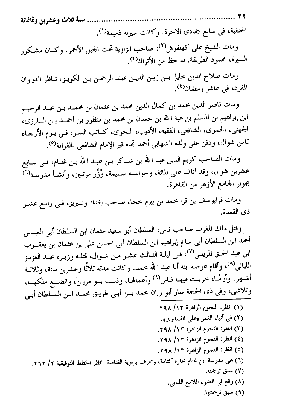 الْحَنَفِيَّة فِي سَابِع جُمَادَى الْآخِرَة. وَكَانَت سيرته ذميمة. وَمَات الشَّيْخ عَليّ كهنفوش: صَاحب الزاوية تَحت الْجَبَل الْأَحْمَر. وَكَانَ مشكور السِّيرَة مَحْمُود الطَّرِيقَة لَهُ حَظّ من الأتراك. وَمَات صَلَاح الدّين خَلِيل بن زين الدّين عبد الرَّحْمَن بن الكويز نَاظر الدِّيوَان الْمُفْرد فِي عَاشر رَمَضَان. وَمَات نَاصِر الدّين مُحَمَّد بن كَمَال الدّين مُحَمَّد بن عُثْمَان بن مُحَمَّد بن عبد الرَّحِيم ابْن إِبْرَاهِيم بن الْمُسلم بن هبة الله بن حسان بن مُحَمَّد بن مَنْظُور بن أَحْمد بن الْبَارِزِيّ الْجُهَنِيّ الْحَمَوِيّ الشَّافِعِي الْفَقِيه الأديب النَّحْوِيّ كَاتب السِّرّ فِي يَوْم الْأَرْبَعَاء ثامن شَوَّال وَدفن على وَلَده الشهابي أَحْمد تجاه قبر الإِمَام الشَّافِعِي بالقرافة. وَمَات الصاحب كريم الدّين عبد الله بن شَاكر بن عبد الله بن غَنَّام فِي سَابِع عشْرين شَوَّال وَقد أناف على الْمِائَة وحواسه سليمَة وزر مرَّتَيْنِ وَأَنْشَأَ مدرسة بجوار الْجَامِع الْأَزْهَر من الْقَاهِرَة. وَمَات قرا يُوسُف بن قرا مُحَمَّد بن بيرم خجا صَاحب بَغْدَاد وتبريز فِي رَابِع عشر ذِي الْقعدَة. وَقتل ملك الْمغرب صَاحب فاس السُّلْطَان أَبُو سعيد عُثْمَان ابْن السُّلْطَان أبي الْعَبَّاس أَحْمد ابْن السُّلْطَان أبي سَالم إِبْرَاهِيم ابْن السُّلْطَان أبي الْحسن عَليّ بن عُثْمَان بن يَعْقُوب ابْن عبد الْحق المريني فِي لَيْلَة الثَّالِث عشر من شَوَّال قَتله وزيره عبد الْعَزِيز اللباني وَأقَام عوضه ابْنه أَبَا عبد الله مُحَمَّد. وَكَانَت مدَّته ثَلَاثًا وَعشْرين سنة وَثَلَاثَة أشهر وأياماً خربَتْ فِيهَا فاس وأعمالها وذلت بَنو مرين واتضع ملكهَا وتلاشى وَفِي ذِي الْحجَّة سَار أَبُو زيان مُحَمَّد بن أبي طَرِيق مُحَمَّد ابْن السُّلْطَان أبي
