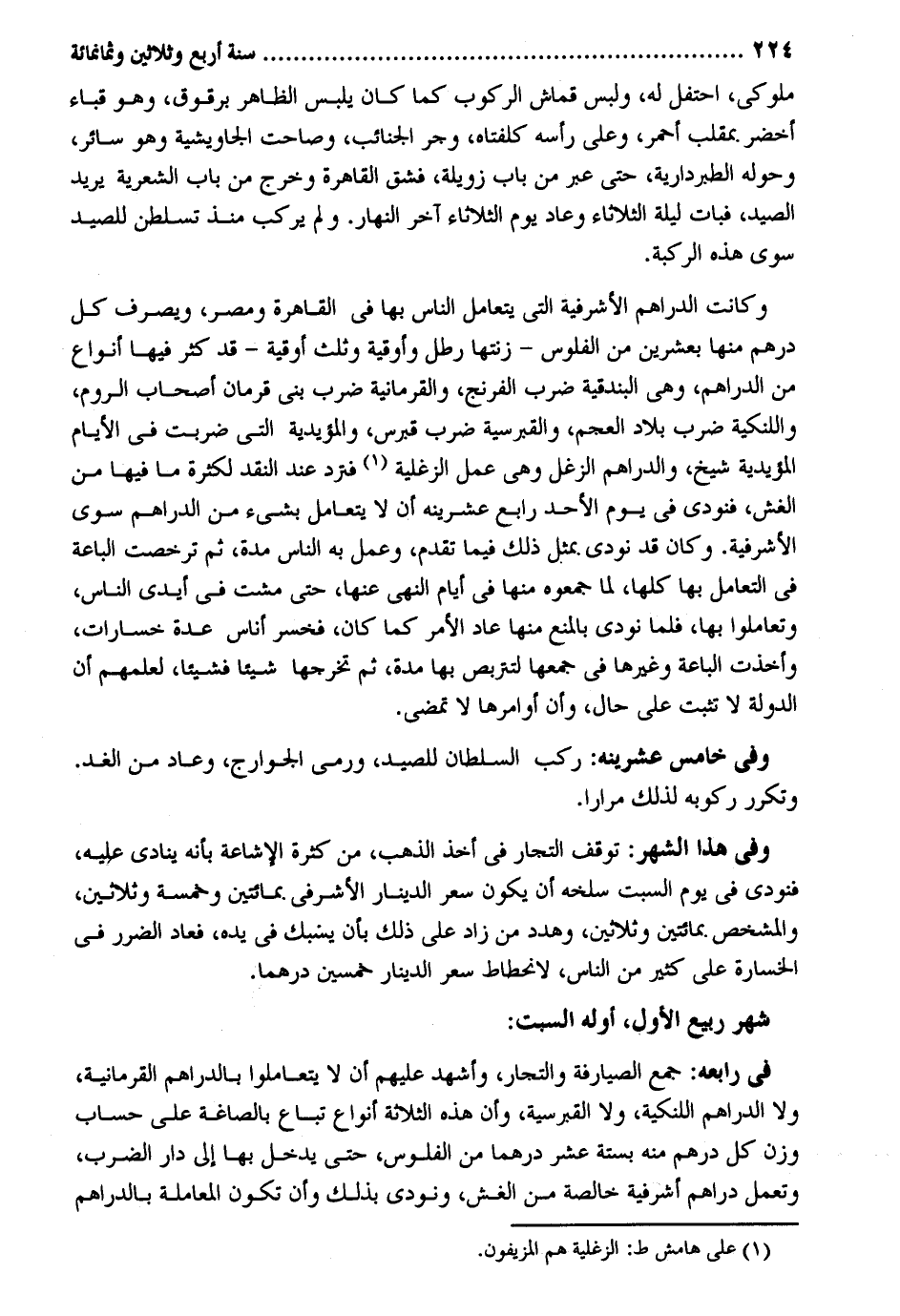ملوكي احتفل لَهُ وَلبس قماش الرّكُوب كَمَا كَانَ يلبس الظَّاهِر برقوق وَهُوَ قبَاء أَخْضَر. بمقلب أَحْمَر وعَلى رَأسه كلفتاه وجر الجنائب وصاحت الجاويشية وَهُوَ سَائِر وَحَوله الطبردارية حَتَّى عبر من بَاب زويلة فشق الْقَاهِرَة وَخرج من بَاب الشعرية يُرِيد الصَّيْد فَبَاتَ لَيْلَة الثُّلَاثَاء وَعَاد يَوْم الثُّلَاثَاء آخر النَّهَار. وَلم يركب مُنْذُ تسلطن للصَّيْد سوى هَذِه الرّكْبَة. وَكَانَت الدَّرَاهِم الأشرفية الَّتِي يتعامل النَّاس بهَا فِي الْقَاهِرَة ومصر وَيصرف كل دِرْهَم مِنْهَا بِعشْرين من الْفُلُوس - زنتها رَطْل وأوقية وَثلث أُوقِيَّة - قد كثر فِيهَا أَنْوَاع من الدَّرَاهِم وَهِي البندقية ضرب الفرنج والقرمانية ضرب بني قرمان أَصْحَاب الرّوم واللنكية ضرب بِلَاد الْعَجم والقبرسية ضرب قبرس والمؤيدية الَّتِي ضربت فِي الْأَيَّام المؤيدية شيخ وَالدَّرَاهِم الزغل وَهِي عمل الزغلية فَترد عِنْد النَّقْد لِكَثْرَة مَا فِيهَا من الْغِشّ فَنُوديَ فِي يَوْم الْأَحَد رَابِع عشرينه أَن لَا يتعامل بِشَيْء من الدَّرَاهِم سوى الأشرفية. وَكَانَ قد نُودي. بِمثل ذَلِك فِيمَا تقدم وَعمل بِهِ النَّاس مُدَّة ثمَّ ترخصت الباعة فِي التَّعَامُل بهَا كلهَا لما جَمَعُوهُ مِنْهَا فِي أَيَّام النَّهْي عَنْهَا حَتَّى مشت فِي أَيدي النَّاس وتعاملوا بهَا فَلَمَّا نُودي بِالْمَنْعِ مِنْهَا عَاد الْأَمر كَمَا كَانَ فخسر أنَاس عدَّة خسارات وَأخذت الباعة وَغَيرهَا فِي جمعهَا لتتربص بهَا مُدَّة ثمَّ تخرجها شَيْئا فَشَيْئًا لعلمهم أَن الدولة لَا تثبت على حَال وَأَن أوامرها لَا تمْضِي. فِي خَامِس عشرينه: ركب السُّلْطَان للصَّيْد وَرمي الْجَوَارِح وَعَاد من الْغَد. وتكرر ركُوبه لذَلِك مرَارًا. وَفِي هَذَا الشَّهْر: توقف التُّجَّار فِي أَخذ الذَّهَب من كَثْرَة الإشاعة بِأَنَّهُ يُنَادي عَلَيْهِ فَنُوديَ فِي يَوْم السبت سلخه أَن يكون سعر الدِّينَار الأشرفي. بمائتين وَخَمْسَة وَثَلَاثِينَ والمشخص بمائتين وَثَلَاثِينَ وهدد من زَاد على ذَلِك بِأَن يسنبك فِي يَده فَعَاد الضَّرَر فِي الخسارة على كثير من النَّاس لانحطاط سعر الدِّينَار خمسين درهما. فِي رابعه: جمع الصيارفة والتجار وَأشْهد عَلَيْهِم أَن لَا يتعاملوا بِالدَّرَاهِمِ القرمانية وَلَا الدَّرَاهِم اللنكية وَلَا القبرسية وَأَن هَذِه الثَّلَاثَة أَنْوَاع تبَاع بالصاغة على حِسَاب وزن كل دِرْهَم مِنْهُ بِسِتَّة عشر درهما من الْفُلُوس حَتَّى يدْخل بهَا إِلَى دَار الضَّرْب وتعمل دَرَاهِم أشرفية خَالِصَة من الْغِشّ وَنُودِيَ بذلك وَأَن تكون الْمُعَامَلَة بِالدَّرَاهِمِ