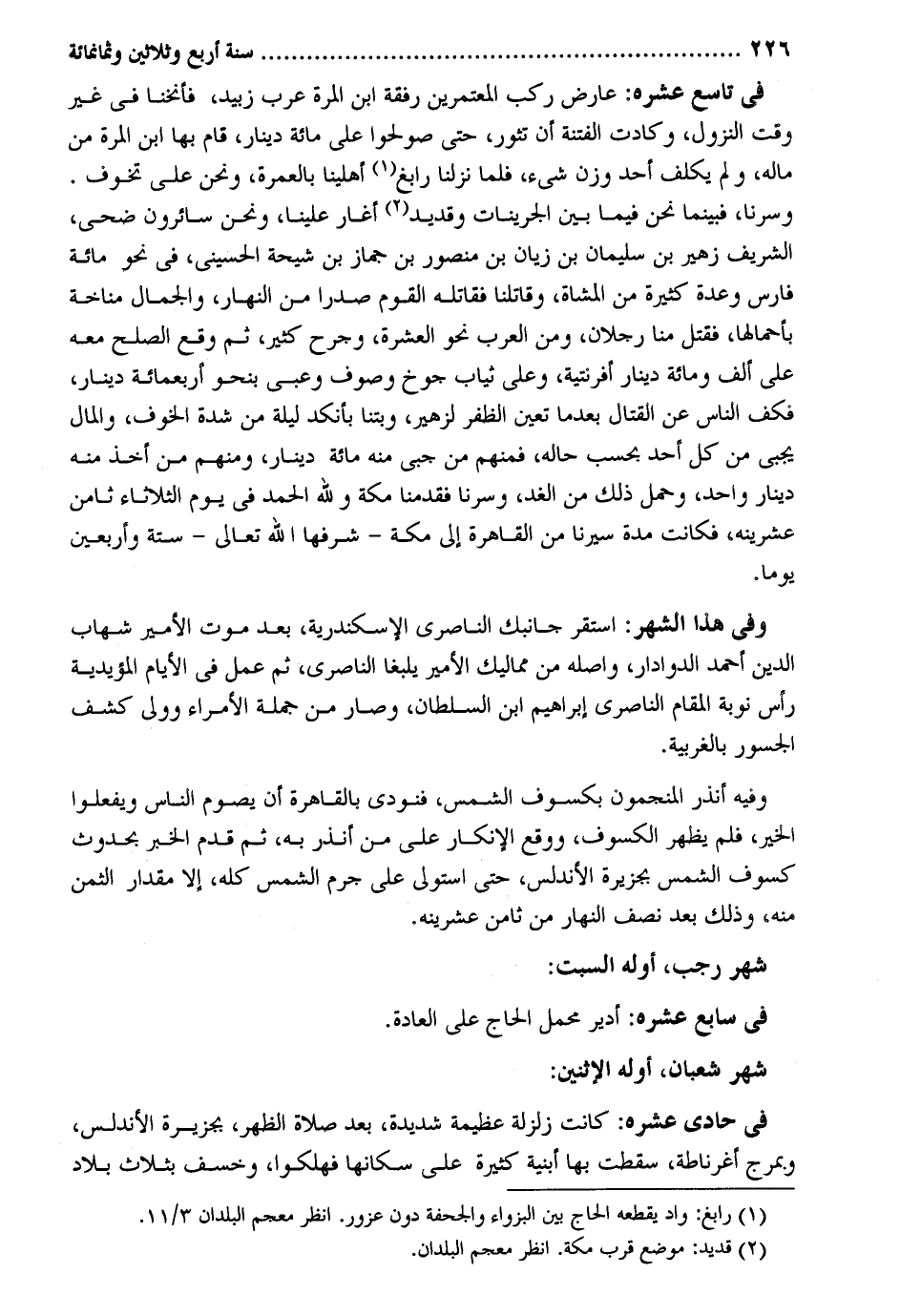 فِي تَاسِع عشره: عَارض ركب المعتمرين رفْقَة ابْن الْمرة عرب زبيد فانحنا فِي غير وَقت النُّزُول وكادت الْفِتْنَة أَن تثور حَتَّى صولحوا على مائَة دِينَار قَامَ بهَا ابْن الْمرة من مَاله وَلم يُكَلف أحد وزن شَيْء فَلَمَّا نزلنَا رابغ أَهْلينَا بِالْعُمْرَةِ وَنحن على تخوف وسرنا فَبَيْنَمَا نَحن فِيمَا بَين الجرينات وقديد أغار علينا وَنحن سائرون ضحى الشريف زُهَيْر بن سُلَيْمَان بن زيان بن مَنْصُور بن جماز بن شيحة الْحُسَيْنِي فِي نَحْو مائَة فَارس وعدة كَثِيرَة من المشاة وقاتلنا فقاتله الْقَوْم صَدرا من النَّهَار وَالْجمال مناخة بأحمالها فَقتل منا رجلَانِ وَمن الْعَرَب نَحْو الْعشْرَة وجرح كثير ثمَّ وَقع الصُّلْح مَعَه على ألف وَمِائَة دِينَار أفرنتية وعَلى ثِيَاب جوخ وصوف وعبي بِنَحْوِ أَرْبَعمِائَة دِينَار فَكف النَّاس عَن الْقِتَال بعد مَا تعين الظفر لزهير وبتنا بأنكد لَيْلَة من شدَّة الْخَوْف وَالْمَال يجبى من كل أحد بِحَسب حَاله فَمنهمْ من جبي مِنْهُ مائَة دِينَار وَمِنْهُم من أَخذ مِنْهُ دِينَار وَاحِد وَحمل ذَلِك من الْغَد وسرنا فقدمنا مَكَّة وَللَّه الْحَمد فِي يَوْم الثُّلَاثَاء ثامن عشرينه فَكَانَت مُدَّة سيرنا من الْقَاهِرَة إِلَى مَكَّة - شرفها الله تَعَالَى - سِتَّة وَأَرْبَعين يَوْمًا. وَفِي هَذَا الشَّهْر: اسْتَقر جَانِبك الناصري الْإسْكَنْدَريَّة بعد موت الْأَمِير شهَاب الدّين أَحْمد الدوادار وَأَصله من مماليك الْأَمِير يلبغا الناصري ثمَّ عمل فِي الْأَيَّام المؤيدية رَأس نوبَة الْمقَام الناصري إِبْرَاهِيم ابْن السُّلْطَان وَصَارَ من جملَة الْأُمَرَاء وَولي كشف الجسور بالغربية. وَفِيه أندر المنجمون بكسوف الشَّمْس فَنُوديَ بِالْقَاهِرَةِ أَن يَصُوم النَّاس ويفعلوا الْخَيْر فَلم يظْهر الْكُسُوف وَوَقع الْإِنْكَار على من أنذر بِهِ ثمَّ قدم الْخَبَر بحدوث كسوف الشَّمْس بِجَزِيرَة الأندلس حَتَّى استولى على جرم الشَّمْس كُله إِلَّا مِقْدَار الثّمن مِنْهُ وَذَلِكَ بعد نصف النَّهَار من ثامن عشرينه. شهر رَجَب أَوله السبت: فِي سَابِع عشره: أدير محمل الْحَاج على الْعَادة. شهر شعْبَان أَوله الِاثْنَيْنِ: فِي حادي عشره: كَانَت زَلْزَلَة عَظِيمَة شَدِيدَة بعد صَلَاة الظّهْر بِجَزِيرَة الأندلس وبمرج أغرناطة سَقَطت بهَا أبنية كَثِيرَة على سكانها فهلكوا وَخسف بِثَلَاث بِلَاد