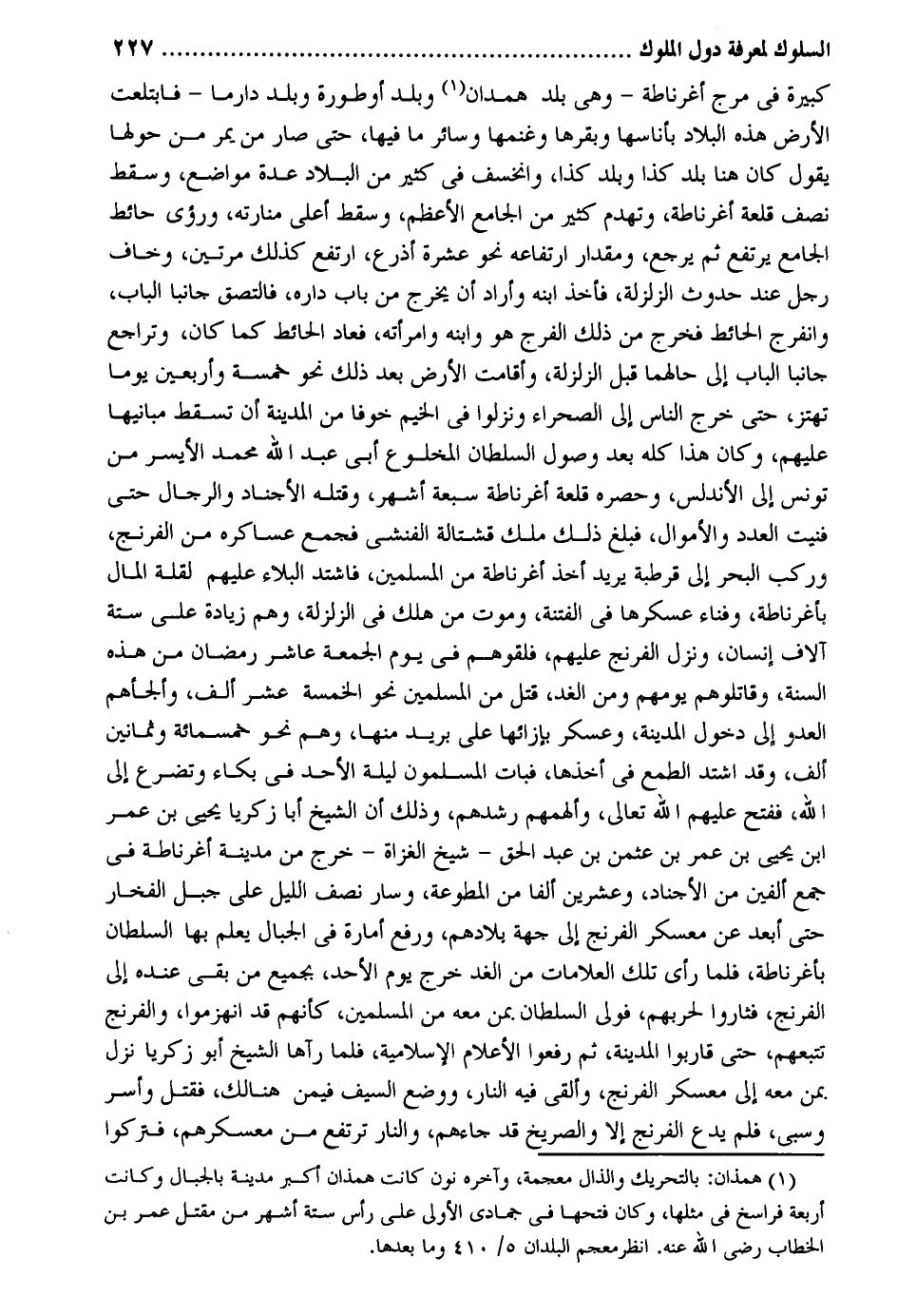 كَبِيرَة فِي مرج أغرناطة - وَهِي بلد هَمدَان وبلد أوطورة وبلد دارما - فابتلعت الأَرْض هَذِه الْبِلَاد بأناسها وبقرها وغنمها وَسَائِر مَا فِيهَا حَتَّى صَار من يمر من حولهَا يَقُول كَانَ هُنَا بلد كَذَا وبلد كَذَا وانخسف فِي كثير من الْبِلَاد عدَّة مَوَاضِع وَسقط نصف قلعة أغرناطة وتهدم كثير من الْجَامِع الْأَعْظَم وَسقط أَعلَى منارته ورؤى حَائِط الْجَامِع يرْتَفع ثمَّ يرجع وَمِقْدَار ارتفاعه نَحْو عشرَة أَذْرع ارْتَفع كَذَلِك مرَّتَيْنِ وَخَافَ رجل عِنْد حُدُوث الزلزلة فَأخذ ابْنه وَأَرَادَ أَن يخرج من بَاب دَاره فالتصق جانبا الْبَاب وانفرج الْحَائِط فَخرج من ذَلِك الْفرج هُوَ وَابْنه وَامْرَأَته فَعَاد الْحَائِط كَمَا كَانَ وتراجع جانبا الْبَاب إِلَى حَالهمَا قبل الزلزلة وأقامت الأَرْض بعد ذَلِك نَحْو خَمْسَة وَأَرْبَعين يَوْمًا تهتز حَتَّى خرج النَّاس إِلَى الصَّحرَاء ونزلوا فِي الخيم خوفًا من الْمَدِينَة أَن تسْقط مبانيها عَلَيْهِم وَكَانَ هَذَا كُله بعد وُصُول السُّلْطَان المخلوع أبي عبد الله مُحَمَّد الْأَيْسَر من تونس إِلَى الأندلس وحصره قلعة أغرناطة سَبْعَة أشهر وَقَتله الأجناد وَالرِّجَال حَتَّى فنيت الْعدَد وَالْأَمْوَال فَبلغ ذَلِك ملك قشتالة الفنشي فَجمع عساكره من الفرنج وَركب الْبَحْر إِلَى قرطبة يُرِيد أَخذ أغرناطة من الْمُسلمين فَاشْتَدَّ الْبلَاء عَلَيْهِم لقلَّة المَال بأغرناطة وفناء عسكرها فِي الْفِتْنَة وَمَوْت من هلك فِي الزلزلة وهم زِيَادَة على سِتَّة آلَاف إِنْسَان وَنزل الفرنج عَلَيْهِم فلقوهم فِي يَوْم الْجُمُعَة عَاشر رَمَضَان من هَذِه السّنة وقاتلوهم يومهم وَمن الْغَد قتل من الْمُسلمين نَحْو الْخَمْسَة عشر ألف وألجأهم الْعَدو إِلَى دُخُول الْمَدِينَة وعسكر بإزائها على بريد مِنْهَا وهم نَحْو خَمْسمِائَة وَثَمَانِينَ ألف وَقد اشْتَدَّ الطمع فِي أَخذهَا فَبَاتَ الْمُسلمُونَ لَيْلَة الْأَحَد فِي بكاء وتضرع إِلَى الله فَفتح عَلَيْهِم الله تَعَالَى وألهمهم رشدهم وَذَلِكَ أَن الشَّيْخ أَبَا زَكَرِيَّا يحيى بن عمر ابْن يحيى بن عمر بن عُثْمَان بن عبد الْحق - شيخ الْغُزَاة - خرج من مَدِينَة أغرناطة فِي جمع أَلفَيْنِ من الأجناد وَعشْرين ألفا من المطوعة وَسَار نصف اللَّيْل على جبل الفخار. حَتَّى أبعد عَن معسكر الفرنج إِلَى جِهَة بِلَادهمْ وَرفع إِمَارَة فِي الْجبَال يعلم بهَا السُّلْطَان بأغرناطة فَلَمَّا رأى تِلْكَ العلامات من الْغَد خرج يَوْم الْأَحَد بِجَمِيعِ من بَقِي عِنْده إِلَى الفرنج فثاروا لحربهم فولى السُّلْطَان بِمن مَعَه من الْمُسلمين كَأَنَّهُمْ قد انْهَزمُوا والفرنج تتبعهم حَتَّى قاربوا الْمَدِينَة ثمَّ رفعوا الْأَعْلَام الإسلامية فَلَمَّا رَآهَا الشَّيْخ أَبُو زَكَرِيَّا نزل بِمن مَعَه إِلَى معسكر الفرنج وَأُلْقِي فِيهِ النَّار وَوضع السَّيْف فِيمَن هُنَالك فَقتل وَأسر وسبى فَلم يدع الفرنج إِلَّا والصريخ قد جَاءَهُم وَالنَّار ترْتَفع من معسكرهم فتركوا