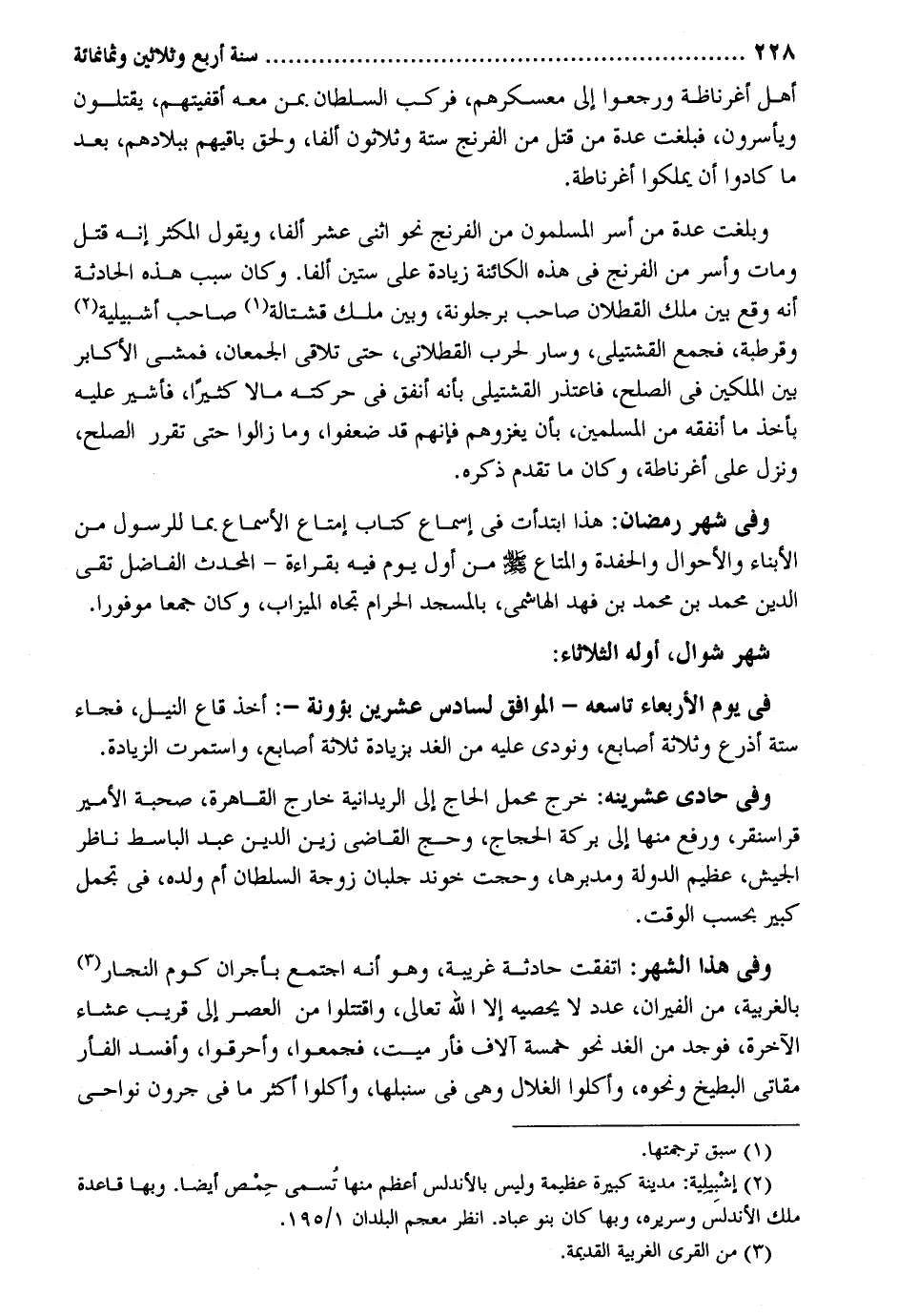 أهل أغرناظة وَرَجَعُوا إِلَى معسكرهم فَركب السُّلْطَان بِمن مَعَه أقفيتهم يقتلُون وَيَأْسِرُونَ فبلغت عدَّة من قتل من الفرنج سِتَّة وَثَلَاثُونَ ألفا وَلحق باقيهم ببلادهم بعد مَا كَادُوا أَن يملكُوا أغرناطة. وَبَلغت عدَّة من أسر الْمُسلمُونَ من الفرنج نَحْو اثْنَي عشر ألفا وَيَقُول المكثر إِنَّه قتل وَمَات وَأسر من الفرنج فِي هَذِه الكائنة زِيَادَة على سِتِّينَ ألفا. وَكَانَ سَبَب هَذِه الْحَادِثَة أَنه وَقع بَين ملك القطلان صَاحب برجلونة وَبَين ملك قشتالة صَاحب أشبيلية وقرطبة فَجمع القشتيلي وَسَار لِحَرْب القطلاني حَتَّى تلاقى الْجَمْعَانِ فَمشى الأكابر بَين الْملكَيْنِ فِي الصُّلْح فَاعْتَذر القشتيلي بِأَنَّهُ أنْفق فِي حركته مَالا كثيرا فأشير عَلَيْهِ بِأخذ مَا أنفقهُ من الْمُسلمين بِأَن يغزوهم فَإِنَّهُم قد ضعفوا وَمَا زَالُوا حَتَّى تقرر الصُّلْح وَنزل على أغرناطة وَكَانَ مَا تقدم ذكره. وَفِي شهر رَمَضَان: هَذَا ابتدأت فِي إسماع كتاب إمتاع الأسماع بِمَا للرسول من الْأَبْنَاء وَالْأَحْوَال والحفدة وَالْمَتَاع صلى الله عَلَيْهِ وَسلم من أول يَوْم فِيهِ بِقِرَاءَة - الْمُحدث الْفَاضِل تَقِيّ الدّين مُحَمَّد بن مُحَمَّد بن فَهد الْهَاشِمِي بِالْمَسْجِدِ الْحَرَام تجاه الْمِيزَاب وَكَانَ جمعا موفوراً. شهر شَوَّال أَوله الثُّلَاثَاء: فِي يَوْم الْأَرْبَعَاء تاسعه - الْمُوَافق لسادس عشْرين بؤونة -: أَخذ قاع النّيل فجَاء سِتَّة أَذْرع وَثَلَاثَة أَصَابِع وَنُودِيَ عَلَيْهِ من الْغَد بِزِيَادَة ثَلَاثَة أَصَابِع واستمرت الزِّيَادَة. وَفِي حادي عشرينه: خرج محمل الْحَاج إِلَى الريدانية خَارج الْقَاهِرَة صُحْبَة الْأَمِير قرا سنقر وَرفع مِنْهَا إِلَى بركَة الْحجَّاج وَحج القَاضِي زين الدّين عبد الباسط نَاظر الْجَيْش عَظِيم الدولة ومدبرها وحجت خوند جلبان زَوْجَة السُّلْطَان أم وَلَده فِي تجمل كَبِير بِحَسب الْوَقْت. وَفِي هَذَا الشَّهْر: اتّفقت حَادِثَة غَرِيبَة وَهُوَ أَنه اجْتمع بأجران كوم النجار بالغربية من الفيران عدد لَا يُحْصِيه إِلَّا الله تَعَالَى واقتتلوا من الْعَصْر إِلَى قريب عشَاء الْآخِرَة فَوجدَ من الْغَد نَحْو خَمْسَة آلَاف فار ميت فَجمعُوا وأحرقوا وأفسد الفار مقاتي الْبِطِّيخ وَنَحْوه وأكلوا الغلال وَهِي فِي سنبلها وأكلوا أَكثر مَا فِي جرون نواحي
