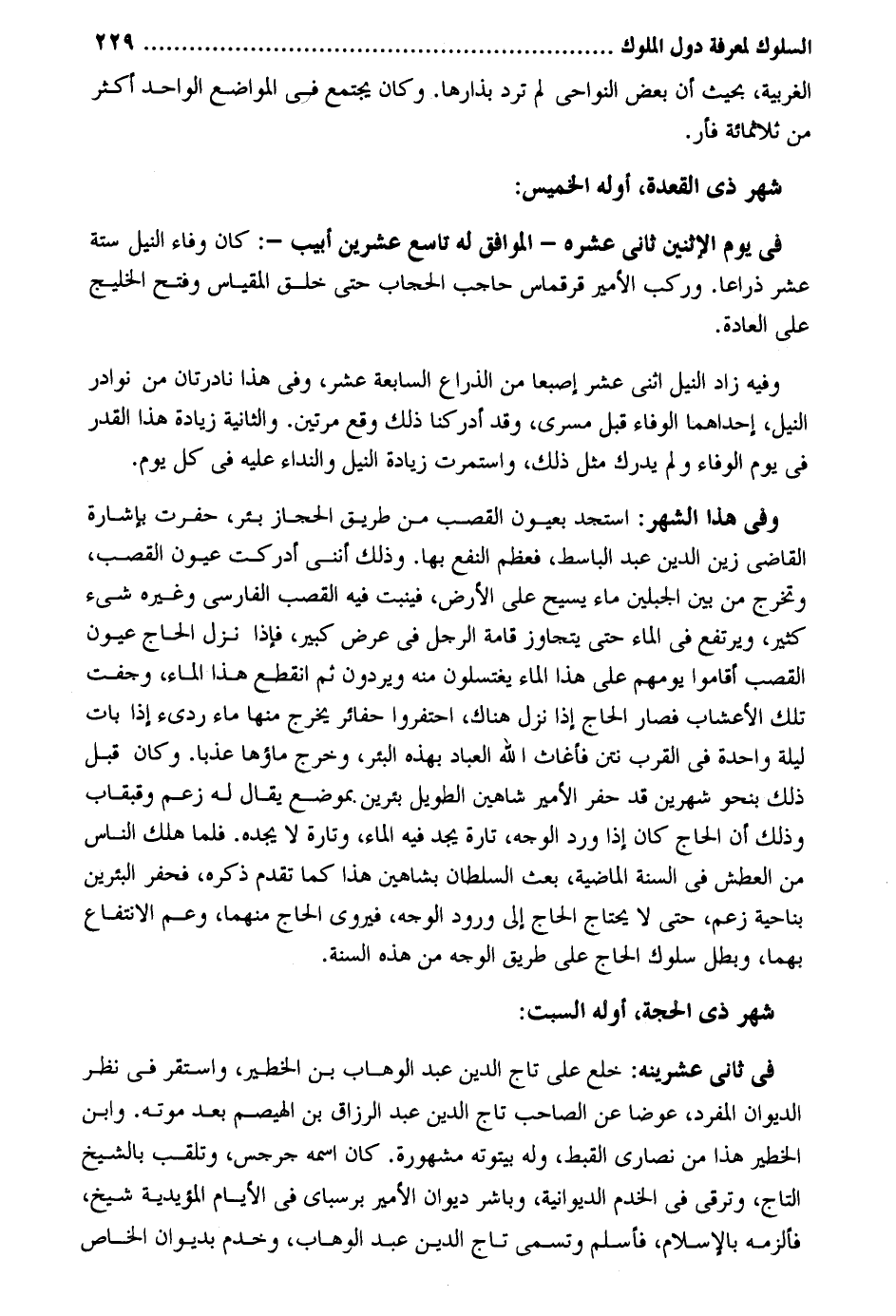 الغربية بِحَيْثُ أَن بعض النواحي لم ترد بذارها وَكَانَ يجْتَمع فِي الْمَوَاضِع الْوَاحِد أَكثر من ثَلَاثمِائَة فأر. فِي يَوْم الِاثْنَيْنِ ثَانِي عشره - الْمُوَافق لَهُ تَاسِع عشْرين أبيب -: كَانَ وَفَاء النّيل سِتَّة عشر ذِرَاعا. وَركب الْأَمِير قرقماس حَاجِب الْحجاب حَتَّى خلق المقياس وَفتح الخليج على الْعَادة. وَفِيه زَاد النّيل اثْنَي عشر إصبعاً من الذِّرَاع السَّابِعَة عشر وَفِي هَذَا نادرتان من نَوَادِر النّيل إِحْدَاهمَا الْوَفَاء قبل مسرى وَقد أدركنا ذَلِك وَقع مرَّتَيْنِ. وَالثَّانيَِة زِيَادَة هَذَا الْقدر فِي يَوْم الْوَفَاء وَلم يدْرك مثل ذَلِك واستمرت زِيَادَة النّيل والنداء عَلَيْهِ فِي كل يَوْم. وَفِي هَذَا الشَّهْر: استجد بعيون الْقصب من طَرِيق الْحجاز بِئْر حفرت بِإِشَارَة القَاضِي زين الدّين عبد الباسط فَعظم النَّفْع بهَا. وَذَلِكَ أنني أدْركْت عُيُون الْقصب وَتخرج من بَين الجبلين مَاء يسيح على الأَرْض فينبت فِيهِ الْقصب الْفَارِسِي وَغَيره شَيْء كثير ويرتفع فِي المَاء حَتَّى يتَجَاوَز قامة الرجل فِي عرض كَبِير فَإِذا نزل الْحَاج عُيُون الْقصب أَقَامُوا يومهم على هَذَا المَاء يغتسلون مِنْهُ ويردون ثمَّ انْقَطع هَذَا المَاء وجفت تِلْكَ الأعشاب فَصَارَ الْحَاج إِذا نزل هُنَاكَ احتفروا حفائر يخرج مِنْهَا مَاء رَدِيء إِذا بَات لَيْلَة وَاحِدَة فِي الْقرب نَتن فأغاث الله الْعباد بِهَذِهِ الْبِئْر وَخرج مَاؤُهَا عذباً. وَكَانَ قبل ذَلِك بِنَحْوِ شَهْرَيْن قد حفر الْأَمِير شاهين الطَّوِيل بئرين بِموضع يُقَال لَهُ زعم وقبقاب وَذَلِكَ أَن الْحَاج كَانَ إِذا ورد الْوَجْه تَارَة يجد فِيهِ المَاء وَتارَة لَا يجده. فَلَمَّا هلك النَّاس من الْعَطش فِي السّنة الْمَاضِيَة بعث السُّلْطَان بشاهين هَذَا كَمَا تقدم ذكره فحفر البئرين بِنَاحِيَة زعم حَتَّى لَا يحْتَاج الْحَاج إِلَى وُرُود الْوَجْه فيروي الْحَاج مِنْهُمَا وَعم الِانْتِفَاع بهما وَبَطل سلوك الْحَاج على طَرِيق الْوَجْه من هَذِه السّنة. شهر ذِي الْحجَّة أَوله السبت: فِي ثَانِي عشرينه: خلع على تَاج الدّين عبد الْوَهَّاب بن الخطير وَاسْتقر فِي نظر الدِّيوَان الْمُفْرد عوضا عَن الصاحب تَاج الدّين عبد الرَّزَّاق بن الهيصم بعد مَوته. وَابْن الخطير هَذَا من نَصَارَى القبط وَله بيتوته مَشْهُورَة. كَانَ اسْمه جرجس وتلقب بالشيخ التَّاج وترقى فِي الخدم الديوانية وباشر ديوَان الْأَمِير برسباي فِي الْأَيَّام المؤيدية شيخ فألزمه بِالْإِسْلَامِ فَأسلم وَتسَمى تَاج الدّين عبد الْوَهَّاب وخدم بديوان الْخَاص