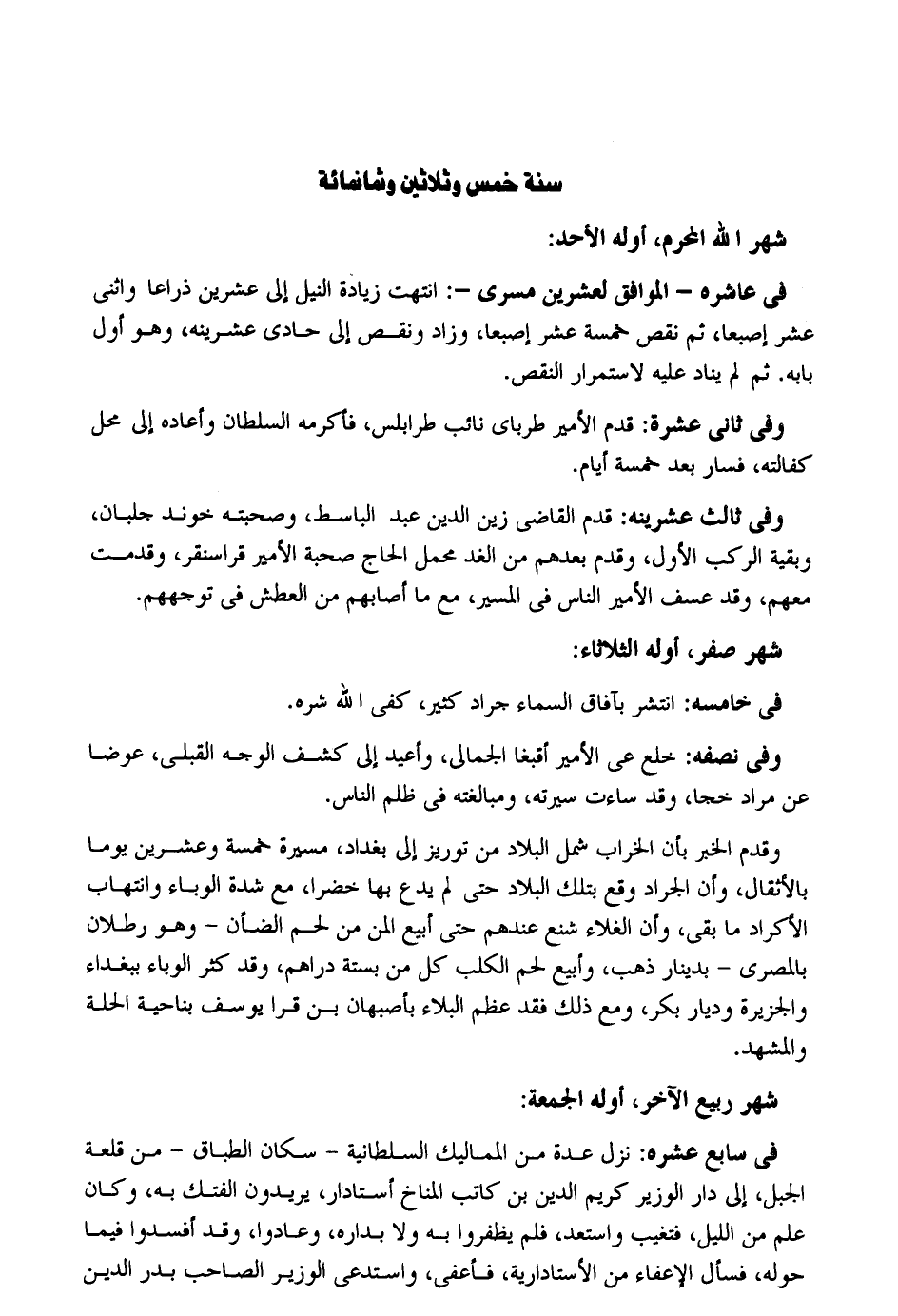 شهر الله الْمحرم أَوله الْأَحَد: فِي عاشره - الْمُوَافق لعشرين مسرى -: انْتَهَت زِيَادَة النّيل إِلَى عشْرين ذِرَاعا واثني عشر إصبعاً ثمَّ نقص خَمْسَة عشر إصبعاً وَزَاد وَنقص إِلَى حادي عشرينه وَهُوَ أول بَابه. ثمَّ لم يناد عَلَيْهِ لاستمرار النَّقْص. وَفِي ثَانِي عشرَة: قدم الْأَمِير طرباي نَائِب طرابلس فَأكْرمه السُّلْطَان وَأَعَادَهُ إِلَى مَحل كفَالَته فَسَار بعد خَمْسَة أَيَّام. وَفِي ثَالِث عشرينه: قدم القَاضِي زين الدّين عبد الباسط وصحبته خوند جلبان وَبَقِيَّة الركب الأول وَقدم بعدهمْ من الْغَد محمل الْحَاج صُحْبَة الْأَمِير قرا سنقر وقدمت مَعَهم وَقد عسف الْأَمِير النَّاس فِي الْمسير مَعَ مَا أَصَابَهُم من الْعَطش فِي توجههم. شهر صفر أَوله الثُّلَاثَاء: فِي خامسه: انْتَشَر بآفاق السَّمَاء جَراد كثير كفى الله شَره. وَفِي نصفه: خلع على الْأَمِير أقبغا الجمالي وأعيد إِلَى كشف الْوَجْه القبلي عوضا عَن مُرَاد وَقدم الْخَبَر بِأَن الخراب شَمل الْبِلَاد من توريز إِلَى بَغْدَاد مسيرَة خَمْسَة وَعشْرين يَوْمًا بالأثقال وَأَن الْجَرَاد وَقع بِتِلْكَ الْبِلَاد حَتَّى لم يدع بهَا خضرًا مَعَ شدَّة الوباء وانتهاب الأكراد مَا بَقِي وَأَن الغلاء شنع عِنْدهم حَتَّى أبيع الْمَنّ من لحم الضَّأْن - وَهُوَ رطلان بالمصري - بِدِينَار ذهب وأبيع لحم الْكَلْب كل من بِسِتَّة دَرَاهِم وَقد كثر الوباء بِبَغْدَاد والجزيرة وديار بكر وَمَعَ ذَلِك فقد عظم الْبلَاء بأصبهان بن قرا يُوسُف بِنَاحِيَة الْحلَّة والمشهد. شهر ربيع الآخر أَوله الْجُمُعَة: فِي سَابِع عشره: نزل عدَّة من المماليك السُّلْطَانِيَّة - سكان الطباق - من قلعة الْجَبَل إِلَى دَار الْوَزير كريم الدّين بن كَاتب المناخ أستادار يُرِيدُونَ الفتك بِهِ وَكَانَ علم من اللَّيْل فتغيب واستعد فَلم يظفروا بِهِ وَلَا بداره وعادوا وَقد أفسدوا فِيمَا حوله فَسَأَلَ الإعفاء من الأستادارية فأعفى واستدعى الْوَزير صَاحب بدر الدّين