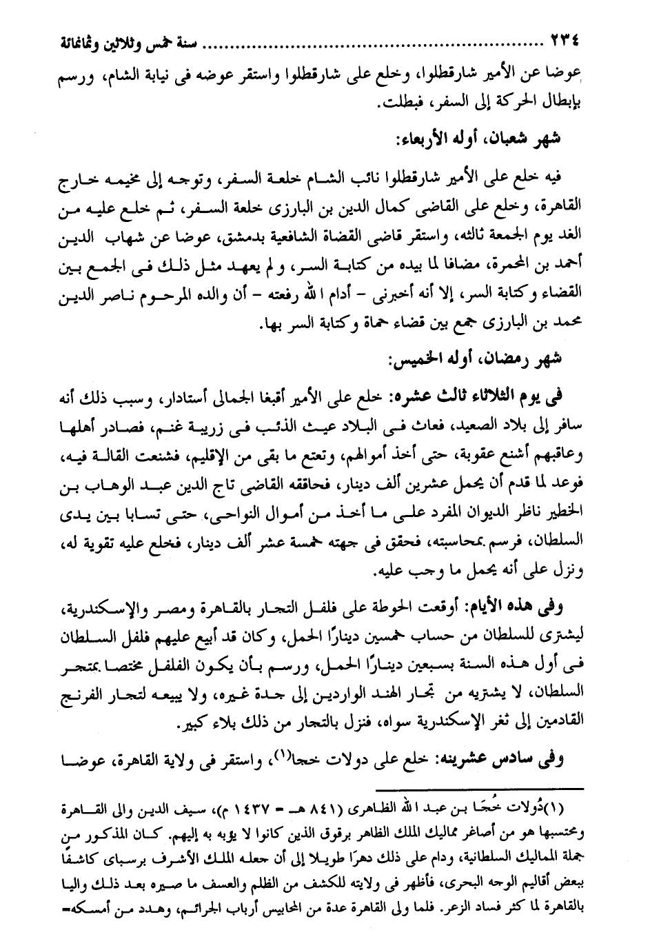 عوضا عَن الْأَمِير شارقطلوا وخلع على شارقطلوا وَاسْتقر عوضه فِي نِيَابَة الشَّام ورسم بِإِبْطَال الْحَرَكَة إِلَى السّفر فبطلت. شهر شعْبَان أَوله الْأَرْبَعَاء: فِيهِ خلع على الْأَمِير شارقطلوا نَائِب الشَّام خلعة السّفر وَتوجه إِلَى مخيمه خَارج الْقَاهِرَة وخلع على القَاضِي كَمَال الدّين بن الْبَارِزِيّ خلعة السّفر ثمَّ خلع عَلَيْهِ من الْغَد يَوْم الْجُمُعَة ثالثه وَاسْتقر قَاضِي الْقُضَاة الشَّافِعِيَّة بِدِمَشْق عوضا عَن شهَاب الدّين أَحْمد بن المحمرة مُضَافا لما بِيَدِهِ من كِتَابَة السِّرّ وَلم يعْهَد مثل ذَلِك فِي الْجمع بَين الْقَضَاء وَكِتَابَة السِّرّ إِلَّا أَنه أَخْبرنِي - أدام الله رفعته - أَن وَالِده المرحوم نَاصِر الدّين مُحَمَّد بن الْبَارِزِيّ جمع بَين قَضَاء حماة وَكِتَابَة السِّرّ بهَا. شهر رَمَضَان أَوله الْخَمِيس: فِي يَوْم الثُّلَاثَاء ثَالِث عشره: خلع على الْأَمِير أقبغا الجمالي أستادار وَسبب ذَلِك أَنه سَافر إِلَى بِلَاد الصَّعِيد فعاث فِي الْبِلَاد عيث الذِّئْب فِي زريبة غنم فصادر أَهلهَا وعاقبهم أشنع عُقُوبَة حَتَّى أَخذ أَمْوَالهم وتعتع مَا بَقِي من الإقليم فشنعت القالة فِيهِ فوعد لما قدم أَن يحمل عشْرين ألف دِينَار فحاققه القَاضِي تَاج الدّين عبد الْوَهَّاب بن الخطير نَاظر الدِّيوَان الْمُفْرد على مَا أَخذ من أَمْوَال النواحي حَتَّى تسابا بَين يَدي السُّلْطَان فرسم بمحاسبته فحقق فِي جِهَته خَمْسَة عشر ألف دِينَار فَخلع عَلَيْهِ تَقْوِيَة لَهُ وَنزل على أَنه يحمل مَا وَجب عَلَيْهِ. وَفِي هَذِه الْأَيَّام: أوقعت الحوطة على فلفل التُّجَّار بِالْقَاهِرَةِ ومصر والإسكندرية ليَشْتَرِي للسُّلْطَان من حِسَاب خمسين دِينَارا الْحمل وَكَانَ قد أبيع عَلَيْهِم فلفل السُّلْطَان فِي أول هَذِه السّنة بسبعين دِينَارا الْحمل ورسم بِأَن يكون الفلفل مُخْتَصًّا بمتجر السُّلْطَان لَا يَشْتَرِيهِ من تجار الْهِنْد الواردين إِلَى جدة غَيره وَلَا يَبِيعهُ لتجار الفرنج القادمين إِلَى ثغر الْإسْكَنْدَريَّة سواهُ فَنزل بالتجار من ذَلِك بلَاء كَبِير. وَفِي سادس عشرينه: خلع على دولات خجا وَاسْتقر فِي ولَايَة الْقَاهِرَة عوضا