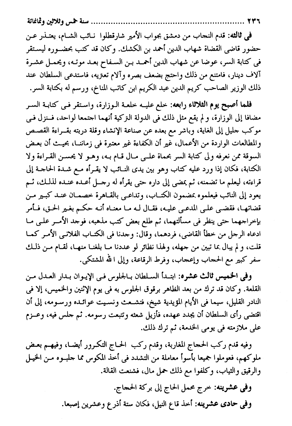 فِي ثالثه: قدم النجاب من دمشق بِجَوَاب الْأَمِير شارقطلوا نَائِب الشَّام يعْتَذر عَن حُضُور قَاضِي الْقُضَاة شهَاب الدّين أَحْمد بن الكشك. وَكَانَ قد كتب بِحُضُورِهِ ليستقر فِي كِتَابَة السِّرّ عوضا عَن شهَاب الدّين أَحْمد بن السفاح بعد مَوته وَيحمل عشرَة آلَاف دِينَار فَامْتنعَ من ذَلِك وَاحْتج بِضعْف بَصَره وآلام تعتريه فاستدعى السُّلْطَان عِنْد ذَلِك الْوَزير الصاحب كريم الدّين عبد الْكَرِيم ابْن كَاتب المناخ ورسم لَهُ بِكِتَابَة السِّرّ. فَلَمَّا أصبح يَوْم الثُّلَاثَاء رابعه: خلع عَلَيْهِ خلعة الوزارة وَاسْتقر فِي كِتَابَة السِّرّ مُضَافا إِلَى الوزارة وَلم يَقع مثل ذَلِك فِي الدولة التركية أَنَّهُمَا اجْتمعَا لوَاحِد فَنزل فِي موكب جليل إِلَى الْغَايَة وباشر مَعَ بعده عَن صناعَة الْإِنْشَاء وَقلة دربته بِقِرَاءَة الْقَصَص والمطالعات الْوَارِدَة من الْأَعْمَال غير أَن الْكَفَاءَة غير مُعْتَبرَة فِي زَمَاننَا بِحَيْثُ أَن بعض السوقة مِمَّن نعرفه ولي كِتَابَة السِّرّ بحماة على مَال قَامَ بِهِ وَهُوَ لَا يحسن الْقِرَاءَة وَلَا الْكِتَابَة فَكَانَ إِذا ورد عَلَيْهِ كتاب وَهُوَ بَين يَدي النَّائِب لَا يقرأه مَعَ شدَّة الْحَاجة إِلَى قِرَاءَته ليعلم مَا تضمنه ثمَّ يمْضِي إِلَى دَاره حَتَّى يقرأه لَهُ رجل أعده عِنْده لذَلِك ثمَّ يعود إِلَى النَّائِب فيعلموه بمضمون الْكتاب وتداعى بِالْقَاهِرَةِ خصمان عِنْد كَبِير من قضاتها فقضي على الْمُدَّعِي عَلَيْهِ فَقَالَ لَهُ مَا مَعْنَاهُ أَنه حكم بِغَيْر الْحق فَأمر بإخراجهما حَتَّى ينظر فِي مسألتهما ثمَّ طلع بعض كتب مذْهبه فَوجدَ الْأَمر على مَا ادَّعَاهُ الرجل من خطأ القَاضِي فردهما وَقَالَ: وجدنَا فِي الْكتاب الْفُلَانِيّ الْأَمر كَمَا قلت وَلم يبال بِمَا تبين من جَهله وَلِهَذَا نَظَائِر لَو عددنا مَا بلغنَا مِنْهَا لقام من ذَلِك سفر كَبِير مَعَ الْحجاب وَإِعْجَاب وفرط الرقاعة وَإِلَى الله المشتكى. وَفِي الْخَمِيس ثَالِث عشره: ابْتَدَأَ السُّلْطَان بِالْجُلُوسِ فِي الإيوان بدار الْعدْل من القلعة. وَكَانَ قد ترك من بعد الظَّاهِر برقوق الْجُلُوس بِهِ فِي يَوْم الِاثْنَيْنِ وَالْخَمِيس إِلَّا فِي النَّادِر الْقَلِيل سِيمَا فِي الْأَيَّام المؤيدية شيخ فتشعث ونسبت عوائده ورسومه إِلَى أَن اقْتضى رأى السُّلْطَان أَن يجدد عَهده فأزيل شعثه وتتبعت رسومه. ثمَّ جلس فِيهِ وعزم على ملازمته فِي يومي الْخدمَة ثمَّ ترك ذَلِك. وَفِيه قدم ركب الْحجَّاج المغاربة وَقدم ركب الْحَاج التكرور أَيْضا وَفِيهِمْ بعض مُلُوكهمْ فعوملوا جَمِيعًا بِأَسْوَأ مُعَاملَة من التشدد فِي أَخذ المكوس مِمَّا جلبوه من الْخَيل وَالرَّقِيق وَالثيَاب وكلفوا مَعَ ذَلِك حمل مَال فشنعت القالة. وَفِي عشرينه: خرج محمل الْحَاج إِلَى بركَة الْحجَّاج. وَفِي حادي عشرينه: أَخذ قاع النّيل فَكَانَ سِتَّة أَذْرع وَعشْرين إصبعاً.