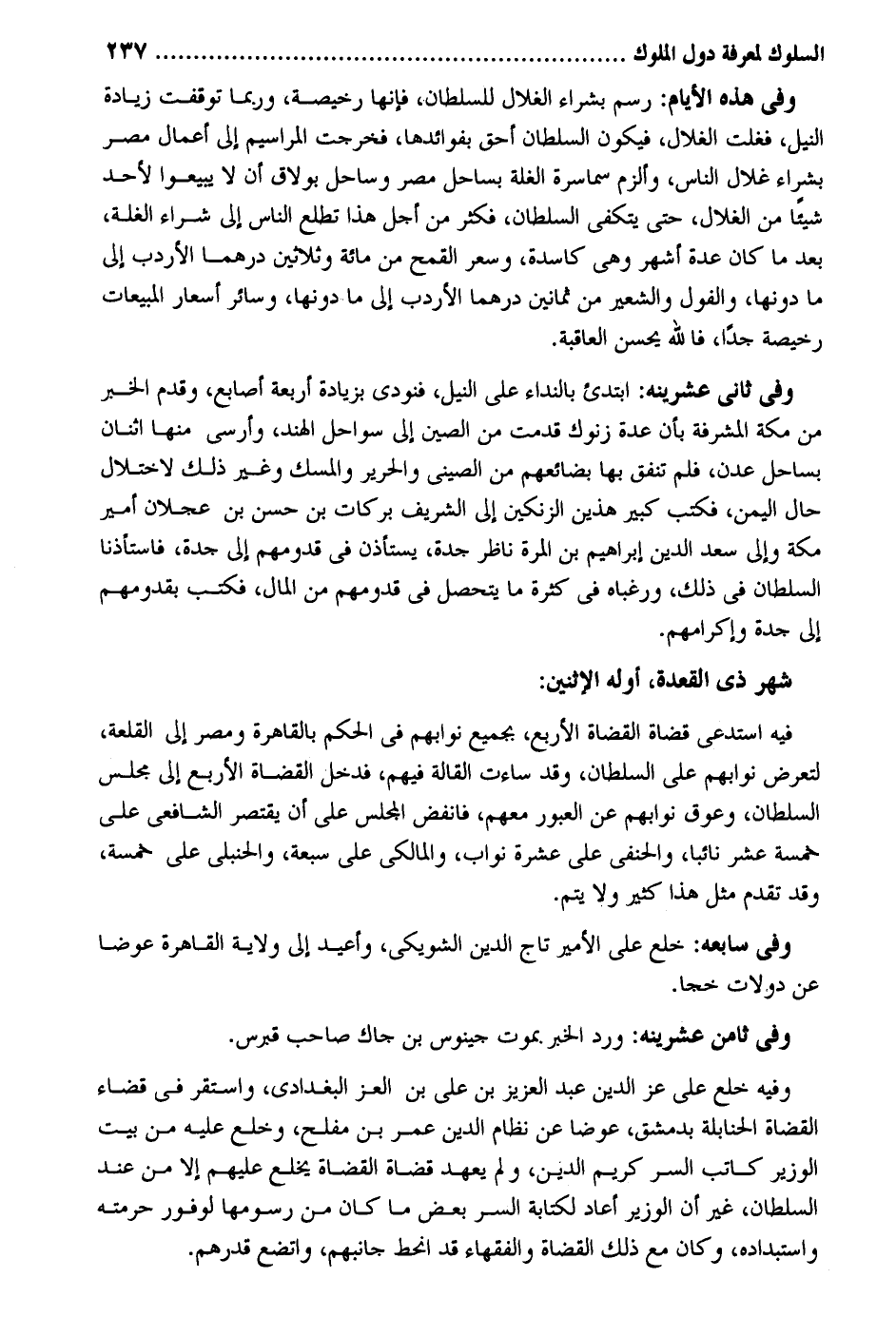 وَفِي هَذِه الْأَيَّام: رسم بشرَاء الغلال للسُّلْطَان فَإِنَّهَا رخيصة وَرُبمَا توقفت زِيَادَة النّيل فغلت الغلال فَيكون السُّلْطَان أَحَق بفوائدها فَخرجت المراسيم إِلَى أَعمال مصر بشرَاء غلال النَّاس وألزم سماسرة الْغلَّة بساحل مصر وساحل بولاق أَن لَا يبيعوا لأحد شَيْئا من الغلال حَتَّى يتكفي السُّلْطَان فَكثر من أجل هَذَا تطلع النَّاس إِلَى شِرَاء الْغلَّة مَا كَانَ عدَّة أشهر وَهِي كاسدة وسعر الْقَمْح من مائَة وَثَلَاثِينَ درهما الأردب إِلَى مَا دونهَا والفول وَالشعِير من ثَمَانِينَ درهما الأردب إِلَى مَا دونهَا وَسَائِر أسعار المبيعات رخيصة جدا فَالله يحسن الْعَاقِبَة. وَفِي ثَانِي عشرينه: ابتدئ بالنداء على النّيل فَنُوديَ بِزِيَادَة أَرْبَعَة أَصَابِع وَقدم الْخَبَر من مَكَّة المشرفة بِأَن عدَّة زنوك قدمت من الصين إِلَى سواحل الْهِنْد وأرسى مِنْهَا اثْنَان بساحل عدن فَلم تنْفق بهَا بضائعهم من الصيني وَالْحَرِير والمسك وَغير ذَلِك لاختلال حَال الْيمن فَكتب كَبِير هذَيْن الزنكين إِلَى الشريف بَرَكَات بن حسن بن عجلَان أَمِير مَكَّة وَإِلَى سعد الدّين إِبْرَاهِيم بن الْمرة نَاظر جدة يسْتَأْذن فِي قدومهم إِلَى جدة فَاسْتَأْذَنا السُّلْطَان فِي ذَلِك ورغباه فِي كَثْرَة مَا يتَحَصَّل فِي قدومهم من المَال فَكتب بقدومهم إِلَى جدة وإكرامهم. شهر ذِي الْقعدَة أَوله الِاثْنَيْنِ: فِيهِ استدعى قُضَاة الْقُضَاة الْأَرْبَع بِجَمِيعِ نوابهم فِي الحكم بِالْقَاهِرَةِ ومصر إِلَى القلعة لتعرض نوابهم على السُّلْطَان وَقد ساءت القالة فيهم فَدخل الْقُضَاة الْأَرْبَع إِلَى مجْلِس السُّلْطَان وعوق نوابهم عَن العبور مَعَهم فانفض الْمجْلس على أَن يقْتَصر الشَّافِعِي على خَمْسَة عشر نَائِبا والحنفي على عشرَة نواب والمالكي على سَبْعَة والحنبلي على خَمْسَة وَقد تقدم مثل هَذَا كثير وَلَا يتم. وَفِي سابعه: خلع على الْأَمِير تَاج الدّين الشويكي وأعيد إِلَى ولَايَة الْقَاهِرَة عوضا عَن دولات خجا. وَفِي ثامن عشرينه: ورد الْخَبَر بِمَوْت جينوس بن جاك صَاحب قبرس. وَفِيه خلع على عز الدّين عبد الْعَزِيز بن عَليّ بن الْعِزّ الْبَغْدَادِيّ وَاسْتقر فِي قَضَاء الْقُضَاة الْحَنَابِلَة بِدِمَشْق عوضا عَن نظام الدّين عمر بن مُفْلِح وخلع عَلَيْهِ من بَيت الْوَزير كَاتب السِّرّ كريم الدّين وَلم يعْهَد قُضَاة الْقُضَاة يخلع عَلَيْهِم إِلَّا من عِنْد السُّلْطَان غير أَن الْوَزير أعَاد لكنابة السِّرّ بعض مَا كَانَ من رسومها لوفور حرمته واستبداده وَكَانَ مَعَ ذَلِك الْقُضَاة وَالْفُقَهَاء قد انحط جانبهم واتضع قدرهم.