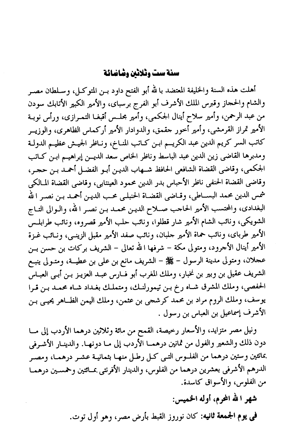 أهلت هَذِه السّنة والخليفة المعتضد بِاللَّه أَبُو الْفَتْح دَاوُد بن المتَوَكل وسلطان مصر وَالشَّام والحجاز وقبرس الْملك الْأَشْرَف أَبُو الْفرج برسباي والأمير الْكَبِير الأتابك سودن من عبد الرَّحْمَن وأمير سلَاح أينال الجكمي وأمير مجْلِس أقبغا التمرازي وَرَأس نوبَة الْأَمِير تمراز القرمشي وأمير أخور جقمق والدوادار الْأَمِير أركماس الظَّاهِرِيّ والوزير كَاتب السِّرّ كريم الدّين عبد الْكَرِيم ابْن كَاتب المناخ وناظر الْجَيْش عَظِيم الدولة ومدبرها القَاضِي زين الدّين عبد الباسط وناظر الْخَاص سعد الدّين إِبْرَاهِيم ابْن كَاتب الجكمي وقاضي الْقُضَاة الشَّافِعِي الْحَافِظ شهَاب الدّين أَبُو الْفضل أَحْمد بن حجر وقاضي الْقُضَاة الْحَنَفِيّ نَاظر الأحباس بدر الدّين مَحْمُود العينتابي وقاضي الْقُضَاة الْمَالِكِي شمس الدّين مُحَمَّد الْبِسَاطِيّ وقاضي الْقُضَاة الْحَنْبَلِيّ محب الدّين أَحْمد بن نصر الله الْبَغْدَادِيّ والمحتسب الْأَمِير الْحَاجِب صَلَاح الدّين مُحَمَّد بن نصر الله والوالي التَّاج الشويكي ونائب الشَّام الْأَمِير شار قطلوا ونائب حلب الْأَمِير قصروه ونائب طرابلس الْأَمِير طرباي ونائب حماة الْأَمِير جلبان ونائب صفد الْأَمِير مقبل الزيني ونائب غَزَّة الْأَمِير أينال الأجرود ومتولي مَكَّة - شرفها الله تَعَالَى - الشريف بَرَكَات بن حسن بن عجلَان ومتولي مَدِينَة الرَّسُول - صلى الله عَلَيْهِ وَسلم - الشريف مَانع بن عَليّ بن عَطِيَّة ومتولي يَنْبع الشريف عقيل بن وبير بن نخبار وَملك الْمغرب أَبُو فَارس عبد الْعَزِيز بن أبي الْعَبَّاس الحفصي وَملك الْمشرق شاه رخ بن تيمورلنك ومتملك بَغْدَاد شاه مُحَمَّد بن قرا يُوسُف وَملك الرّوم مُرَاد بن مُحَمَّد كرشجي بن عُثْمَان وَملك الْيمن الظَّاهِر يحيى بن الْأَشْرَف إِسْمَاعِيل بن الْعَبَّاس بن رَسُول. ونيل مصر متزايد والأسعار رخيصة الْقَمْح من مائَة وَثَلَاثِينَ درهما الأردب إِلَى مَا دون ذَلِك وَالشعِير والفول من ثَمَانِينَ درهما الأردب إِلَى مَا دونهَا. وَالدِّينَار الأشرفي بمائتين وَسِتِّينَ درهما من الْفُلُوس الَّتِي كل رَطْل مِنْهَا بِثمَانِيَة عشر درهما ومصر الدِّرْهَم الأشرفي بِعشْرين درهما من الْفُلُوس وَالدِّينَار الأفرنتي بمائتين وَخمسين درهما من الْفُلُوس والأسواق كاسدة. شهر الله الْمحرم أَوله الْخَمِيس: فِي يَوْم الْجُمُعَة ثَانِيه: كَانَ نوروز القبط بِأَرْض مصر وَهُوَ أول توت.