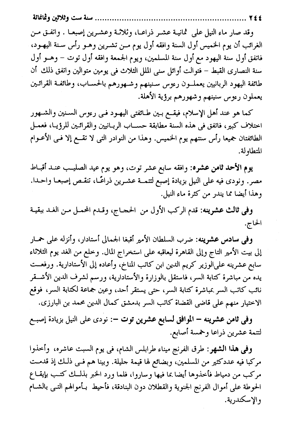 وَقد صَار مَاء النّيل على ثَمَانِيَة عشر ذِرَاعا وَثَلَاثَة وَعشْرين إصبعاً. وَاتفقَ من الغرائب أَن يَوْم الْخَمِيس أول السّنة وَافقه أول يَوْم من تشرين وَهُوَ رَأس سنة الْيَهُود فاتفق أول سنة الْيَهُود مَعَ أول سنة الْمُسلمين وَيَوْم الْجُمُعَة وَافقه أول توت - وَهُوَ أول سنة النَّصَارَى القبط - فتوالت أَوَائِل سِنِين الْملَل الثَّلَاث فِي يَوْمَيْنِ متوالين وَاتفقَ ذَلِك أَن طَائِفَة الْيَهُود الربانيين يعْملُونَ رُءُوس سنينهم وشهورهم بِالْحِسَابِ وَطَائِفَة القرائين يعْملُونَ رُءُوس سنينهم وشهورهم بِرُؤْيَة الْأَهِلّة. كَمَا هُوَ عِنْد أهل الْإِسْلَام فَيَقَع بَين طائفتي الْيَهُود فِي رُءُوس السنين والشهور اخْتِلَاف كَبِير فاتفق فِي هَذِه السّنة مُطَابقَة حِسَاب الربانيين والقرائين للرؤيا فَعمل الطائفتان جَمِيعًا رَأس سنتهمْ يَوْم الْخَمِيس. وَهَذَا من النَّوَادِر الَّتِي لَا تقع إِلَّا فِي الأعوام المتطاولة. يَوْم الْأَحَد ثامن عشره: وَافقه سَابِع عشر توت وَهُوَ يَوْم عيد الصَّلِيب عِنْد أقباط مصر. وَنُودِيَ فِيهِ على النّيل بِزِيَادَة إِصْبَع لتتمة عشْرين ذِرَاعا تنقص إصبعاً وَاحِدًا. وَهَذَا أَيْضا مِمَّا ينْدر من كَثْرَة مَاء النّيل. وَفِي ثَالِث عشرينه: قدم الركب الأول من الْحجَّاج وَقدم الْمحمل من الْغَد بِبَقِيَّة الْحَاج. وَفِي سادس عشرينه: ضرب السُّلْطَان الْأَمِير أقبغا الجمالي أستادار وأنزله على حمَار إِلَى ييت الْأَمِير التَّاج وَالِي الْقَاهِرَة ليعاقبه على اسْتِخْرَاج المَال. وخلع من الْغَد يَوْم الثُّلَاثَاء سَابِع عشرينه على الْوَزير كريم الدّين ابْن كَاتب المناخ وَأَعَادَهُ إِلَى الأستادارية. وَرفعت يَده من مُبَاشرَة كِتَابَة السِّرّ فاستقل بالوزارة والأستادارية ورسم لشرف الدّين الْأَشْقَر نَائِب كَاتب السِّرّ بِمُبَاشَرَة كِتَابَة السِّرّ حَتَّى يسْتَقرّ أحد وَعين جمَاعَة لكتابة السِّرّ فَوَقع الِاخْتِيَار مِنْهُم على قَاضِي وَفِي ثامن عشرينه - الْمُوَافق لسابع عشْرين توت -: نُودي على النّيل بِزِيَادَة إِصْبَع لتتمة عشْرين ذِرَاعا وَخَمْسَة أَصَابِع. وَفِي هَذَا الشَّهْر: طرق الفرنج ميناء طرابلس الشَّام فِي يَوْم السبت عاشره وَأخذُوا مركبا فِيهِ عدد كثير من الْمُسلمين وبضائع لَهَا قيمَة جليلة. وَبينا هم فِي ذَلِك إِذْ قدمت مركب من دمياط فَأَخَذُوهَا أَيْضا بِمَا فِيهَا وَسَارُوا فَلَمَّا ورد الْخَبَر بذلك كتب بإيقاع الحوطة على أَمْوَال الفرنج الجنوية والقطلان دون البنادقة فأحيط بِأَمْوَالِهِمْ الَّتِي بِالشَّام والإسكندرية.