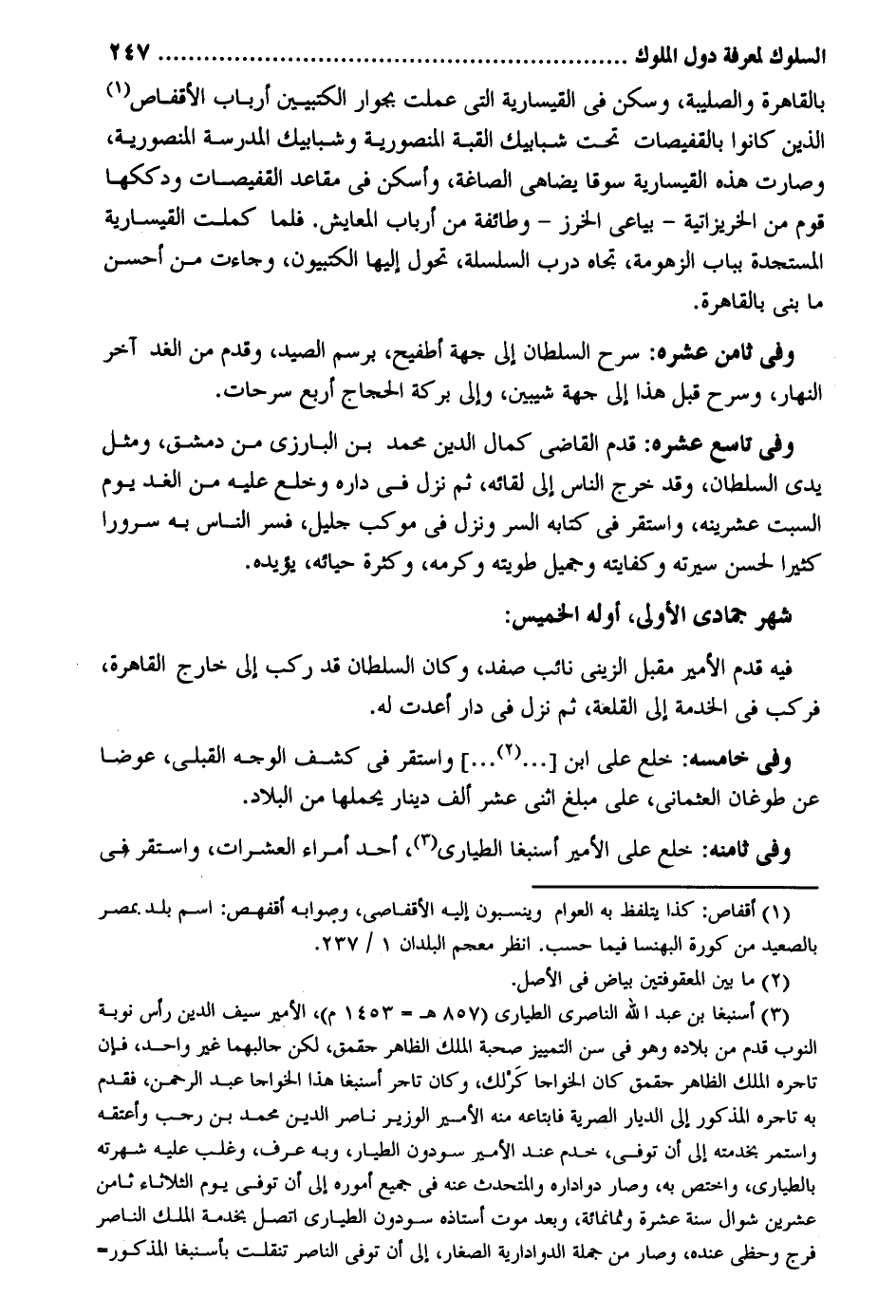 بِالْقَاهِرَةِ والصليبة وَسكن فِي القيسارية الَّتِي عملت بجوار الكتبيين أَرْبَاب الأقفاص الَّذين كَانُوا بالقفيصات تَحت شبابيك الْقبَّة المنصورية وشبابيك الْمدرسَة المنصورية وَصَارَت هَذِه القيسارية سوقاً يضاهي الصاغة وأسكن فِي مقاعد القفيصات ودككها قوم من الخريزاتية - بياعي الخرز - وَطَائِفَة من أَرْبَاب المعايش. فَلَمَّا كملت القيسارية المستجدة بِبَاب الزهومة تجاه درب السلسلة تحول إِلَيْهَا الكتبيون وَجَاءَت من أحسن مَا بني بِالْقَاهِرَةِ. وَفِي ثامن عشره: سرح السُّلْطَان إِلَى جِهَة أطفيح برسم الصَّيْد وَقدم من الْغَد آخر النَّهَار وسرح قبل هَذَا إِلَى جِهَة شيبين وَإِلَى بركَة الْحجَّاج أَربع سرحات. وَفِي تَاسِع عشره: قدم القَاضِي كَمَال الدّين مُحَمَّد بن الْبَارِزِيّ من دمشق وَمثل يَدي السُّلْطَان وَقد خرج النَّاس إِلَى لِقَائِه ثمَّ نزل فِي دَاره وخلع عَلَيْهِ من الْغَد يَوْم السبت عشرينه وَاسْتقر فِي كِتَابه السِّرّ وَنزل فِي موكب جليل فسر النَّاس بِهِ سُرُورًا كثيرا لحسن سيرته وكفايته وَجَمِيل طويته وَكَرمه وَكَثْرَة حيائه يُؤَيّدهُ. شهر جُمَادَى الأولى أَوله الْخَمِيس: فِيهِ قدم الْأَمِير مقبل الزيني نَائِب صفد وَكَانَ السُّلْطَان قد ركب إِلَى خَارج الْقَاهِرَة فَركب فِي الْخدمَة إِلَى القلعة ثمَّ نزل فِي دَار أعدت لَهُ. وَفِي خامسه: خلع على ابْن ... وَاسْتقر فِي كشف الْوَجْه القبلي عوضا عَن طوغان العثماني وَفِي ثامنه: خلع على الْأَمِير أسنبغا الطياري أحد أُمَرَاء العشرات وَاسْتقر فِي
