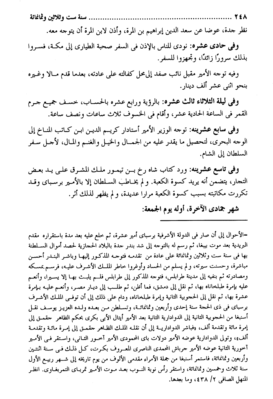 نظر جدة عوضا عَن سعد الدّين إِبْرَاهِيم بن الْمرة وَأذن لِابْنِ الْمرة أَن يتَوَجَّه مَعَه. وَفِي حادي عشره: نُودي للنَّاس بِالْإِذْنِ فِي السّفر صُحْبَة الطياري إِلَى مَكَّة فسروا بذلك سُرُورًا زَائِدا وتجهزوا للسَّفر. وَفِيه توجه الْأَمِير مقبل نَائِب صفد إِلَى مَحل كفَالَته على عَادَته بعد مَا قدم مَالا وَغَيره بِنَحْوِ اثْنَي عشر ألف دِينَار. وَفِي لَيْلَة الثُّلَاثَاء ثَالِث عشره: بِالرُّؤْيَةِ ورابع عشره بِالْحِسَابِ خسف جَمِيع جرم الْقَمَر فِي السَّاعَة الْحَادِيَة عشر وَأقَام فِي الخسوف ثَلَاث سَاعَات وَنصف سَاعَة. وَفِي سَابِع عشرينه: توجه الْوَزير الْأَمِير أستادار كريم الدّين ابْن كَاتب المناخ إِلَى الْوَجْه البحري لتَحْصِيل مَا يقدر عَلَيْهِ من الْجمال وَالْخَيْل وَالْغنم وَالْمَال لأجل سفر السُّلْطَان إِلَى الشَّام. وَفِي تَاسِع عشرينه: ورد كتاب شاه رخ بن تيمور ملك الْمشرق على يَد بعض التُّجَّار يتَضَمَّن أَنه يُرِيد كسْوَة الْكَعْبَة. وَلم يُخَاطب السُّلْطَان إِلَّا بالأمير برسباي وَقد تَكَرَّرت مُكَاتبَته بِسَبَب كسْوَة الْكَعْبَة مرَارًا عديدة وَلم يظْهر لذَلِك أثر. شهر جُمَادَى الْآخِرَة أَوله يَوْم الْجُمُعَة:
