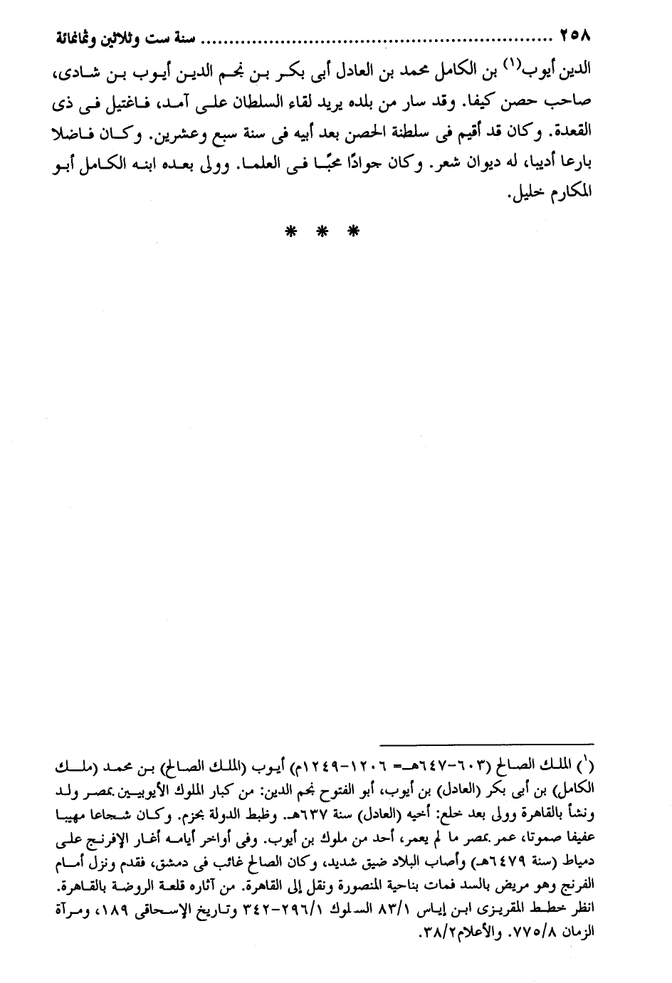 الدّين أَيُّوب بن الْكَامِل مُحَمَّد بن الْعَادِل أبي بكر بن نجم الدّين أَيُّوب بن شادي صَاحب حصن كيفا. وَقد سَار من بَلَده يُرِيد لِقَاء السُّلْطَان على آمد فاغتيل فِي ذِي الْقعدَة. وَكَانَ قد أقيم فِي سلطنة الْحصن بعد أَبِيه فِي سنة سبع وَعشْرين. وَكَانَ فَاضلا بارعاً أديباً لَهُ ديوَان شعر. وَكَانَ جواداً محباً فِي الْعلمَاء. وَولي بعده ابْنه الْكَامِل أَبُو المكارم خَلِيل.