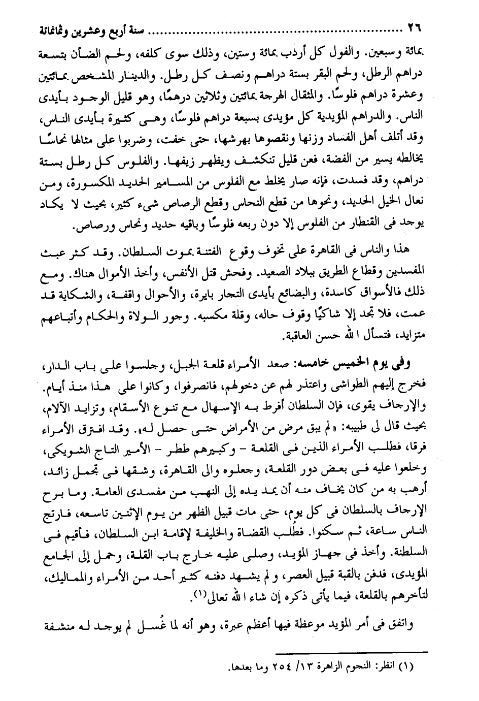 بِمِائَة وَسبعين. والفول كل أردب بِمِائَة وَسِتِّينَ وَذَلِكَ سوى كلفه وَلحم الضَّأْن بِتِسْعَة دَرَاهِم الرطل وَلحم الْبَقر بِسِتَّة دَرَاهِم وَنصف كل رَطْل. وَالدِّينَار المشخص بمائتين وَعشرَة دَرَاهِم فُلُوسًا. والمثقال الهرجة بمائتين وَثَلَاثِينَ درهما وَهُوَ قَلِيل الْوُجُود بأيدي النَّاس. وَالدَّرَاهِم المؤيدية كل مؤيدي بسبعة دَرَاهِم فُلُوسًا وَهِي كَثِيرَة بأيدي النَّاس وَقد أتلف أهل الْفساد وَزنهَا ونقصوها بهرشها حَتَّى خفت وضربوا على مثالها نُحَاسا يخالطه يسير من الْفضة فَعَن قَلِيل تنكشف وَيظْهر زيفها. والفلوس كل رَطْل بِسِتَّة دَرَاهِم وَقد فَسدتْ فَإِنَّهُ صَار يخلط مَعَ الْفُلُوس من المسامير الْحَدِيد الْمَكْسُورَة وَمن نعال الْخَيل الْحَدِيد وَنَحْوهَا من قطع النّحاس وَقطع الرصاص شَيْء كثير بِحَيْثُ لَا يكَاد يُوجد فِي القنطار من الْفُلُوس إِلَّا دون ربعه فُلُوسًا وَبَاقِيه حَدِيد ونحاس ورصاص. هَذَا وَالنَّاس فِي الْقَاهِرَة على تخوف وُقُوع الْفِتْنَة بِمَوْت السُّلْطَان. وَقد كثر عَبث المفسدين وقطاع الطَّرِيق بِبِلَاد الصَّعِيد. وفحش قتل الْأَنْفس وَأخذ الْأَمْوَال هُنَاكَ. وَمَعَ ذَلِك فالأسواق كاسدة والبضائع بأيدي التُّجَّار بايرة وَالْأَحْوَال واقفة والشكاية قد عَمت فَلَا تَجِد إِلَّا شاكياً وقُوف حَاله وَقلة مكسبه. وجور الْوُلَاة والحكام وأتباعهم متزايد فتسأل الله حسن الْعَاقِبَة. وَفِي يَوْم الْخَمِيس خامسه: صعد الْأُمَرَاء قلعة الْجَبَل وجلسوا على بَاب الدَّار فَخرج إِلَيْهِم الطواشي وَاعْتذر لَهُم عَن دُخُولهمْ فانصرفوا وَكَانُوا على هَذَا مُنْذُ أَيَّام. والإرجاف يُقَوي فَإِن السُّلْطَان أفرط بِهِ الإسهال مَعَ تنوع الأسقام وتزايد الآلام بِحَيْثُ قَالَ لي طبيبه: لم يبْق مرض من الْأَمْرَاض حَتَّى حصل لَهُ. وَقد افترق الْأُمَرَاء فرقا فَطلب الْأُمَرَاء الَّذين فِي القلعة - وَكَبِيرهمْ ططر - الْأَمِير التَّاج الشويكي وخلعوا عَلَيْهِ فِي بعض دور القلعة وجعلوه وَالِي الْقَاهِرَة وشقها فِي تجمل زَائِد أرهب بِهِ من كَانَ يخَاف مِنْهُ أَن يمد يَده إِلَى النهب من مفسدي الْعَامَّة. وَمَا برح الإرجاف بالسلطان فِي كل يَوْم حَتَّى مَاتَ قبيل الظّهْر من يَوْم الِاثْنَيْنِ تاسعه فارتج النَّاس سَاعَة ثمَّ سكنوا. فَطلب الْقُضَاة والخليفة لإِقَامَة ابْن السُّلْطَان فأقيم فِي السلطنة. وَأخذ فِي جهاز الْمُؤَيد وَصلى عَلَيْهِ خَارج بَاب الْقلَّة وَحمل إِلَى الْجَامِع المؤيدي فَدفن بالقبة قبيل الْعَصْر وَلم يشْهد دَفنه كثير أحد من الْأُمَرَاء والمماليك لتأخرهم بالقلعة فِيمَا يَأْتِي ذكره إِن شَاءَ الله تَعَالَى. وَاتفقَ فِي أَمر الْمُؤَيد موعظة فِيهَا أعظم عِبْرَة وَهُوَ أَنه لما غسل لم يُوجد لَهُ منشفة