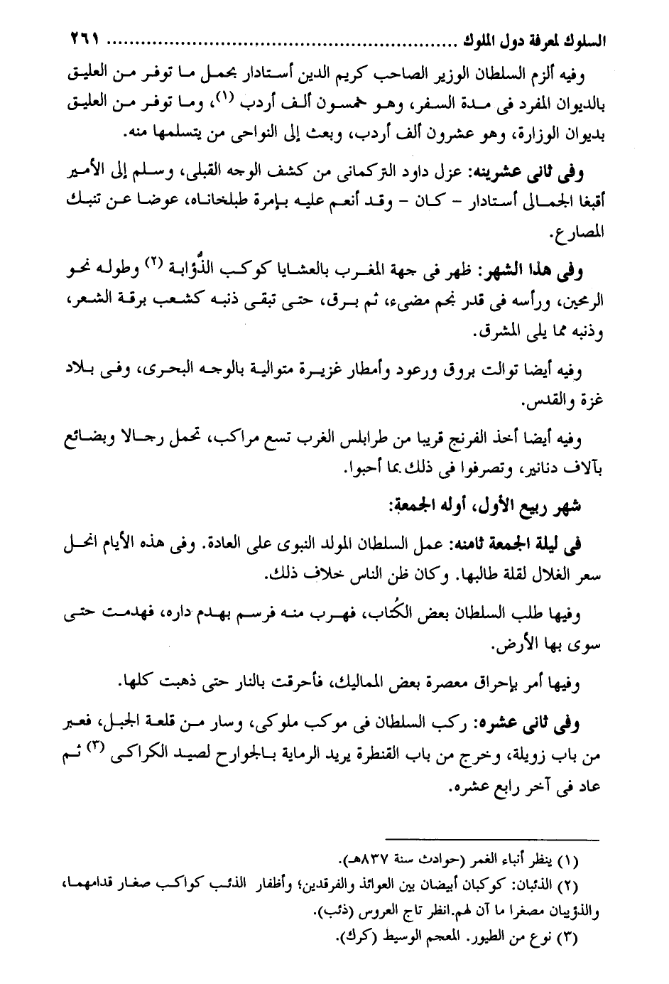 وَفِيه ألزم السُّلْطَان الْوَزير الصاحب كريم الدّين أستادار بِحمْل مَا توفر من العليق بالديوان الْمُفْرد فِي مُدَّة السّفر وَهُوَ خَمْسُونَ ألف أردب وَمَا توفر من العليق بديوان الوزارة وَهُوَ عشرُون ألف أردب وَبعث إِلَى النواحي من يتسلمها مِنْهُ. وَفِي ثَانِي عشرينه: عزل دَاوُد التركماني من كشف الْوَجْه القبلي وَسلم إِلَى الْأَمِير أقبغا الجمالي أستادار - كَانَ - وَقد أنعم عَلَيْهِ بإمرة طبلخاناه عوضا عَن تنبك المصارع. وَفِي هَذَا الشَّهْر: ظهر فِي جِهَة الْمغرب بالعشايا كَوْكَب الذؤابة وَطوله ف الرمحين وَرَأسه فِي قدر نجم مضيء ثمَّ برق حَتَّى تبقى ذَنبه كشعب برقة الشّعْر وذنبه مِمَّا يَلِي الْمشرق. وَفِيه أَيْضا توالت بروق ورعود وأمطار غزيرة مُتَوَالِيَة بِالْوَجْهِ البحري وَفِي بِلَاد غَزَّة والقدس. وَفِيه أَيْضا أَخذ الفرنج قَرِيبا من طرابلس الغرب تسع مراكب تحمل رجَالًا وبضائع بآلاف دَنَانِير وتصرفوا فِي ذَلِك بِمَا أَحبُّوا. شهر ربيع الأول أَوله الْجُمُعَة: فِي لَيْلَة الْجُمُعَة ثامنه: عمل السُّلْطَان المولد النَّبَوِيّ على الْعَادة. وَفِي هَذِه الْأَيَّام انحل سعر الغلال لقلَّة طالبها. وَكَانَ ظن النَّاس خلاف ذَلِك. وفيهَا طلب السُّلْطَان بعض الْكتاب فهرب مِنْهُ فرسم بهدم دَاره فهدمت حَتَّى سوى بهَا الأَرْض. وَفِي ثَانِي عشره: ركب السُّلْطَان فِي موكب ملوكي وَسَار من قلعة الْجَبَل فَعبر من بَاب زويلة وَخرج من بَاب القنطرة يُرِيد الرماية بالجوارح لصيد الكراكي ثمَّ عَاد فِي آخر رَابِع عشره.