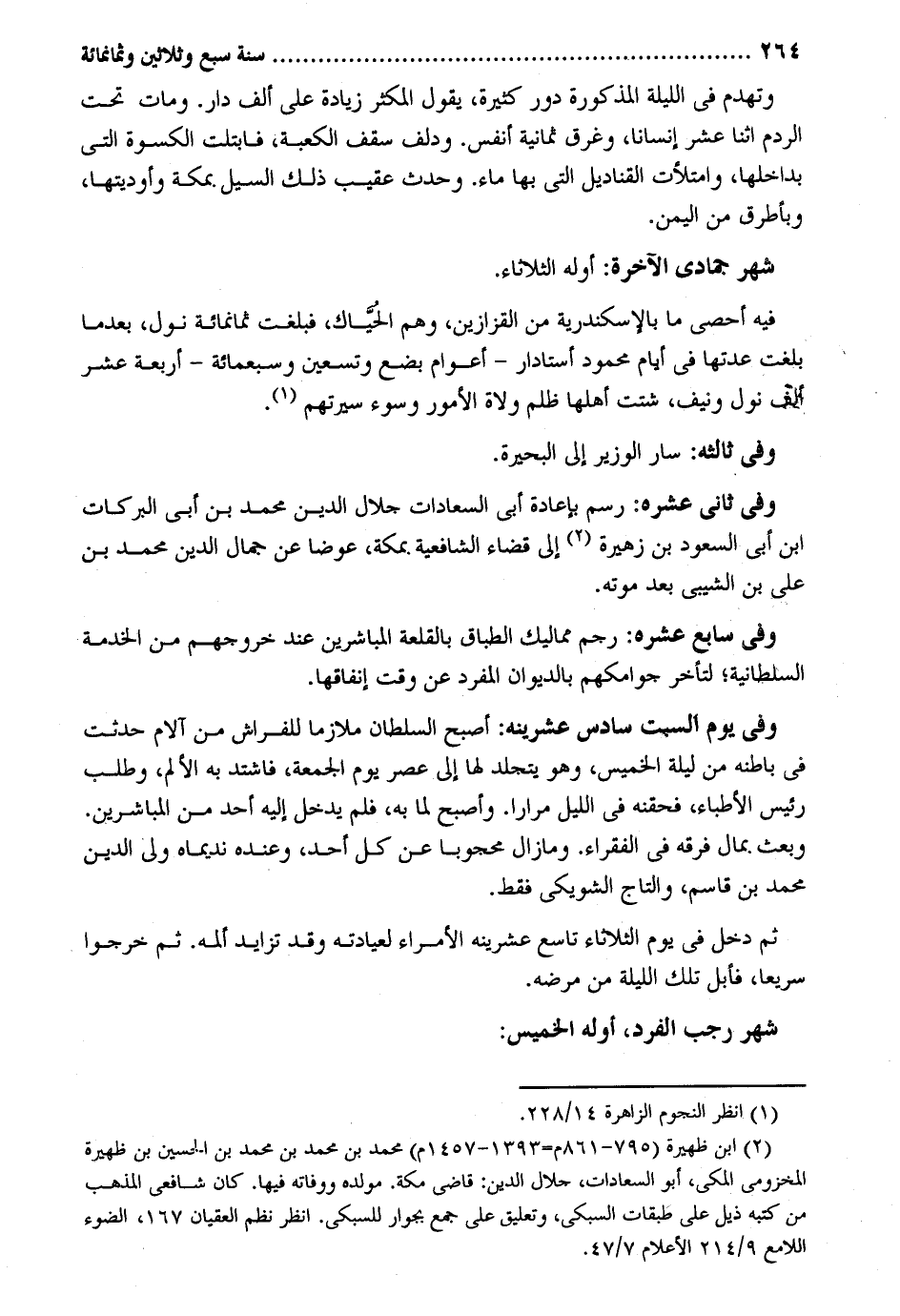 وتهدم فِي اللَّيْلَة الْمَذْكُورَة دور كَثِيرَة يَقُول المكثر زِيَادَة على ألف دَار. وَمَات تَحت الرَّدْم اثْنَا عشر إنْسَانا وغرق ثَمَانِيَة أنفس. ودلف سقف الْكَعْبَة فابتلت الْكسْوَة الَّتِي بداخلها وامتلأت الْقَنَادِيل الَّتِي بهَا مَاء. وَحدث عقيب ذَلِك السَّيْل بِمَكَّة وأوديتها وبأطرق من الْيمن. شهر جُمَادَى الْآخِرَة: أَوله الثُّلَاثَاء. فِيهِ أحصي مَا بالإسكندرية من القزازين وهم الحياك فبلغت ثَمَانمِائَة نول بعد مَا بلغت عدتهَا فِي أَيَّام مَحْمُود أستادار - أَعْوَام بضع وَتِسْعين وَسَبْعمائة - أَرْبَعَة عشر ألف نول ونيف شتت أَهلهَا ظلم وُلَاة الْأُمُور وَسُوء سيرتهم. وَفِي ثالثه: سَار الْوَزير إِلَى الْبحيرَة. وَفِي ثَانِي عشره: رسم بِإِعَادَة أبي السعادات جلال الدّين مُحَمَّد بن أبي البركات ابْن أبي السُّعُود بن زهيرة إِلَى قَضَاء الشَّافِعِيَّة بِمَكَّة عوضا عَن جمال الدّين مُحَمَّد بن عَليّ بن الشيبي بعد مَوته. وَفِي سَابِع عشره: رجم مماليك الطباق بالقلعة المباشرين عِنْد خُرُوجهمْ من الْخدمَة السُّلْطَانِيَّة لتأخر جوامكهم بالديوان الْمُفْرد عَن وَقت إنفاقها. وَفِي يَوْم السبت سادس عشرينه: أصبح السُّلْطَان ملازماً للْفراش من آلام حدثت فِي بَاطِنه من لَيْلَة الْخَمِيس وَهُوَ يتجلد لَهَا إِلَى عصر يَوْم الْجُمُعَة فَاشْتَدَّ بِهِ الْأَلَم وَطلب رَئِيس الْأَطِبَّاء فحقنه فِي اللَّيْل مرَارًا. وَأصْبح لما بِهِ فَلم يدْخل إِلَيْهِ أحد من المباشرين. وَبعث بِمَال فرقه فِي الْفُقَرَاء. وَمَا زَالَ محجوباً عَن كل أحد وَعِنْده نديماه ولي الدّين مُحَمَّد بن قَاسم والتاج الشويكي فَقَط. ثمَّ دخل فِي يَوْم الثُّلَاثَاء تَاسِع عشرينه الْأُمَرَاء لعيادته وَقد تزايد ألمه. ثمَّ خَرجُوا سَرِيعا فأبل تِلْكَ اللَّيْلَة من مَرضه. شهر رَجَب الْفَرد أَوله الْخَمِيس: