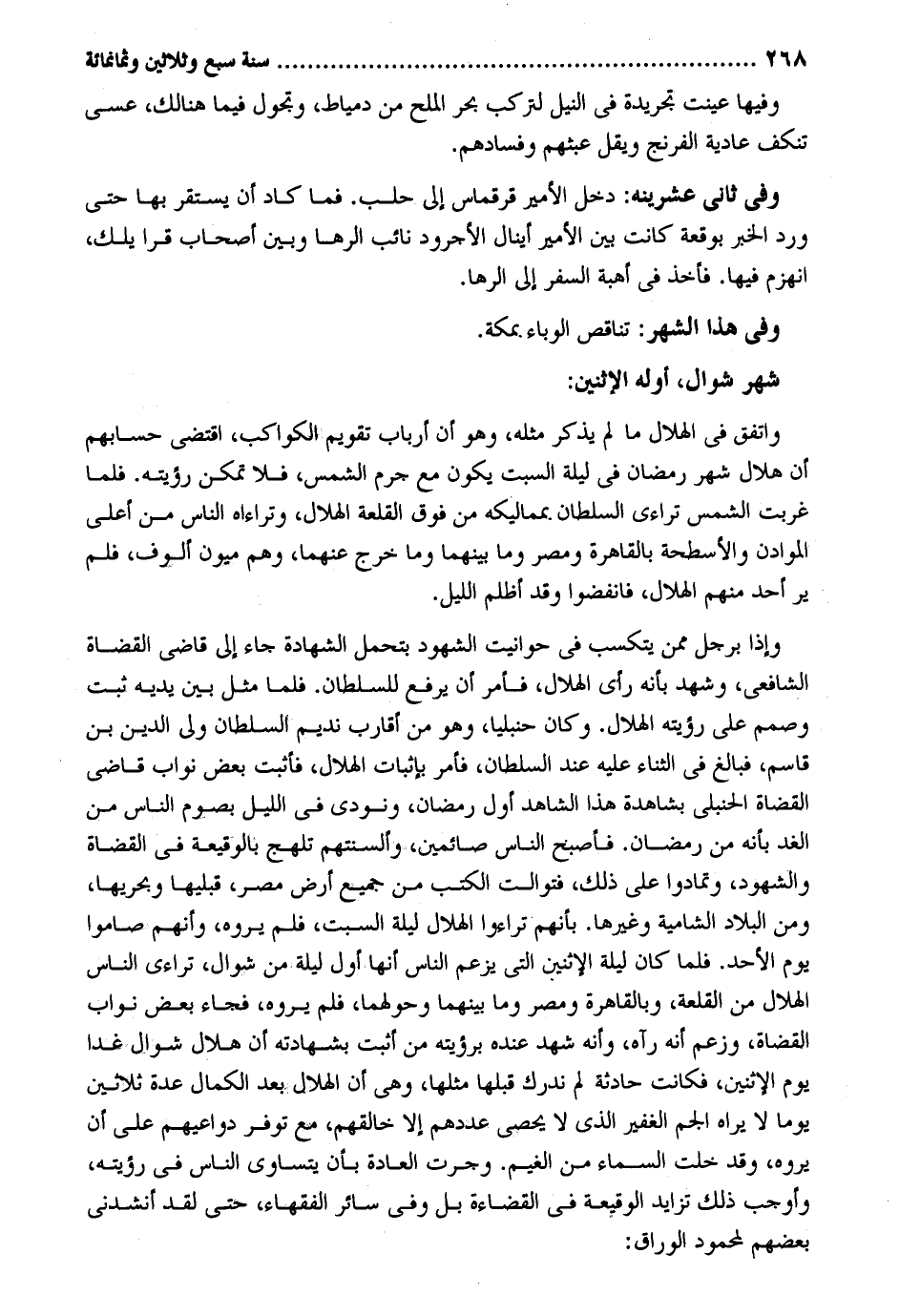 وفيهَا عينت تجريدة فِي النّيل لتركب بَحر الْملح من دمياط وتجول فِيمَا هُنَالك عَسى تنكف عَادِية الفرنج ويقل عبثهم وفسادهم. وَفِي ثَانِي عشرينه: دخل الْأَمِير قرقماس إِلَى حلب. فَمَا كَاد أَن يسْتَقرّ بهَا حَتَّى ورد الْخَيْر بوقعة كَانَت بَين الْأَمِير أينال الأجرود نَائِب الرها وَبَين أَصْحَاب قرا يلك انهزم فِيهَا. فَأخذ فِي أهبة السّفر إِلَى الرها. وَفِي هَذَا الشَّهْر: تناقص الوباء بِمَكَّة. شهر شَوَّال أَوله الِاثْنَيْنِ: وأتفق فِي الْهلَال مَا لم يذكر مثله وَهُوَ أَن أَرْبَاب تَقْوِيم الْكَوَاكِب اقْتضى حسابهم أَن هِلَال شهر رَمَضَان فِي لَيْلَة السبت يكون مَعَ جرم الشَّمْس فَلَا يُمكن رُؤْيَته. فَلَمَّا غربت الشَّمْس ترَاءى السُّلْطَان بمماليكه من فَوق القلعة الْهلَال وتراءاه النَّاس من أَعلَى الموادن والأسطحة بِالْقَاهِرَةِ ومصر وَمَا بَينهمَا وَمَا خرج عَنْهُمَا وهم ميون أُلُوف فَلم ير أحد مِنْهُم الْهلَال فَانْفَضُّوا وَقد أظلم اللَّيْل. وَإِذا بِرَجُل مِمَّن يتكسب فِي حوانيت الشُّهُود بتحمل الشَّهَادَة جَاءَ إِلَى قَاضِي الْقُضَاة الشَّافِعِي وَشهد بِأَنَّهُ رأى الْهلَال فَأمر أَن يرفع للسُّلْطَان. فَلَمَّا مثل بَين يَدَيْهِ ثَبت وصمم على رُؤْيَته الْهلَال. وَكَانَ حنبلياً وَهُوَ من أقَارِب نديم السُّلْطَان ولي الدّين بن قَاسم فَبَالغ فِي الثَّنَاء عَلَيْهِ عِنْد السُّلْطَان فَأمر بِإِثْبَات الْهلَال فَأثْبت بعض نواب قَاضِي الْقُضَاة الْحَنْبَلِيّ بشاهدة هَذَا الشَّاهِد أول رَمَضَان وَنُودِيَ فِي اللَّيْل بِصَوْم النَّاس من الْغَد بِأَنَّهُ من رَمَضَان. فاصبح النَّاس صَائِمين وألسنتهم تلهج بالوقيعة فِي الْقُضَاة وَالشُّهُود وتمادوا على ذَلِك فتوالت الْكتب من جَمِيع أَرض مصر قبليها وبحريها وَمن الْبِلَاد الشامية وَغَيرهَا. بِأَنَّهُم تراءوا الْهلَال لَيْلَة السبت فَلم يروه وَأَنَّهُمْ صَامُوا يَوْم الْأَحَد. فَلَمَّا كَانَ لَيْلَة الِاثْنَيْنِ الَّتِي يزْعم النَّاس أَنَّهَا أول لَيْلَة من شَوَّال ترَاءى النَّاس الْهلَال من القلعة وبالقاهرة ومصر وَمَا بَينهمَا وحولهما فَلم يزوره فجَاء بعض نواب الْقُضَاة وَزعم أَنه رَآهُ وَأَنه شهد عِنْده بِرُؤْيَتِهِ من أَثبت بِشَهَادَتِهِ أَن هِلَال شَوَّال غَدا يَوْم الِاثْنَيْنِ فَكَانَت حَادِثَة لم ندرك قبلهَا مثلهَا وَهِي أَن الْهلَال بعد الْكَمَال عدَّة ثَلَاثِينَ يَوْمًا لَا يرَاهُ الجم الْغَفِير الَّذِي لَا يُحْصى عَددهمْ إِلَّا خالقهم مَعَ توفر دواعيهم على أَن يروه وَقد خلت السَّمَاء من الْغَيْم. وَجَرت الْعَادة باً ن يتساوى النَّاس فِي رُؤْيَته وَأوجب ذَلِك تزايد الوقيعة فِي الْقَضَاء بل وَفِي سَائِر الْفُقَهَاء حَتَّى لقد أَنْشدني بَعضهم لمحمود الْوراق: