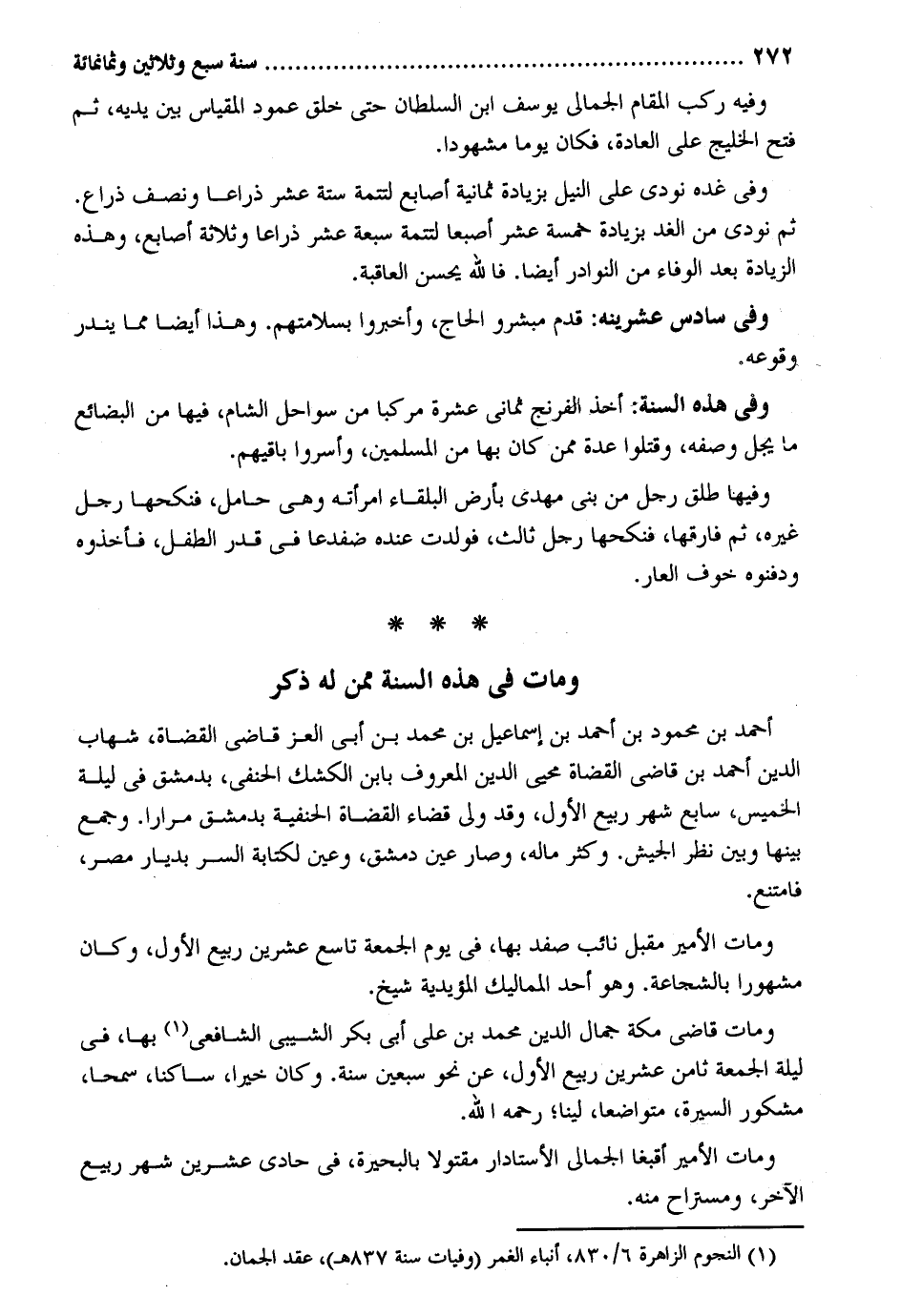 وَفِيه ركب الْمقَام الجمالي يُوسُف ابْن السُّلْطَان حَتَّى خلق عَمُود المقياس بَين يَدَيْهِ ثمَّ فتح الخليج على الْعَادة فَكَانَ يَوْمًا مشهوداً. وَفِي غده نُودي على النّيل بِزِيَادَة ثَمَانِيَة أَصَابِع لتتمة سِتَّة عشر ذِرَاعا وَنصف ذِرَاع. ثمَّ نُودي من الْغَد بِزِيَادَة خَمْسَة عشر إصبعاً لتتمة سَبْعَة عشر ذِرَاعا وَثَلَاثَة أَصَابِع وَهَذِه الزِّيَادَة بعد الْوَفَاء من النَّوَادِر أَيْضا. فَالله يحسن الْعَاقِبَة. وَفِي سادس عشرينه: قدم مبشرو الْحَاج وأخروا بسلامتهم. وَهَذَا أَيْضا مِمَّا ينْدر وُقُوعه. وَفِي هَذِه السّنة: أَخذ أفرنج ثَمَانِي عشرَة مركبا من سواحل الشَّام فِيهَا من البضائع مَا يجل وَصفه وَقتلُوا عدَّة مِمَّن كَانَ بهَا من الْمُسلمين وأسروا باقيهم. وفيهَا طلق رجل من بني مهْدي بِأَرْض البلقاء امْرَأَته وَهِي حَامِل فنكحها رجل غَيره ثمَّ فَارقهَا فنكحها رجل ثَالِث فَولدت عِنْده ضفدعاً فِي قدر الطِّفْل فَأَخَذُوهُ ودفنوه خوف الْعَار. أَحْمد بن مَحْمُود بن أَحْمد بن إِسْمَاعِيل بن مُحَمَّد بن أبي الْعِزّ قَاضِي الْقُضَاة شهَاب الدّين أَحْمد بن قَاضِي الْقُضَاة محيي الدّين الْمَعْرُوف بِابْن الكشك الْحَنَفِيّ بِدِمَشْق فِي لَيْلَة الْخَمِيس سَابِع شهر ربيع الأول وَقد ولي قَضَاء الْقُضَاة الْحَنَفِيَّة بِدِمَشْق مرَارًا. وَجمع بَينهَا وَبَين نظر الْجَيْش. وَكثر مَاله وَصَارَ عين دمشق وَعين لكتابة السِّرّ بديار مصر فَامْتنعَ. وَمَات الْأَمِير مقبل نَائِب صفد بهَا فِي يَوْم الْجُمُعَة تَاسِع عشْرين ربيع الأول وَكَانَ مَشْهُورا بالشجاعة. وَهُوَ أحد المماليك المؤيدية شيخ. وَمَات قَاضِي مَكَّة جمال الدّين مُحَمَّد بن عَليّ أبي بكر الشيبي الشَّافِعِي بهَا فِي لَيْلَة الْجُمُعَة ثامن عشْرين ربيع الأول عَن نَحْو سبعين سنة. وَكَانَ خيرا سَاكِنا سَمحا مشكور السِّيرَة متواضعاً لينًا رَحمَه الله. وَمَات الْأَمِير أقبغا الجمالي الأستادار مقتولاً بالبحيرة فِي حادي عشْرين شهر ربيع الآخر ومستراح مِنْهُ.