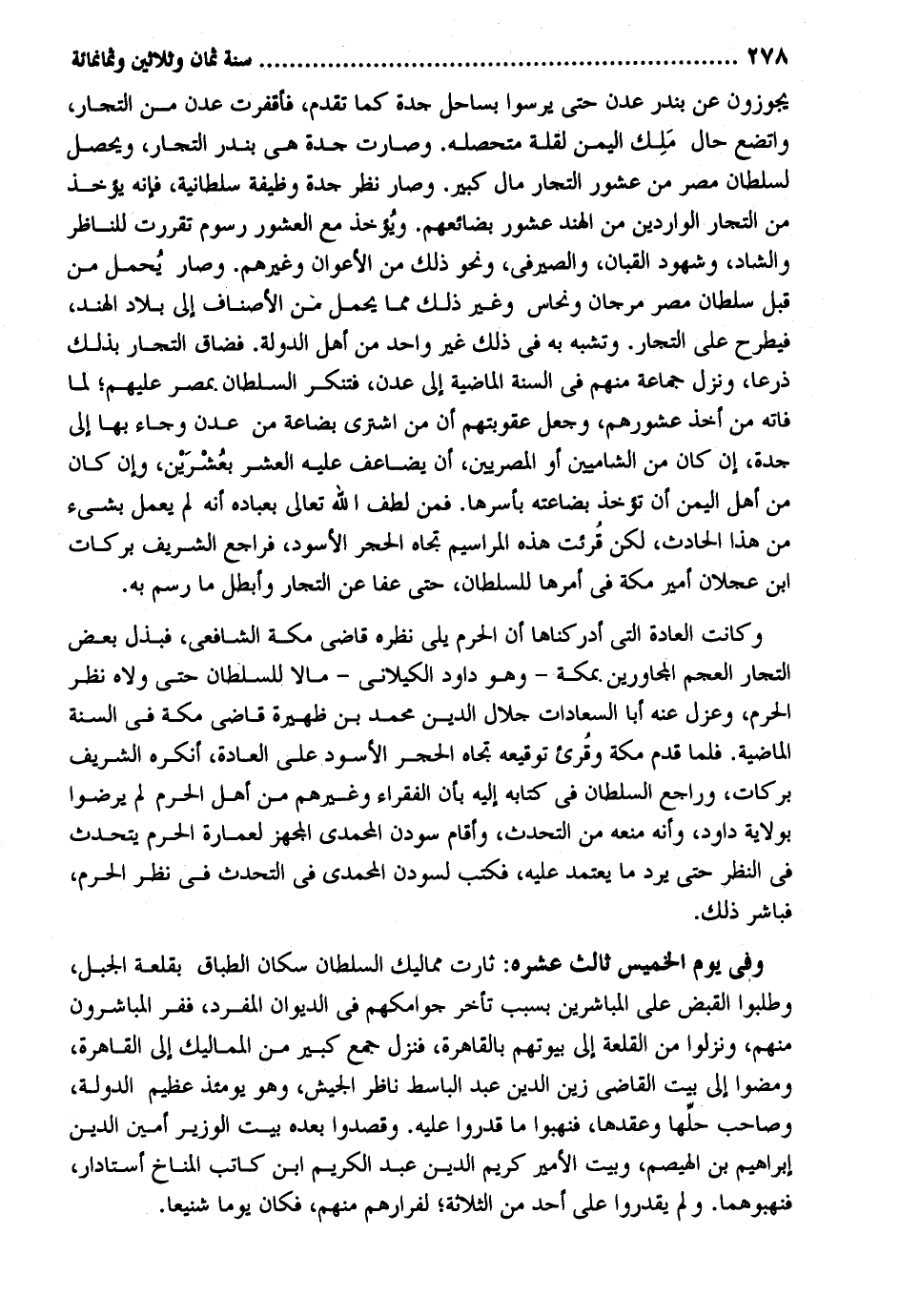 يجوزون عَن بندر عدن حَتَّى يرسوا بساحل جدة كَمَا تقدم فأقفرت عدن من التُّجَّار واتضع حَال مَلِك الْيمن لقلَّة متحصله. وَصَارَت جدة هِيَ بندر التُّجَّار وَيحصل لسلطان مصر من عشور التُّجَّار مَال كَبِير. وَصَارَ نظر جدة وَظِيفَة سلطانية فَإِنَّهُ يُؤْخَذ من التُّجَّار الواردين من الْهِنْد عشور بضائعهم. وَيُؤْخَذ مَعَ العشور رسوم تقررت للنَّاظِر والشاد وشهود القبان والصيرفي وَنَحْو ذَلِك من الأعوان وَغَيرهم. وَصَارَ يحمل من قبل سُلْطَان مصر مرجان ونحاس ويخر ذَلِك مِمَّا يحمل من الْأَصْنَاف إِلَى بِلَاد الْهِنْد فيطرح على التُّجَّار. وتشبه بِهِ فِي ذَلِك غير وَاحِد من أهل الدولة. فَضَاقَ التُّجَّار بذلك ذرعاً وَنزل جمَاعَة مِنْهُم فِي السّنة الْمَاضِيَة إِلَى عدن فتنكر السُّلْطَان بِمصْر عَلَيْهِم لما فَاتَهُ من أَخذ عشورهم وَجعل عقوبتهم أَن من اشْترى بضَاعَة من عدن وَجَاء بهَا إِلَى جدة إِن كَانَ من الشاميين أَو المصريين أَن يُضَاعف عَلَيْهِ الْعشْر بعُشرَيْن وَإِن كَانَ من أهل الْيمن أَن تُؤْخَذ بضاعته بأسرها. فَمن لطف الله تَعَالَى بعباده أَنه لم يعْمل بِشَيْء من هَذَا الْحَادِث لَكِن قُرِئت هَذِه المراسيم تجاه الْحجر الْأسود فراجع الشريف بَرَكَات ابْن عجلَان أَمِير مَكَّة فِي أمرهَا للسُّلْطَان حَتَّى عَفا عَن التُّجَّار وأبطل مَا رسم بِهِ. وَكَانَت الْعَادة الَّتِي أدركناها أَن الْحرم يَلِي نظره فاضي مَكَّة الشَّافِعِي فبذل بعض التُّجَّار الْعَجم المجاورين بِمَكَّة - وَهُوَ دَاوُد الكيلاني - مَالا للسُّلْطَان حَتَّى ولاه نظر الْحرم وعزل عَنهُ أَبَا السعادات جلال الدّين مُحَمَّد بن ظهيرة قَاضِي مَكَّة فِي السّنة الْمَاضِيَة. فَلَمَّا قدم مَكَّة وقُرئ توقيعه تجاه الْحجر الْأسود على الْعَادة أنكرهُ الشريف بَرَكَات وراجع السُّلْطَان فِي كِتَابه إِلَيْهِ بِأَن الففراء وَغَيرهم من أهل الْحرم لم يرْضوا بِولَايَة دَاوُد وَأَنه مَنعه من التحدث وَأقَام سودن المحمدي المجهز لعمارة الْحرم يتحدث فِي النّظر حَتَّى يرد مَا يعْتَمد عَلَيْهِ فَكتب لسودن المحمدي فِي التحدث فِي نظر الْحرم فباشر ذَلِك. وَفِي يَوْم الْخَمِيس ثَالِث عشره: ثارت مماليك السُّلْطَان سكان الطباق بقلعة الْجَبَل وطلبوا الْقَبْض على المباشرين بِسَبَب تَأَخّر جوامكهم فِي الدِّيوَان الْمُفْرد ففر المباشرون مِنْهُم ونزلوا من القلعة إِلَى بُيُوتهم بِالْقَاهِرَةِ فَنزل جمع كَبِير من المماليك إِلَى الْقَاهِرَة ومضوا إِلَى بَيت القَاضِي زين الدّين عبد الباسط نَاظر الْجَيْش وَهُوَ يَوْمئِذٍ عَظِيم الدولة وَصَاحب حلِّها وعقدها فنهبوا مَا قدرُوا عَلَيْهِ. وقصدوا بعده بَيت الْوَزير أَمِين الدّين إِبْرَاهِيم بن الهيصم وَبَيت الْأَمِير كريم الدّين عبد الْكَرِيم ابْن كَاتب المناخ أستادار فنهبوهما. وَلم يقدروا على أحد من الثَّلَاثَة لفرارهم مِنْهُم فَكَانَ يَوْمًا شنيعاً.