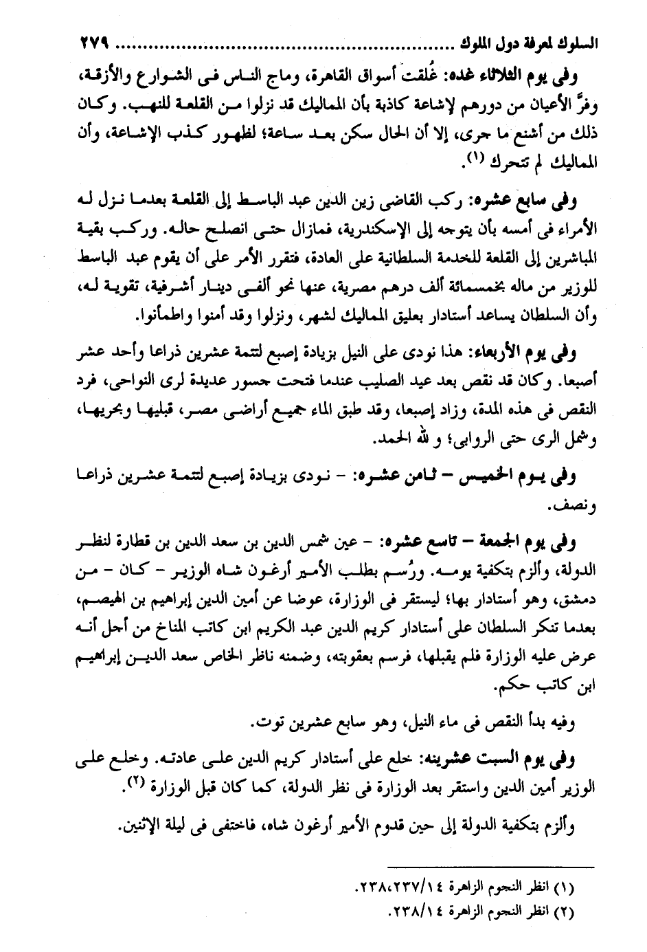 وَفِي يَوْم الثُّلَاثَاء غده: غُلقت أسواق الْقَاهِرَة وماج النَّاس فِي الشوارع والأزقة وفر الْأَعْيَان من دُورهمْ لإشاعة كَاذِبَة بِأَن المماليك قد نزلُوا من القلعة للنهب. وَكَانَ ذَلِك من أشنع مَا جرى إِلَّا أَن الْحَال سكن بعد سَاعَة لظُهُور كذب الإشاعة وَأَن المماليك لم تتحرك. وَفِي سَابِع عشره: ركب القَاضِي زين الدّين عبد الباسط إِلَى القلعة بعد مَا نزل لَهُ الْأُمَرَاء فِي أمسه بِأَن يتَوَجَّه إِلَى الْإسْكَنْدَريَّة فَمَا زَالَ حَتَّى انصلح حَاله. وَركب بَقِيَّة المباشرين إِلَى القلعة للْخدمَة السُّلْطَانِيَّة على الْعَادة فتقرر الْأَمر على أَن يقوم عبد الباسط للوزير من مَاله بِخَمْسِمِائَة ألف دِرْهَم مصرية عَنْهَا نَحْو ألفي دِينَار أشرفية تَقْوِيَة لَهُ وَأَن السُّلْطَان يساعد أستادار بعليق المماليك لشهر ونزلوا وَقد أمنُوا واطمأنوا. وَفِي يَوْم الْأَرْبَعَاء: هَذَا نُودي على النّيل بِزِيَادَة إِصْبَع لتتمة عشْرين ذِرَاعا وَأحد عشر إصبعاً. وَكَانَ قد نقص بعد عيد الصَّلِيب عِنْد مَا فتحت جسور عديدة لري النواحي فَرد النَّقْص فِي هَذِه الْمدَّة وَزَاد إصبعاً وَقد طبق المَاء جَمِيع أَرَاضِي مصر قبليها وبحريها وَشَمل الرّيّ حَتَّى الروابي وَللَّه الْحَمد. وَفِي يَوْم الْخَمِيس - ثامن عشره: - نُودي بِزِيَادَة إِصْبَع لتتمة عشْرين ذِرَاعا وَنصف. وَفِي يَوْم الْجُمُعَة - تَاسِع عشره: - عين شمس الدّين بن سعد الدّين بن قطارة لنظر الدولة وألزم بتكفية يَوْمه. ورُسم بِطَلَب الْأَمِير أرغون شاه الْوَزير - كَانَ - من دمشق وَهُوَ أستادار بهَا ليستقر فِي الوزارة عوضا عَن أَمِين الدّين إِبْرَاهِيم بن الهيصم بعد مَا تنكر السُّلْطَان على أستادار كريم الدّين عبد الْكَرِيم ابْن كَاتب المناخ من أجل أَنه عرض عَلَيْهِ الوزارة فَلم يقبلهَا فرسم بعقوبته وَضَمنَهُ نَاظر الْخَاص سعد الدّين إِبْرَاهِيم ابْن كَاتب حكم. وَفِيه بَدَأَ النَّقْص فِي مَاء النّيل وَهُوَ سَابِع عشْرين توت. وَفِي يَوْم السبت عشرينه: خلع على أستادار كريم الدّين على عَادَته. وخلع على الْوَزير أَمين الدّين وَاسْتقر بعد الوزارة فِي نظر الدولة كَمَا كَانَ قبل الوزارة. وألزم بتكفية الدولة إِلَى حِين قدوم الْأَمِير أرغون شاه فاختفى فِي لَيْلَة الِاثْنَيْنِ.