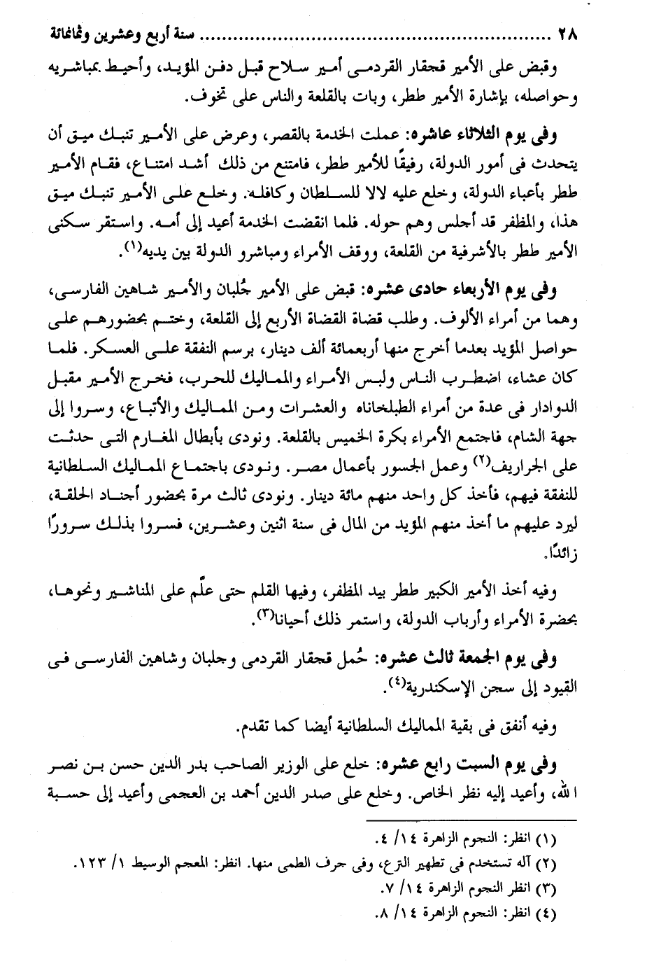 وَقبض على الْأَمِير قجقار القردمي أَمِير سلَاح قبل دفن الْمُؤَيد وأحيط بمباشريه وحواصله بِإِشَارَة الْأَمِير ططر وَبَات بالقلعة وَالنَّاس على تخوف. وَفِي يَوْم الثُّلَاثَاء عاشره: عملت الْخدمَة بِالْقصرِ وَعرض على الْأَمِير تنبك ميق أَن يتحدث فِي أُمُور الدولة رَفِيقًا للأمير ططر فَامْتنعَ من ذَلِك أَشد امْتنَاع فَقَامَ الْأَمِير ططر بأعباء الدولة وخلع عَلَيْهِ لالا للسُّلْطَان وكافله. وخلع على الْأَمِير تنبك ميق هَذَا والمظفر قد أَجْلِس وهم حوله. فَلَمَّا انْقَضتْ الْخدمَة أُعِيد إِلَى أمه. وَاسْتقر سكني الْأَمِير ططر بالأشرفية من القلعة ووقف الْأُمَرَاء ومباشرو الدولة بَين يَدَيْهِ. وَفِي يَوْم الْأَرْبَعَاء حادي عشره: قبض على الْأَمِير جلبان والأمير شاهين الْفَارِسِي وهما من أُمَرَاء الألوف. وَطلب قُضَاة الْقُضَاة الْأَرْبَع إِلَى القلعة وَختم بحضورهم على حواصل الْمُؤَيد بعد مَا أخرج مِنْهَا أَرْبَعمِائَة ألف دِينَار برسم النَّفَقَة على الْعَسْكَر. فَلَمَّا كَانَ عشَاء اضْطربَ النَّاس وَلبس الْأُمَرَاء والمماليك للحرب فَخرج الْأَمِير مقبل الدوادار فِي عدَّة من أُمَرَاء الطبلخاناه والعشرات وَمن المماليك والأتباع وسروا إِلَى جِهَة الشَّام فَاجْتمع الْأُمَرَاء بكرَة الْخَمِيس بالقلعة. وَنُودِيَ بأبطال المغارم الَّتِي حدثت على الجراريف وَعمل الجسور بأعمال مصر. وَنُودِيَ باجتماع المماليك السُّلْطَانِيَّة للنَّفَقَة فيهم فَأخذ كل وَاحِد مِنْهُم مائَة دِينَار. وَنُودِيَ ثَالِث مرّة بِحُضُور أجناد الْحلقَة ليرد عَلَيْهِم مَا أَخذ مِنْهُم الْمُؤَيد من المَال فِي سنة اثْنَيْنِ وَعشْرين فسروا بذلك سُرُورًا زَائِدا وَفِيه أَخذ الْأَمِير الْكَبِير ططر بيد المظفر وفيهَا الْقَلَم حَتَّى علم على المناشير وَنَحْوهَا بِحَضْرَة الْأُمَرَاء وأرباب الدولة وَاسْتمرّ ذَلِك أَحْيَانًا. وَفِي يَوْم الْجُمُعَة ثَالِث عشره: حمل قجقار القردمي وجلبان وشاهين الْفَارِسِي فِي الْقُيُود إِلَى سجن الْإسْكَنْدَريَّة. وَفِيه أنْفق فِي بَقِيَّة المماليك السُّلْطَانِيَّة أَيْضا كَمَا تقدم. وَفِي يَوْم السبت رَابِع عشره: خلع على الْوَزير الصاحب بدر الدّين حسن بن نصر الله وأعيد إِلَيْهِ نظر الْخَاص. وخلع على صدر الدّين أَحْمد بن العجمي وأعيد إِلَى حسبَة