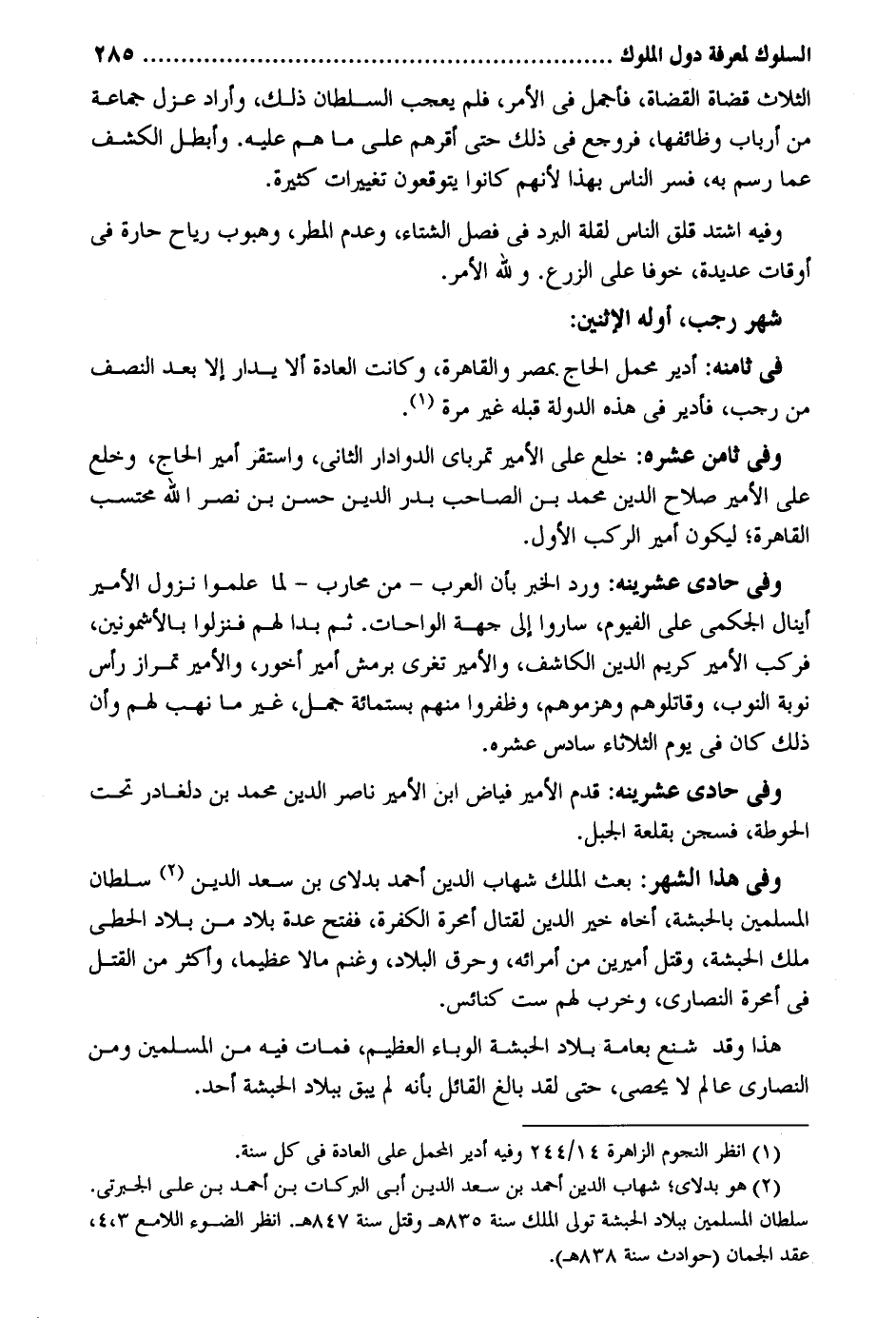 الثَّلَاث قُضَاة الْقُضَاة فأجل فِي الْأَمر فَلم يعجب السُّلْطَان ذَلِك وَأَرَادَ عزل جمَاعَة من أَرْبَاب وظائفها فروجع فِي ذَلِك حَتَّى أقرهم على مَا هم عَلَيْهِ. وأبطل الْكَشْف عَمَّا رسم بِهِ فسر النَّاس بِهَذَا لأَنهم كَانُوا يتوقعون تغييرات كَثِيرَة. وَفِيه اشْتَدَّ قلق النَّاس لقلَّة الْبرد فِي فصل الشتَاء وَعدم الْمَطَر وهبوب ريَاح حارة فِي أَوْقَات شهر رَجَب أَوله الِاثْنَيْنِ: فِي ثامنه: أدير محمل الْحَاج بِمصْر والقاهرة وَكَانَت الْعَادة أَلا يدار إِلَّا بعد النّصْف من رَجَب فأدير فِي هَذِه الدولة قبله غير مرّة. وَفِي ثامن عشره: خلع على الْأَمِير تمرباي الدوادار الثَّانِي وَاسْتقر أمَير الْحَاج وخلع على الْأَمِير صَلَاح الدّين مُحَمَّد بن الصاحب بدر الدّين حسن بن نصر الله محتسب الْقَاهِرَة ليَكُون أَمِير الركب الأول. وَفِي حادي عشرينه: ورد الْخَبَر بِأَن الْعَرَب - من محَارب - لما علمُوا نزُول الْأَمِير أينال الجكمي على الفيوم سَارُوا إِلَى جِهَة الواحات. ثمَّ بدا لَهُم فنزلوا بالأشمونين فَركب الْأَمِير كريم الدّين الكاشف والأمير تغري برمش أَمِير أخور والأمير تمراز رَأس نوبَة النوب وقاتلوهم وهزموهم وظفروا مِنْهُم بستمائة جمل غير مَا نهب لَهُم وَإِن ذَلِك كَانَ فِي يَوْم الثُّلَاثَاء سادس عشره. وَفِي حادي عشرينه: قدم الْأَمِير فياض ابْن الْأَمِير نَاصِر الدّين مُحَمَّد بن دلغادر تَحت الحوطة فسجن بقلعة الْجَبَل. وَفِي هَذَا الشَّهْر: بعث الْملك شهَاب الدّين أَحْمد بدلاي بن سعد الدّين سُلْطَان الْمُسلمين بِالْحَبَشَةِ أَخاه خير الدّين لقِتَال أمحرة الْكَفَرَة فَفتح عدَّة بِلَاد من بِلَاد الحطي ملك الْحَبَشَة وَقتل أميرين من أمرائه وَحرق الْبِلَاد وغنم مَالا عَظِيما وَأكْثر من القيل فِي أمحرة النَّصَارَى وَخرب لَهُم سِتّ كنائس. هَذَا وَقد شنع بعامة بِلَاد الْحَبَشَة الوباء الْعَظِيم فَمَاتَ فِيهِ من الْمُسلمين وَمن النَّصَارَى عَالم لَا يُحْصى حَتَّى لقد بَالغ الْقَائِل بِأَنَّهُ لم يبْق بِبِلَاد الْحَبَشَة أحد.