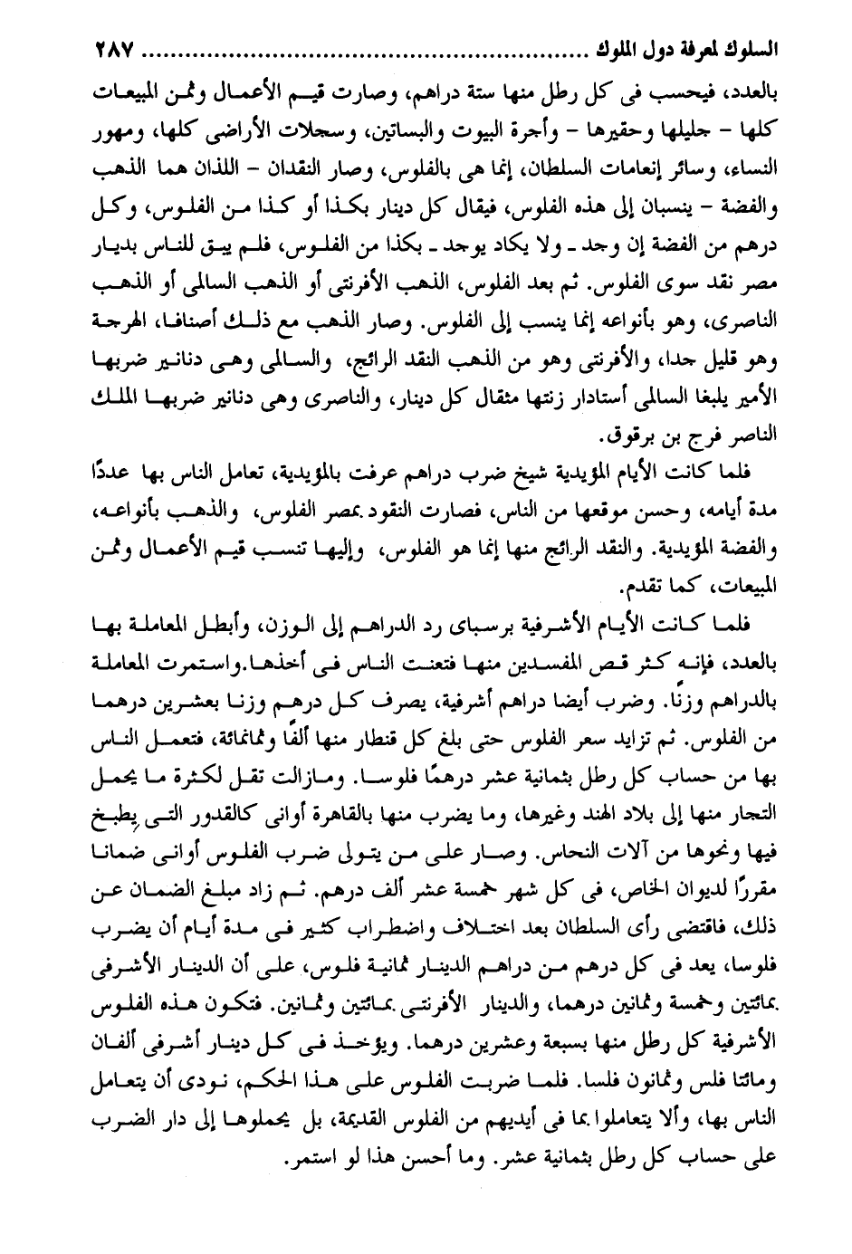 بِالْعدَدِ فيحسب فِي كل رَطْل مِنْهَا سِتَّة دَرَاهِم وَصَارَت قيم الْأَعْمَال وَثمن المبيعات كلهَا - جليلها وحقيرها - وَأُجْرَة الْبيُوت والبساتين وسجلات الْأَرَاضِي كلهَا ومهور النِّسَاء وَسَائِر إنعامات السُّلْطَان إِنَّمَا هِيَ بالفلوس وَصَارَ النقدان - اللَّذَان هما الذَّهَب وَالْفِضَّة - ينسبان إِلَى هَذِه الْفُلُوس فَيُقَال كل دِينَار بِكَذَا أَو كَذَا من الْفُلُوس وكل دِرْهَم من الْفضة إِن وجد - وَلَا يكَاد يُوجد - بِكَذَا من الْفُلُوس فَلم يبْق للنَّاس بديار مصر نقد سوى الْفُلُوس. ثمَّ بعد الْفُلُوس الذَّهَب الأفرنتي أَو الذَّهَب السالمي أَو الذَّهَب الناصري وَهُوَ بأنواعه إِنَّمَا ينْسب إِلَى الْفُلُوس. وَصَارَ الذَّهَب مَعَ ذَلِك أصنافاً الهرجة وَهُوَ قَلِيل جدا والأفرنتي وَهُوَ من الذَّهَب النَّقْد الرائج والسالمي وَهِي دَنَانِير ضربهَا الْأَمِير يلبغا السالمي أستادار زنتها مِثْقَال كل دِينَار والناصري وَهِي دَنَانِير ضربهَا الْملك النَّاصِر فرج بن برقوق. فَلَمَّا كَانَت الْأَيَّام المؤيدية شيخ ضرب دَرَاهِم عرفت بالمؤيدية تعامل النَّاس بهَا عددا مُدَّة أَيَّامه وَحسن موقعها من النَّاس فَصَارَت النُّقُود بِمصْر الْفُلُوس وَالذَّهَب بأنواعه وَالْفِضَّة المؤيدية. والنقد الرائج مِنْهَا إِنَّمَا هُوَ الْفُلُوس وإليها تنْسب قيم الْأَعْمَال وَثمن المبيعات كَمَا تقدم. فَلَمَّا كَانَت الْأَيَّام الأشرفية برسباي رد الدَّرَاهِم إِلَى الْوَزْن وأبطل الْمُعَامَلَة بهَا بِالْعدَدِ فَإِنَّهُ كثر قصّ المفسدين مِنْهَا فتعنت النَّاس فِي أَخذهَا. واستمرت الْمُعَامَلَة بِالدَّرَاهِمِ وزْناً. وَضرب أَيضاً دَرَاهِم أشرفية يصرف كل دِرْهَم وزنا بِعشْرين درهما من الْفُلُوس. ثمَّ تزايد سعر الْفُلُوس حَتَّى بلغ كل قِنْطَار مِنْهَا ألفا وَثَمَانمِائَة فتعمل النَّاس بهَا من حِسَاب كل رَطْل بِثمَانِيَة عشر درهما فُلُوسًا. وَمَا زَالَت تقل لِكَثْرَة مَا يحمل التُّجَّار مِنْهَا إِلَى بِلَاد الْهِنْد وَغَيرهَا وَمَا يضْرب مِنْهَا بِالْقَاهِرَةِ أواني كالقدور الَّتِي يطْبخ فِيهَا وَنَحْوهَا من آلَات النّحاس. وَصَارَ على من يتَوَلَّى ضرب الْفُلُوس أواني ضْماناً مقرراً لديوان الْخَاص فِي كل شهر خَمْسَة عشر ألف دِرْهَم. ثمَّ زَاد مبلغ الضَّمَان عَن ذَلِك فَاقْتضى رَأْي السُّلْطَان بعد اخْتِلَاف واضطراب كثير فِي مُدَّة أَيَّام أَن يضْرب فُلُوسًا يعد فِي كل دِرْهَم من دَرَاهِم الدِّينَار ثَمَانِيَة فلوس على أَن الدِّينَار الأشرفي بمائتين وَخَمْسَة وَثَمَانِينَ درهما وَالدِّينَار الأفرنتي بمائتين وَثَمَانِينَ. فَتكون هَذِه الْفُلُوس الأشرفية كل رَطْل مِنْهَا بسبعة وَعشْرين درهما. وَيُؤْخَذ فِي كل دِينَار أشرفي أَلفَانِ وَمِائَتَا فلس وَثَمَانُونَ فلسًا. فَلَمَّا ضربت الْفُلُوس على هَذَا الحكم نُودي أَن يتعامل النَّاس بهَا وَألا يتعاملوا. بِمَا فِي أَيْديهم من الْفُلُوس الْقَدِيمَة بل يحملوها إِلَى دَار الضَّرْب على حِسَاب كل رَطْل بِثمَانِيَة عشر. وَمَا أحسن هَذَا لَو استَمر.