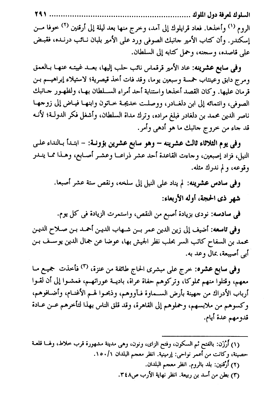 الرّوم وَأَخذهَا. فَعَاد قرا يلوك إِلَى آمد وَخرج مِنْهَا بعد لَيْلَة إِلَى أرقنين خوفًا من اسكندر. وَأَن كتاب الْأَمِير جَانِبك الصُّوفِي ورد على الْأَمِير بلبان نَائِب درنده فَقبض على قاصده وسجنه وَحمل كِتَابه إِلَى السُّلْطَان. وفى سَابِع عشرينه: عَاد الْأَمِير قرقماس نَائِب حلب إِلَيْهَا بعد غيبته عَنْهَا بالعمق ومرج دابق وعينتاب خَمْسَة وَسبعين يَوْمًا وَقد فَاتَ أَخذ قيصرية لاستيلاء إِبْرَاهِيم بن قرمان عَلَيْهَا. وَكَانَ الْقَصْد أَخذهَا واستنابة أحد أُمَرَاء السُّلْطَان بهَا ولظهور جَانِبك لصوفي وانتمائه إِلَى ابْن دلغادر ووصلت خَدِيجَة خاتون وَابْنهَا فياض إِلَى زَوجهَا نَاصِر الدّين مُحَمَّد بن دلغادر فَبلغ مُرَاده وَترك مداة السُّلْطَان وأشغل فكر الدولة لِأَنَّهُ قد جَاءَ من خُرُوج جَانِبك مَا هُوَ أدهى وَأمر. وَفِي يَوْم الثُّلَاثَاء ثَالِث عشرينه - وَهُوَ سَابِع عشْرين بؤونة: - ابْتَدَأَ بالنداء على النّيل فَزَاد إِصْبَعَيْنِ وَجَاءَت الْقَاعِدَة أحد عشر ذِرَاعا وَعشر أَصَابِع وَهَذَا مِمَّا ينْدر وُقُوعه وَلم ندرك مثله. وَفِي سادس عشرينه: لم يناد على النّيل إِلَى سلخه وَنقص سِتَّة عشر إصبعا. شهر ذِي الْحجَّة أَوله الْأَرْبَعَاء: فِي سادسه: نُودي بِزِيَادَة إِصْبَع من النَّقْص واستمرت الزِّيَادَة فِي كل يَوْم. وَفِي تاسعه: أضيف إِلَى زين الدّين عمر بن شهَاب الدّين أَحْمد بن صَلَاح الدّين مُحَمَّد بن السفاح كَاتب السِّرّ بحلب نظر الْجَيْش بهَا عوضا عَن جمال الدّين يُوسُف بن أبي أصيبعة بِمَال وعد وَفِي سَابِع عشره: خرج على مبشري الْحَاج طَائِفَة من عنزة فَأخذت جَمِيع مَا مَعَهم وَقتلُوا مِنْهُم مَمْلُوكا وتركوهم حُفَاة عُرَاة بادية عَوْرَاتهمْ فَمَشَوْا إِلَى أَن لقوا أَرْبَاب الأدراك من جُهَيْنَة بِأَرْض السماوة فآووهم وذبحوا لَهُم الأغنام وأضافوهم وكسوهم من ملابسهم وحملوهم إِلَى الْقَاهِرَة وَقد قلق النَّاس بِهَذَا لتأخرهم عَن عَادَة قدومهم عدَّة أَيَّام.