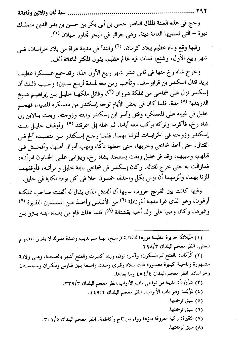 وَحج فِي هَذِه السّنة الْملك النَّاصِر حسن بن أبي بكر بن حسن بن بدر الدّين متملك ديوة - الَّتِي تسميها الْعَامَّة دينة وَهِي جزائر فِي الْبَحْر تجاور سيلان. وفيهَا وَقع وباء عَظِيم بِبِلَاد كرمان. وأبتدأَ فِي مَدِينَة هراة من بِلَاد خُرَاسَان فِي شهر ربيع الأول وشنع فَمَاتَ فِيهِ عَالم عَظِيم يَقُول المكثر ثَمَانمِائَة ألف. وَخرج شاه رخ مِنْهَا فِي ثَانِي عشر شهر ربيع الأول هَذَا وَقد جمع عسكراً عَظِيما يُرِيد قتال اسكندر بن قرا يُوسُف. وتأهب وَمن مَعَه لمُدَّة أَربع سِنِين وَسبب ذَلِك أَن اسكندر نزل على شماخي من مملكة شرْوَان وَقَاتل ملكهَا خَلِيل بن إِبْرَاهِيم شيخ الدربندية مُدَّة. فَلَمَّا كَانَ فِي بعض الْأَيَّام توجه اسكندر من مُعَسْكَره للصَّيْد فهجم خَلِيل فِي غيبته على المعسكر وَقتل وَأسر ابْن اسكندر وابنَه وزوجتَه وَبعث بالابن إِلَى شاه رخ فَأكْرمه وَتَركه يركب مَعَه أَيَّامًا. ثمَّ حمله إِلَى سَمَرْقَنْد وأوقف خَلِيل بنت اسكندر وزرجته فِي الخرابات للزِّنَا بهما. فَلَمَّا رَجَعَ اسكندر من متصيده ألح فِي الْقِتَال حَتَّى أَخذ شماخي وخربها حَتَّى جعلهَا دكاً وَنهب أَمْوَال أَهلهَا وأفحش فِي قَتلهمْ وَسَبْيهمْ وَفد فر خَلِيل وَبعث يستنجد بشاه رخ ويترامى على الخاتون امْرَأَته فَمَا زَالَت بِهِ حَتَّى خرج لقتاله. وَكَانَ اسكندر فِي سماحي بابنة خَلِيل وَامْرَأَته فأوقفهما تزنا بهما وألزمهما أَن يَزْنِي بِكُل وَاحِدَة خَمْسُونَ رجلا فِي كل يَوْم نكاية فِي خَلِيل. وفيهَا كَانَت بينِ إفرنج حروب سَببهَا أَن ألفن الَّذِي يُقَال لَهُ ألفنه صَاحب مملكة أرغون وَهُوَ الَّذِي غزا مَدِينَة أغرناطة من الأندلس وَأخذ من الْمُسلمين الخميرة وَغَيرهَا وَكَانَ وَصِيّا على ولد أَخِيه بقشتالة فَلَمَّا هلك قَامَ من بعده ابْنه بترو بن