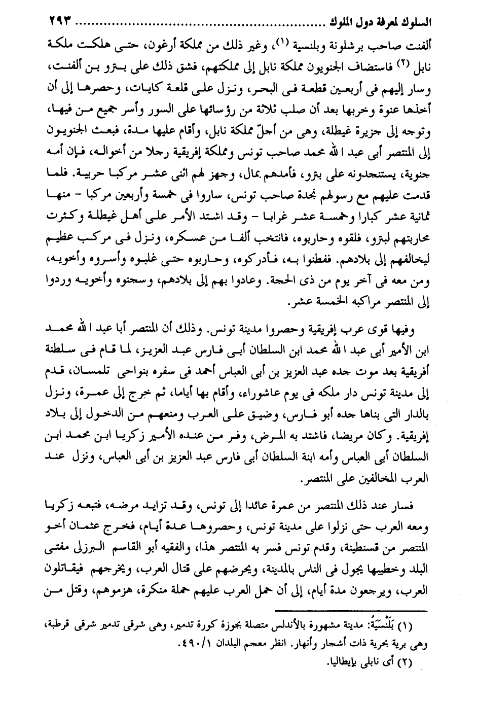 ألفنت صَاحب برشلونة وبلنسية وَغير ذَلِك من مملكة أرغون حَتَّى هَلَكت ملكة نابل فاستضاف الجنويون مملكة نابل إِلَى مملكتهم فشق ذَلِك على بترو بن ألفنت وَسَار إِلَيْهِم فِي أَرْبَعِينَ قِطْعَة فِي الْبَحْر وَنزل على قلعة كايات وحصرها إِلَى أَن أَخذهَا عنْوَة وخرجها بعد أَن صلب ثَلَاثَة من رؤسائها على السُّور وَأسر جَمِيع من فِيهَا وَتوجه إِلَى جَزِيرَة غيطلة وَهِي من أجل مملكة نابل وَأقَام عَلَيْهَا مُدَّة فَبعث الجنويون إِلَى الْمُنْتَصر أبي عبد اللهّ مُحَمَّد صَاحب تونس ومملكة إفريقية رجلا من أَخْوَاله أمه جنوية يستنجدونه على بترو فَأَمَدَّهُمْ بِمَال وجهز لَهُم اثْنَي عشر مركبة حربية. فَلَمَّا قدمت عَلَيْهِم مَعَ رسولهم نجدة صَاحب تونس سَارُوا فِي خَمْسَة وَأَرْبَعين مركبا - مِنْهَا ثَمَانِيَة عشر كبارًا وَخَمْسَة عشر غرابا - وَقد اشْتَدَّ الْأَمر على أهل غيطلة وَكَثُرت محاربتهم لبترو فَلَقوهُ وحاربوه فانتخب ألفا من عسكره وَنزل فِي مركب عَظِيم ليخالفهم إِلَى بِلَادهمْ. ففطنوا بِهِ فأدركوه وحاربوه حَتَّى غلبوه وأسروه وأخويه وَمن مَعَه فِي آخر يَوْم من ذِي الحجةَ. وعادوا بهم إِلَى بِلَادهمْ وسجنوه وأخويه وردوا إِلَى المنتّصر مراكبه الْخَمْسَة عشر. وفيهَا قوي عرب إفريقية وحصروا مَدِينَة تونس. وَذَلِكَ أَن الْمُنْتَصر أَبَا عبد الله مُحَمَّد ابْن الْأَمِير أبي عبد الله مُحَمَّد ابْن السُّلْطَان أبي فَارس عبد العزبز لما قَامَ فِي سلطنة أفريقية بعد موت جده عبد الْعَزِيز بن أبي الْعَبَّاس أَحْمد فِي سَفَره بنواحي تلمسان قدم إِلَى مَدِينَة تونس دَار ملكه فِي يَوْم عَاشُورَاء وَأقَام بهَا أَيَّامًا ثمَّ خرج إِلَى عمْرَة وَنزل بِالدَّار الَّتِي بناها جده أَبُو فَارس وضيق على الْعَرَب ومنعهم من الدُّخُول إِلَى بِلَاد إفريقية. وَكَانَ مَرِيضا فَاشْتَدَّ بِهِ الْمَرَض وفر من عِنْده الْأَمِير زَكَرِيَّا ابْن مُحَمَّد ابْن السُّلْطَان أبي الْعَبَّاس وَأمه ابْنة السُّلْطَان أبي فَارس عبد الْعَزِيز بن أَبي الْعَبَّاس وَنزل عِنْد الْعَرَب الْمُخَالفين على الْمُنْتَصر. فَسَار عِنْد ذَلِك الْمُنْتَصر من عمْرَة عَائِدًا إِلَى تونس وَقد تزايد مَرضه فَتَبِعَهُ زَكَرِيَّا وَمَعَهُ الْعَرَب حَتَّى نزلُوا على مَدِينَة تونس وحصروها عدَّة أَيَّام فَخرج عُثْمَان أَخُو الْمُنْتَصر من قسنطينة وَقدم تونس فسر بِهِ الْمُنْتَصر هَذَا والفقيه أَبُو الْقَاسِم الْبُرْزُليّ مفتي الْبَلَد وخطيبها يجول فِي النَّاس بِالْمَدِينَةِ ويحرضهم على قتال الْعَرَب ويخرجهم فيقاتلون الْعَرَب ويرجعون مُدَّة أَيَّام إِلَى أَن حمل الْعَرَب عَلَيْهِم حَملَة مُنكرَة هزموهم وقتَل من