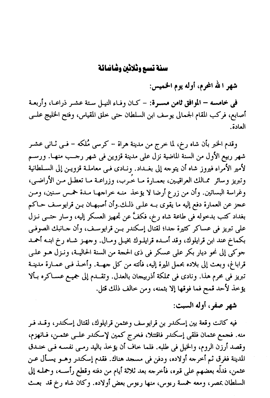شهر الله الْمحرم أَوله يَوْم الْخَمِيس: فِي خْامسه - الْمُوَافق ثامن مَسَرَّة: - كَانَ وَفَاء النّيل سِتَّة عشر ذِرَاعا وَأَرْبَعَة أَصَابِع فَركب الْمقَام الجمالي يُوسُف ابْن السُّلْطَان حَتَّى خلق المقياس وَفتح الخليج على الْعَادة. وَقدم الْخَبَر بِأَن شاه رخ لما خرج من مَدِينَة هراة - كرْسِي مُلكه - فِي ثَانِي عشر شهر ربيع الأول من السّنة الْمَاضِيَة نزل على مَدِينَة قزوين فِي شهر رَجَب مِنْهَا. ورسم لأمير الْأُمَرَاء فَيْرُوز شاه أَن يتَوَجَّه إِلَى بَغْدَاد. ونادى فِي مُعَاملَة قزوين إِلَى السُّلْطَانِيَّة تبريز وَسَائِر ممالك الْعِرَاقِيّين بعمارة مَا خُرب وزراعة مَا تعطل من الْأَرَاضِي وغراسة الْبَسَاتِين. وَأَن من زرع أَرضًا لَا يؤخذْ مِنْهُ خراجها مُدَّة خمس سِنِين وَمن عجز عَن الْعِمَارَة دفع إِلَيْهِ مَا يُقَوي بِهِ على ذَلِك. وَأَن أَصْبَهَان بن قرا يُوسُف حَاكم بَغْدَاد كتب بِدُخُولِهِ فِي طَاعَة شاه رخ فكفَّ عَن تجهيز الْعَسْكَر إِلَيْهِ وَسَار حَتَّى نزل على تبريز فِي عَسَاكِر كَثِيرَة جدا لقِتَال اسكندر بن قرا يُوسُف وَأَن جَانِبك الصُّوفِي بكماخ عِنْد ابْن قرا يلوك وَقد أمده قرا يلوك بخيل وَمَال. وجهز شاه رخ ابْنه أَحْمد جوكي إِلَى نَحْو ديار بكر على عَسْكَر فِي ذِي الْحجَّة من السّنة الحالية وَنزل هُوَ على قرا بَاغ وَبعث إِلَى بِلَاده بِحمْل الْميرَة إِلَيْهِ فَأَتَتْهُ من كل جِهَة. وَأخذ فِي عمَارَة مَدِينَة تبريز فِي محرم هَذَا. ونادى فِي مملكة أذربيجان بِالْعَدْلِ. وَتقدم إِلَى جَمِيع عساكره بألا يُؤْخَذ لأحد قَمح فَمَا فَوْقهَا إِلَّا بِثمنِهِ وَمن خَالف ذَلِك قتل. شهر صفر أَوله السبت: فِيهِ كَانَت وقْعَة بَين اسكندر بن قرا يُوسُف وَعُثْمَان قرا يلوك لقِتَال اسكندر وَقد فر مِنْهُ. فَجمع عُثْمَان فلقي اسكندر فاقتتلا فَخرج كمين لاسكندر على عُثْمَان فَانْهَزَمَ وَقصد أرزن الرّوم وَالْخَيْل فِي طلبه. فَلَمَّا خَافَ أَن يُؤْخَذ بِالْيَدِ رمى نَفسه فِي خَنْدَق الْمَدِينَة فغرق ثمَّ أخرجه أَوْلَاده وَدفن فِي مَسْجِد هُنَاكَ. فَقدم اسكندر وَهُوَ يسْأَل عَن عُثْمَان فدلّه بَعضهم على قَبره فَأخْرجهُ بعد ثَلَاثَة أَيَّام من دَفنه وَقطع رَأسه وَحمله إِلَى السُّلْطَان بِمصْر وَمَعَهُ خَمْسَة رُءُوس مِنْهَا رُءُوس بعض أَوْلَاده. وَكَانَ شاه رخ قد بعث