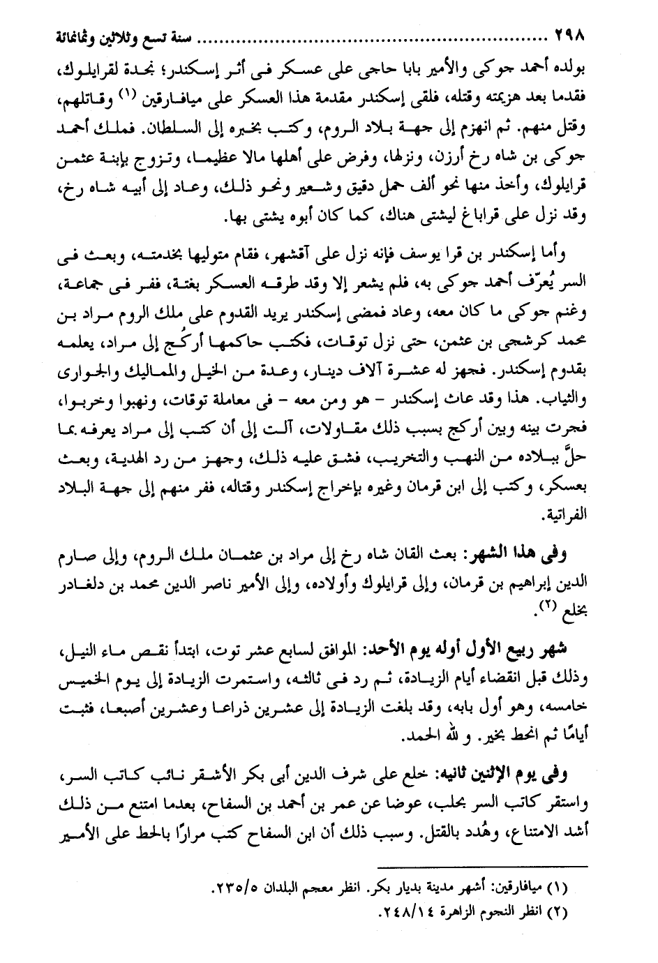 بولده أَحْمد جوكي والأمير بَابا حاجي على عَسْكَر فِي أثر إسكندر نجدة لقرا يلوك فَقدما بعد هزيمته وَقَتله فلقي اسكندر مُقَدّمَة هَذَا الْعَسْكَر على ميافارقين وَقَاتلهمْ وَقتل مِنْهُم. ثمَّ انهزم إِلَى جِهَة بِلَاد الرّوم وَكتب بِخَبَرِهِ إِلَى السُّلْطَان. فَملك أَحْمد جوكي بن شاه رخ أرزن ونزلها وَفرض على أَهلهَا مَالا عَظِيما وَتزَوج بابنة عُثْمَان قرا يلوك وَأخذ مِنْهَا نَحْو ألف حمل دَقِيق وَشَجر وَنَحْو ذَلِك وَعَاد إِلَى أَبِيه شاه وَأما اسكندر بن قرا يُوسُف فَإِنَّهُ نزل على آقشهر فَقَامَ متوليها بخدمته وَبعث فِي السِّرّ يُعرّف أَحْمد جوكي بِهِ فَلم يشْعر إِلَّا وَقد طرقه الْعَسْكَر بَغْتَة ففر فِي جمَاعَة وغنم جوكي مَا كَانَ مَعَه وَعَاد فَمضى اسكندر يُرِيد الْقدوم على ملك الرّوم مُرَاد بن مُحَمَّد كرشجي بن عُثْمَان حَتَّى نزل توقات فَكتب حاكمها أركُج إِلَى مُرَاد يُعلمهُ بقدوم اسكندر. فَجهز لَهُ عشرَة آلَاف دِينَار وعدة من الْخَيل والمماليك والجواري وَالثيَاب. هَذَا وَقد عاث اسكندر - هُوَ وَمن مَعَه - فِي مُعَاملَة توقات ونهبوا وخربوا فجرت بَينه وَبَين أركج بِسَبَب ذَلِك مقاولات آلت إِلَى أَن كتب إِلَى مُرَاد يعرفهُ بِمَا حلَّ ببلاده من النهب والتخريب فشق عَلَيْهِ ذَلِك وجهز من رد الْهَدِيَّة وَبعث بعسكر وَكتب إِلَى ابْن قرمان وَغَيره بِإِخْرَاج اسكندر وقتاله ففر مِنْهُم إِلَى جِهَة الْبِلَاد الفراتية. وَفِي هَذَا الشَّهْر: بعث القان شاه رخ إِلَى مُرَاد بن عُثْمَان ملك الرّوم وَإِلَى صارم الدّين إِبْرَاهِيم بن قرمان وَإِلَى قرا يلوك وَأَوْلَاده وَإِلَى الْأَمِير نَاصِر الدّين مُحَمَّد بن دلغادر بخلع. شهر ربيع الأول أَوله يَوْم الْأَحَد: الْمُوَافق لسابع عشر توت ابْتَدَأَ نقص مَاء النّيل وَذَلِكَ قبل انْقِضَاء أَيَّام الزِّيَادَة ثمَّ رد فِي ثالثه واستمرت الزِّيَادَة إِلَى يَوْم الْخَمِيس خامسه وَهُوَ أول بَابه وَقد بلغت الزِّيَادَة إِلَى عشْرين ذِرَاعا وَعشْرين إصبعاً فَثَبت أَيَّامًا ثمَّ انحط بِخَير. وَللَّه الْحَمد. وَفِي يَوْم الِاثْنَيْنِ ثَانِيه: خلع على شرف الدّين أبي بكر الْأَشْقَر نَائِب كَاتب السِّرّ وَاسْتقر كَاتب السِّرّ بحلب عوضا عَن عمر بن أَحْمد بن السفاح بعد مَا امْتنع من ذَلِك أَشد الِامْتِنَاع وهُدد بِالْقَتْلِ. وَسبب ذَلِك أَن ابْن السفاح كتب مرَارًا بالحط على الْأَمِير