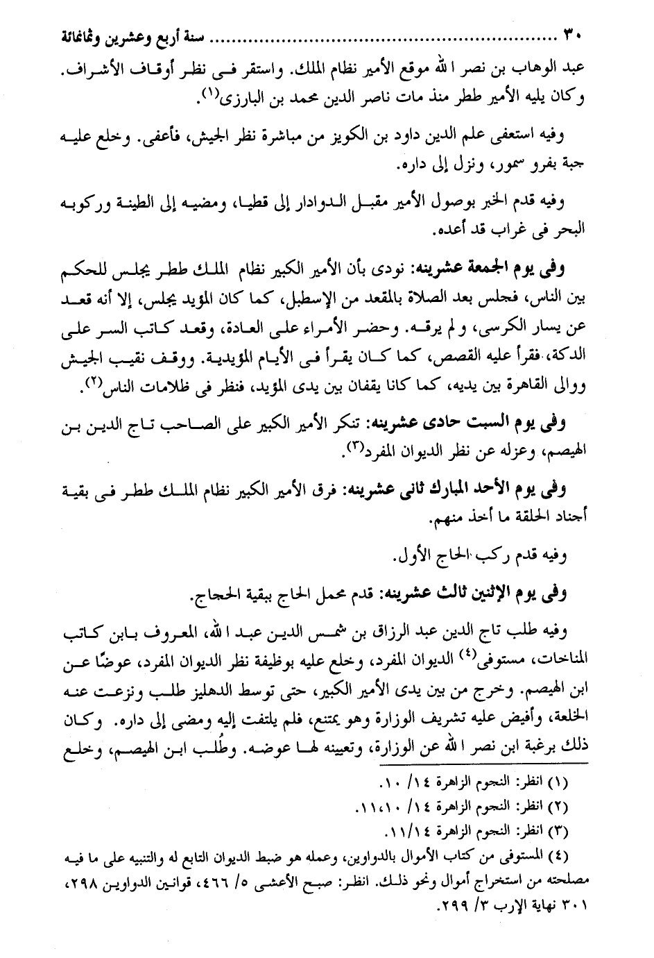 عبد الْوَهَّاب بن نصر الله موقع الْأَمِير نظام الْملك. وَاسْتقر فِي نظر أوقاف الْأَشْرَاف. كَانَ يَلِيهِ الْأَمِير ططر مُنْذُ مَاتَ نَاصِر الدّين مُحَمَّد بن الْبَارِزِيّ. وَفِيه استعفي علم الدّين دَاوُد بن الكويز من مُبَاشرَة نظر الْجَيْش فأعفي. وخلع عَلَيْهِ جُبَّة بِفَرْوٍ سمور وَنزل إِلَى دَاره. وَفِيه قدم الْخَبَر بوصول الْأَمِير مقبل الدوادار إِلَى قطيا ومضيه إِلَى الطينة وركوبه الْبَحْر فِي غراب قد أعده. وَفِي يَوْم الْجُمُعَة عشرينه: نُودي بِأَن الْأَمِير الْكَبِير نظام الْملك ططر يجلس للْحكم بَين النَّاس فَجَلَسَ بعد الصَّلَاة بالمقعد من الاصطبل كَمَا كَانَ الْمُؤَيد يجلس إِلَّا أَنه قعد عَن يسَار الْكُرْسِيّ وَلم يرقه. وَحضر الْأُمَرَاء على الْعَادة وَقعد كَاتب السِّرّ على الدكة فَقَرَأَ عَلَيْهِ الْقَصَص كَمَا كَانَ يقْرَأ فِي الْأَيَّام المؤيدية. ووقف نقيب الْجَيْش وَالِي الْقَاهِرَة بَين يَدَيْهِ كَمَا كَانَا يقفان بَين يَدي الْمُؤَيد فَنظر فِي ظلامات النَّاس. وَفِي يَوْم السبت حادي عشرينه: تنكر الْأَمِير الْكَبِير على الصاحب تَاج الدّين بن الهيصم وعزله وَفِي يَوْم الْأَحَد الْمُبَارك ثَانِي عشرينه: فرق الْأَمِير الْكَبِير نظام الْملك ططر فِي بَقِيَّة أجناد الْحلقَة مَا أَخذ مِنْهُم. وَفِيه قدم ركب الْحَاج الأول. وَفِي يَوْم الِاثْنَيْنِ ثَالِث عشرينه: قدم محمل الْحَاج بِبَقِيَّة الْحجَّاج. وَفِيه طلب تَاج الدّين عبد الرَّزَّاق بن شمس الدّين عبد الله الْمَعْرُوف بِابْن كَاتب المناخات مُسْتَوْفِي الدِّيوَان الْمُفْرد وخلع عَلَيْهِ بوظيفة نظر الدِّيوَان الْمُفْرد عوضا عَن ابْن الهيصم. وَخرج من بَين يَدي الْأَمِير الْكَبِير حَتَّى توَسط الدهليز طلب ونزعت عَنهُ الخلعة وأفيض عَلَيْهِ تشريف الوزارة وَهُوَ يمْتَنع فَلم يلْتَفت إِلَيْهِ وَمضى إِلَيْهِ فِي دَاره. وَكَانَ ذَلِك برغبة ابْن نصر الله عَن الوزارة وتعيينه لَهَا عوضه. وَطلب ابْن الهيصم وخلع