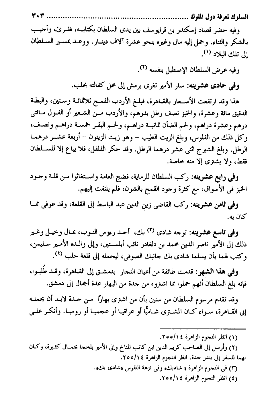 وَفِيه حضر فصاد اسكندر بن قرا يُوسُف بَين يَدي السُّلْطَان بكتابه فقرئ وَأجِيب بالشكر وَالثنَاء. وَحمل إِلَيْهِ مَال وَغَيره بِنَحْوِ عشرَة آلَاف دِينَار. ووعد بمسير السُّلْطَان إِلَى تِلْكَ الْبِلَاد. وَفِيه عرض السُّلْطَان الاصطبل بِنَفسِهِ. وَفِي حادي عشرينه: سَار الْأَمِير تغري برمش إِلَى مَحل كفَالَته بحلب. هَذَا وَقد ارْتَفَعت الأسعار بِالْقَاهِرَةِ فَبلغ الأردب الْقَمْح ثَلَاثمِائَة وَسِتِّينَ والبطة الدَّقِيق مائَة وَعشرَة وَالْخبْز نصف رَطْل بدرهم والأردب من الشّعير أَو الفول مِائَتي دِرْهَم وَعشرَة دَرَاهِم وَلحم الضَّأْن ثَمَانِيَة دَرَاهِم وَلحم الْبَقر خَمْسَة دَرَاهِم وَنصف وكل ذَلِك من الْفُلُوس وَبلغ الزَّيْت الطّيب - وَهُوَ زَيْت الزَّيْتُون - أَرْبَعَة عشر درهما الرطل. وَبلغ الشيرج اثْنَي عشر درهما الرطل. وَقد حكر الفلفل فَلَا يُبَاع إِلَّا للسُّلْطَان فَقَط وَلَا يشترى إِلَّا مِنْهُ خَاصَّة. وَفِي رَابِع عشرينه: ركب السُّلْطَان للرماية فَضَجَّ الْعَامَّة واستغاثوا من قلَّة وجود الْخبز فِي الْأَسْوَاق مَعَ كَثْرَة وجود الْقَمْح بالشون فَلم يلْتَفت إِلَيْهِم. وَفِي تَاسِع عشرينه: توجه شادي بك أحد رُءُوس النوب بِمَال وخيل وَغير ذَلِك إِلَى الْأَمِير نَاصِر الدّين مُحَمَّد بن دلغادر نَائِب أبلستين وَإِلَى وَالِده الْأَمِير سُلَيْمَان وَكتب لَهما بِأَن يسلما شادي بك جَانِبك الصُّوفِي ليحمله إِلَى قلعة حلب. وَفِي هَذَا الشَّهْر: قدمت طَائِفَة من أَعْيَان التُّجَّار بِدِمَشْق إِلَى الْقَاهِرَة وَقد طُلبوا فَإِنَّهُ بلغ السُّلْطَان أَنهم حملُوا مِمَّا اشتروه من جدة من البهار عدَّة أجمال إِلَى دمشق. وَقد تقدم مرسوم السُّلْطَان من سِنِين بِأَن من اشْترى بهاراً من جدة لَا بُد أَن يحملهُ إِلَى الْقَاهِرَة سَوَاء كَانَ المُشْتَرِي شاميُاً أَو عراقياً أَو عجمياً أَو رومياً. وَأنكر على