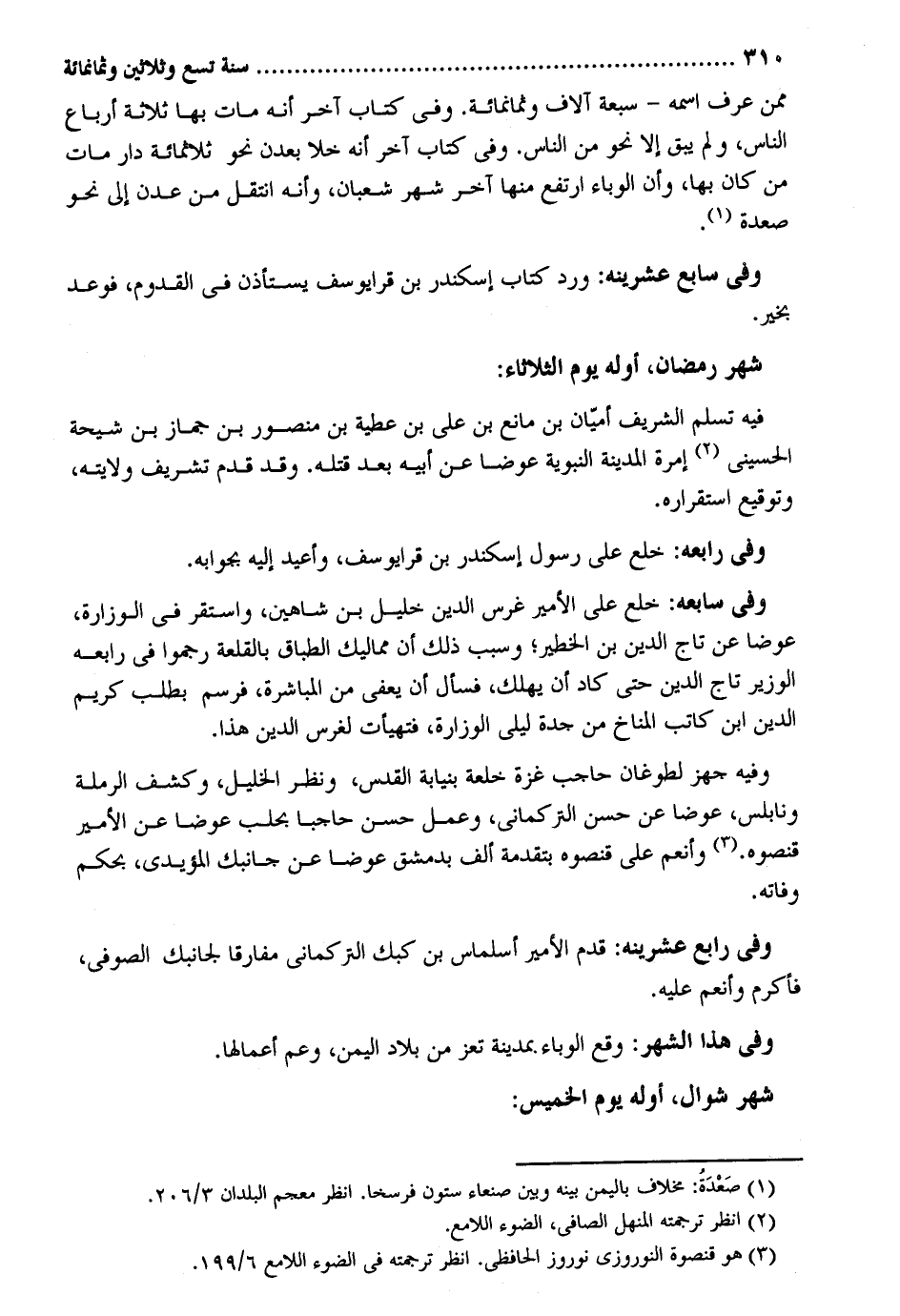مِمَّن عرف اسْمه - سَبْعَة آلَاف وَثَمَانمِائَة. وَفِي كتاب آخر أَنه مَاتَ بهَا ثَلَاثَة أَربَاع النَّاس وَلم يبْق إِلَّا نَحْو من النَّاس. وَفِي كتاب آخر أَنه خلا بعدن نَحْو ثَلَاثمِائَة دَار مَاتَ من كَانَ بهَا وَأَن الوباء ارْتَفع مِنْهَا آخر شهر شعْبَان وَأَنه انْتقل من عدن إِلَى نَحْو صعدة. شهر رَمَضَان أَوله يَوْم الثُّلَاثَاء: فِيهِ تسلم الشريف أميّان بن مَانع بن عَليّ بن عَطِيَّة بن مَنْصُور بن جماز بن شيِحة الحسينيٍ امْرَأَة الْمَدِينَة النَّبَوِيَّة عوضا عَن أَبِيه بعد قَتله. وَقد قدم تشريف ولَايَته وتوقيع استقراره. وَفِي رابعه: خلع على رَسُول اسكندر بن قرا يُوسُف وأعيد إِلَيْهِ بجوابه. وَفِي سابعه: خلع على الْأَمِير غرس الدّين خَلِيل بن شاهين وَاسْتقر فِي الوزارة عوضا عَن تَاج الدّين بن الخطير وَسبب ذَلِك أَن ممالك الطباق بالقلعة رجموا فِي رابعه الْوَزير تَاج الدّين حَتَّى كَاد أَن يهْلك فَسَأَلَ أَن يعفي من الْمُبَاشرَة فرسم بِطَلَب كريم الدّين ابْن كَاتب المناخ من جدة لَيْلَة الوزارة فتهيأت لغرس الدّين هَذَا. وَفِيه جهز لطوغان حَاجِب غَزَّة خلعة بنيابة الْقُدس وَنظر الْخَلِيل وكشف الرملة ونابلس عوضْاً عَن حسن التركماني وَعمل حسن حاجباً بحلب عوضْاً عَن الْأَمِير قنصوه. وأنعم على قنصوه بتقدمة ألف بِدِمَشْق عوضا عَن جَانِبك المؤيدي بِحكم وَفَاته. وَفِي رَابِع عشرينه: قدم الْأَمِير أسلماس بن كبك التركماني مفارقاً جَانِبك الصُّوفِي فَأكْرم وأنعم عَلَيْهِ. وَفِي هَذَا الشَّهْر: وَقع الوباء بِمَدِينَة تعز من بِلَاد الْيمن وَعم أَعمالهَا. شهر شَوَّال، اوله يَوْم الْخَمِيس: