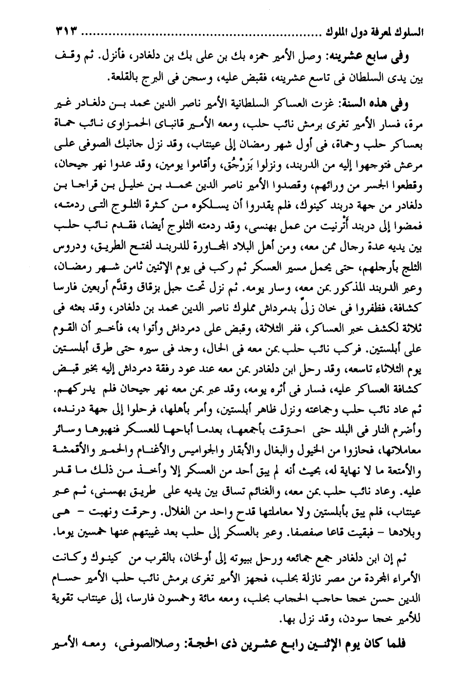 وَفِي سَابِع عشرينه: وصل الْأَمِير حمزه بك بن عَليّ بك بن دلغادر فَأنْزل. ثمَّ وقف بَين يَدي السُّلْطَان فِي تَاسِع عشرينه فَقبض عَلَيْهِ وسجن فِي البرج بالقلعة. وَفِي هَذِه السّنة: غزت العساكر السُّلْطَانِيَّة الْأَمِير نَاصِر الدّين مُحَمَّد بن دلغادر غير مرّة فَسَار الْأَمِير تغري برمش نَائِب حلب وَمَعَهُ الْأَمِير قانباي الحمزاوى نَائِب حماة بعساكر حلب وحماة فِي أول شهر رَمَضَان إِلَى عينتاب وَقد نزل جَانِبك الصُّوفِي على مرعش فتوجهوا إِلَيْهِ من الدربند ونزلوا بَزرْجُق وَأَقَامُوا يَوْمَيْنِ وَقد عدوا نهر جيحان وَقَطعُوا الجسر من ورائهم وقصدوا الْأَمِير نَاصِر الدّين مُحَمَّد بن خَلِيل بن قراجا بن دلغادر من جِهَة دربند كينوك فَلم يقدروا أَن يسلكوه من كَثْرَة الثلوج الَّتِي ردمته فْمضوا إِلَى دربند أَترنيت من عمل بهنسي وَقد ردمته الثلوج أَيْضا فَقدم نَائِب حلب بَين يَدَيْهِ عدَّة رجال مِمَّن مَعَه وَمن أهل الْبِلَاد الْمُجَاورَة للدربند لفتح الطَّرِيق ودروس الثَّلج بأرجلهم حَتَّى يحمل مسير الْعَسْكَر ثمَّ ركب فِي يَوْم الِاثْنَيْنِ ثامن شهر رَمَضَان وَعبر الدربند الْمَذْكُور بِمن مَعَه وَسَار يَوْمه. ثمَّ نزل تَحت جبل بزقاق وقدَّم أَرْبَعِينَ فَارس كشافة فظفروا فِي خَان زليِّ بدمرداش مَمْلُوك نَاصِر الدّين مُحَمَّد بن دلغادر وَقد بَعثه فِي ثَلَاثَة لكشف خبر العساكر ففر الثَّلَاثَة وَقبض على دمرداش وَأتوا بِهِ فَأخْبر أَن القوه على أبلستين. فَركب نَائِب حلب بِمن مَعَه فِي الْحَال وجد فِي سيره حَتَّى طرق أبلستين يَوْم الثُّلَاثَاء تاسعه وَقد رَحل ابْن دلغادر بِمن مَعَه عِنْد عودة رفْقَة دمرداش إِلَيْهِ بِخَبَر قبض كشافة العساكر عَلَيْهِ فَسَار فِي أَثَره يَوْمه وَقد عبر بِمن مَعَه نهر جيحان فَلم يدركهم ثمَّ عَاد نَائِب حلب وجماعته وَنزل ظَاهر أبلستين وَأمر بِأَهْلِهَا فرحلوا إِلَى جِهَة درنده وأضرم النَّار فِي الْبَلَد حَتَّى احترقت بأجمعها بعد مَا أَبَاحَهَا للعسكر فنهبوها وَسَائِر معاملاتها فحازوا من الْخُيُول وَالْبِغَال والأبقار والجواميس والأغنام وَالْحمير والأقمشة والأمتعة مَا لَا نِهَايَة لَهُ بِحَيْثُ أَنه لم يبْق أحد من الْعَسْكَر إِلَّا وَأخذ من ذَلِك مَا قدر عَلَيْهِ. وَعَاد نَائِب حلب بِمن مَعَه والغنائم تساق بَين يَدَيْهِ على طَرِيق بهسني ثمَّ عَم عينتاب فَلم يبْق بأبلستين وَلَا معاملتها قدح وَاحِد من الغلال. وَحرقت ونهبت - هِيَ وبلادها - فَبَقيت قاعاً صفصفاً. وَعبر بالعسكر إِلَى حلب بعد غيبتهم عَنْهَا خمسين يَوْمًا ثمَّ إِن ابْن دلغادر جمع جمائعه ورحل ببيوته إِلَى أولخان بِالْقربِ من كينوك وَكَانَت الْأُمَرَاء الْمُجَرَّدَة من مصر نازلة بحلب فَجهز الْأَمِير تغري برمش نَائِب حلب الْأَمِير حسام الدّين حسن خجا حاحب الْحجاب بحلب وَمَعَهُ مائَة وَخَمْسُونَ فَارِسًا إِلَى عينتاب تَقْوِيَة للأمير خجا سودن وَقد نزل بهَا. فَلَمَّا كَانَ يَوْم الِاثْنَيْنِ رَابِع عشْرين ذِي الْحجَّة: وصل الصُّوفِي وَمَعَهُ الْأَمِير