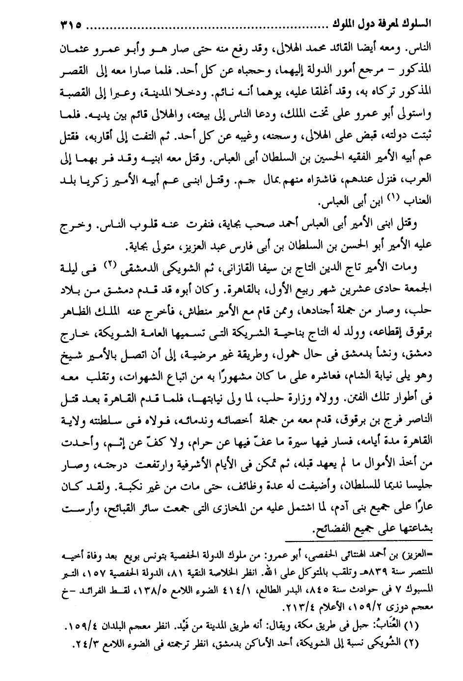 النَّاس. وَمَعَهُ أَيْضا الْقَائِد مُحَمَّد الْهِلَالِي وَقد رفع مِنْهُ حَتَّى صَار هُوَ وَأَبُو عَمْرو عُثْمَان الْمَذْكُور - مرجع أُمُور الدولة إِلَيْهِمَا وحجباه عَن كل أحد. فَلَمَّا صَارا مَعَه إِلَى الْقصر الْمَذْكُور تركاه بِهِ وَقد أغلقا عَلَيْهِ يوهما أَنه نَائِم. ودخلا الْمَدِينَة وعبرا إِلَى القصبة وَاسْتولى أَبُو عَمْرو على تخت الْملك ودعا النَّاس إِلَى بيعَته والهلالي قَائِم بَين يَدَيْهِ. فَلَمَّا ثبتَتْ دولته قبض على الْهِلَالِي وسجنه وغيبه عَن كل أحد. ثمَّ الْتفت إِلَى أَقَاربه فَقتل عَم أَبِيه الْأَمِير الْفَقِيه الْحُسَيْن بن السُّلْطَان أبي الْعَبَّاس. وَقتل مَعَه ابنيه وَقد فر بهما إِلَى الْعَرَب فَنزل عِنْدهم فَاشْتَرَاهُ وَقتل ابْني الْأَمِير أبي الْعَبَّاس أَحْمد صَاحب بجاية فنفرت عَنهُ قُلُوب النَّاس. وَخرج عَلَيْهِ الْأَمِير أَبُو الْحسن بن السُّلْطَان بن أبي فَارس عبد الْعَزِيز مُتَوَلِّي بجاية. وَمَات الْأَمِير تَاج الدّين التَّاج بن سَيْفا القازاني ثمَّ الشويكي الدِّمَشْقِي فِي لَيْلَة الْجُمُعَة حادي عشْرين شهر ربيع الأول بِالْقَاهِرَةِ. وَكَانَ أَبوهُ قد قدم دمشق من بِلَاد حلب وَصَارَ من جملَة أجنادها وَمِمَّنْ قَامَ مَعَ الْأَمِير منطاش فَأخْرج عَنهُ الْملك الظَّاهِر برقوق إقطاعه وَولد لَهُ التَّاج بِنَاحِيَة الشريكة الَّتِي تسميها الْعَامَّة الشويكة خَارج دمشق وَنَشَأ بِدِمَشْق فِي حَال خمول وَطَرِيقَة غير مرضية إِلَى أَن اتَّصل بالأمير شيخ وَهُوَ يَلِي نِيَابَة الشَّام فعاشره على مَا كَانَ مَشْهُورا بِهِ من أَتبَاع الشَّهَوَات وتقلب مَعَه فِي أطوار تِلْكَ الْفِتَن. وولاه وزارة حلب لما ولي نيابتها فَلَمَّا قدم الْقَاهِرَة بعد قتل النَّاصِر فرج بن برقوق قدم مَعَه من جملَة أخصائه وندمائه فولاه فِي سلطنته ولَايَة الْقَاهِرَة مُدَّة أَيَّامه فَسَار فِيهَا سيرة مَا عف فِيهَا عَن حرَام وَلَا كف عَن إِثْم وأحدث من أَخذ الْأَمْوَال مَا لم يعْهَد قبله ثمَّ تمكن فِي الْأَيَّام الأشرفية وَارْتَفَعت دَرَجَته وَصَارَ جَلِيسا نديماً للسُّلْطَان وأضيفت لَهُ عدَّة وظائف حَتَّى مَاتَ من غير نكبة. وَلَقَد كَانَ عاراً على جَمِيع بني أَدَم لما اشْتَمَل عَلَيْهِ من المخازي الَّتِي جمعت سَائِر القبائح وأرست بشاعتها على جَمِيع الفضائح.